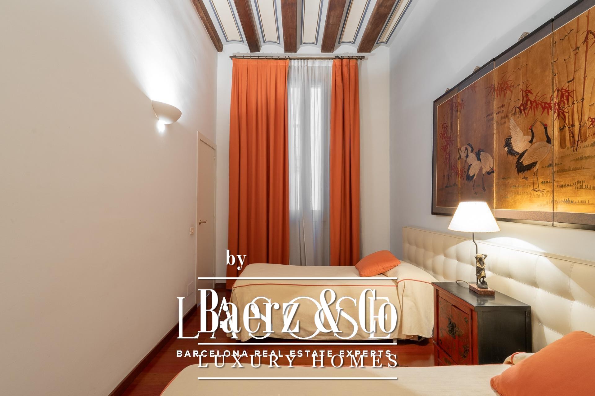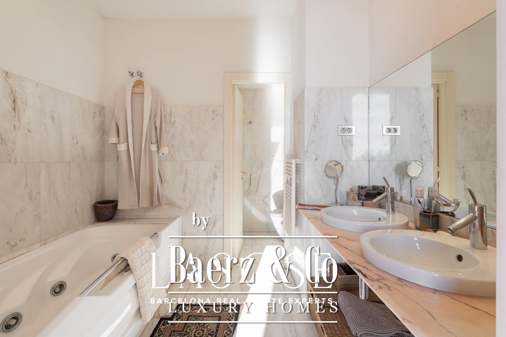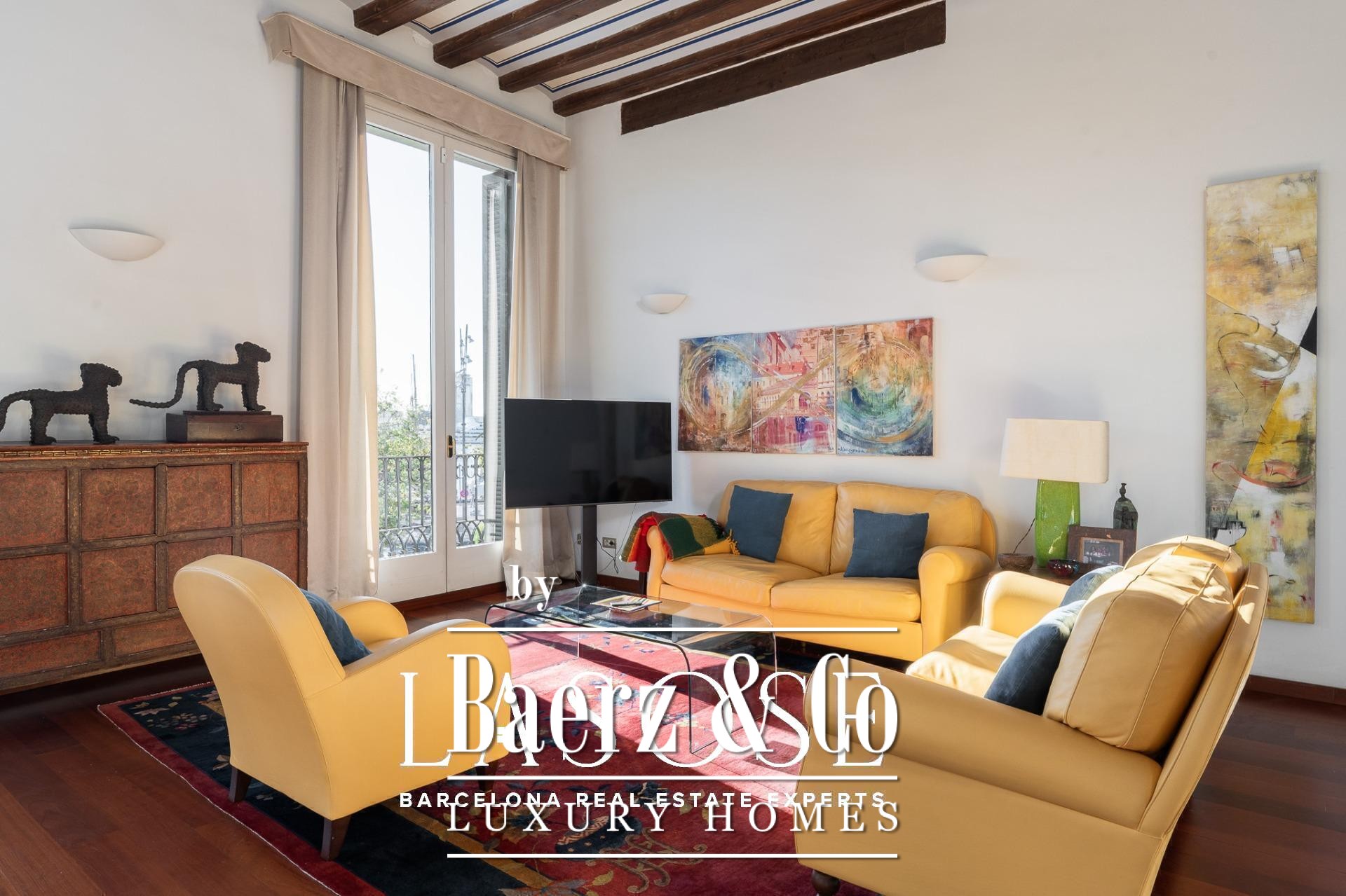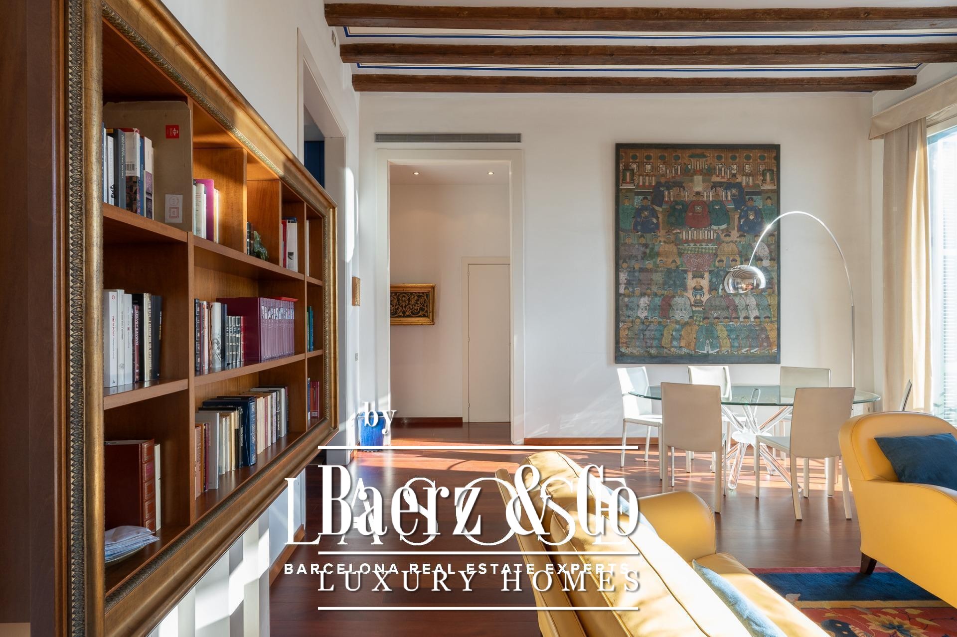 Apartment Barcelona sets its stage within a historic building overlooking the city’s marina. This apartment, spanning 122 m², occupies a distinguished address on Carrer Llauder and presents a rare interplay of heritage and contemporary living. Step inside to a volume defined by 3.8-meter ceilings, exposed wooden beams, and Catalan vaulted ceilings with hand-painted details. Wrought-iron balconies frame the open sea and the greenery of Las Ramblas de Mar, filling each room with Mediterranean light.