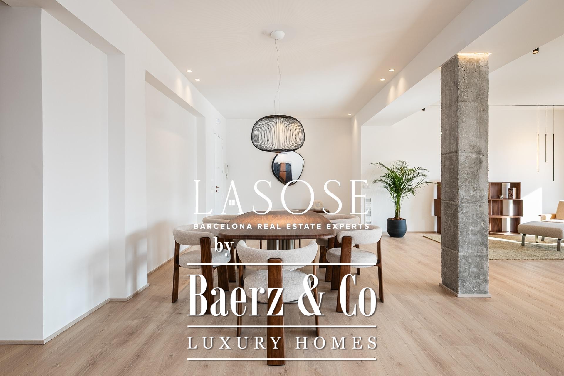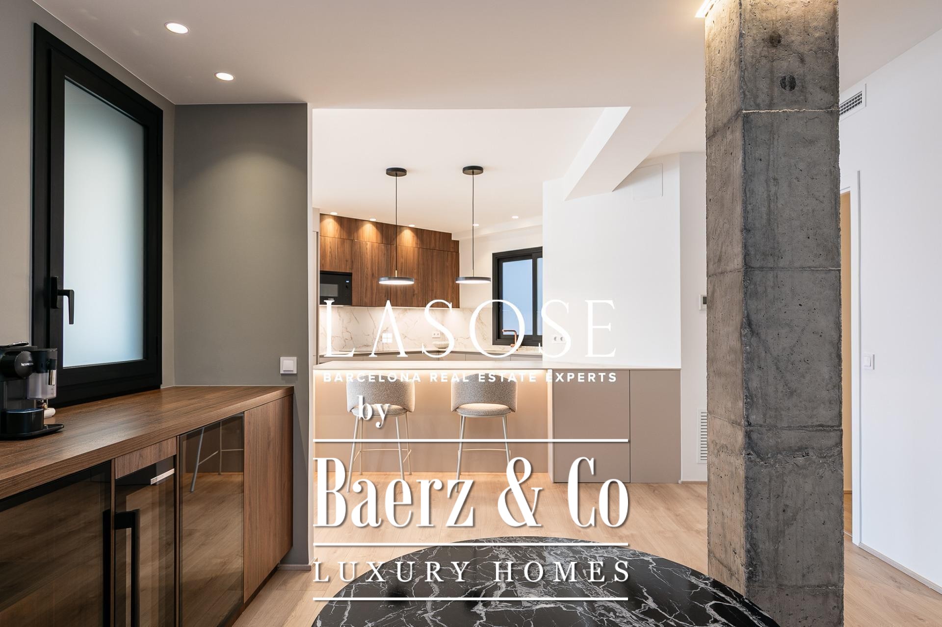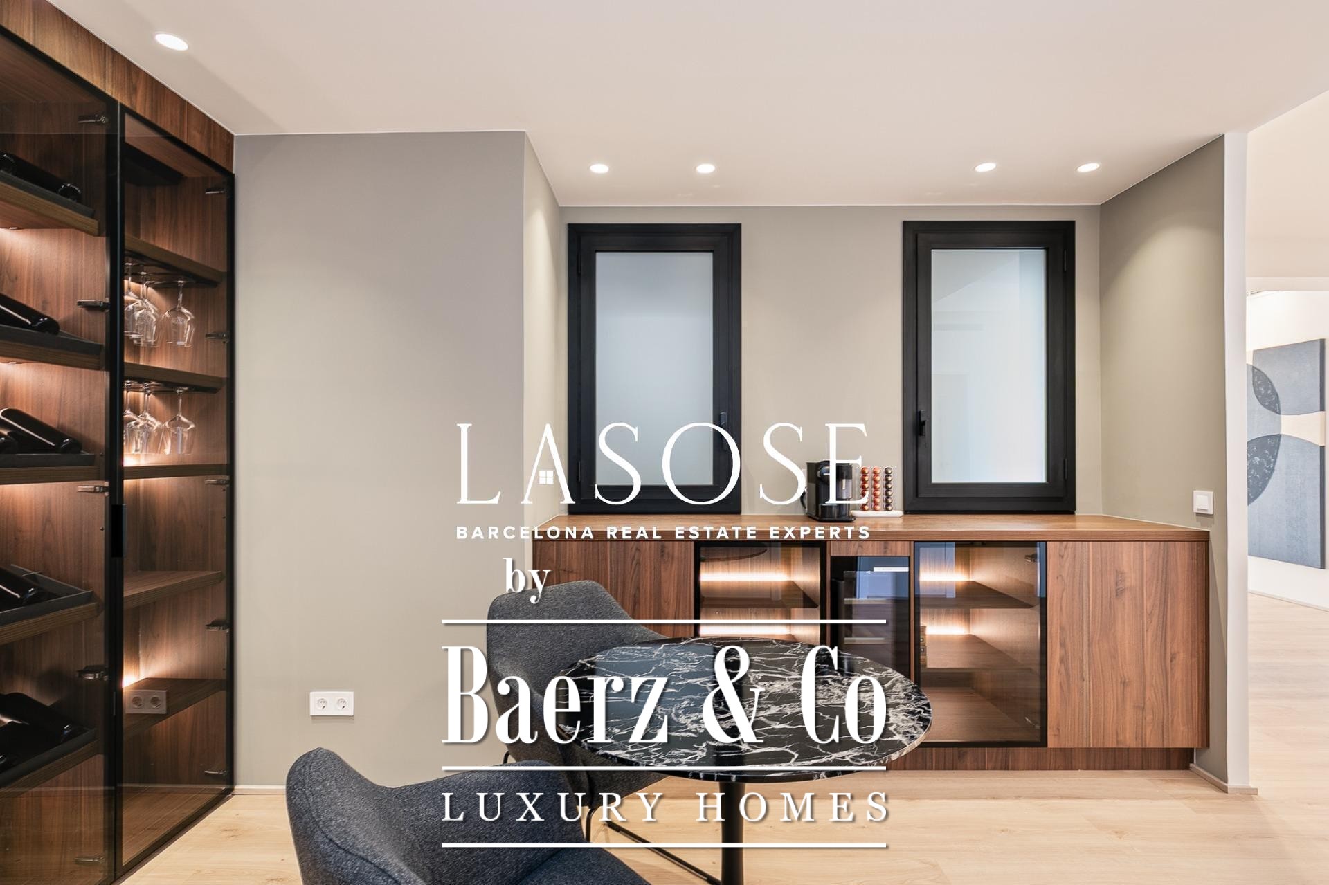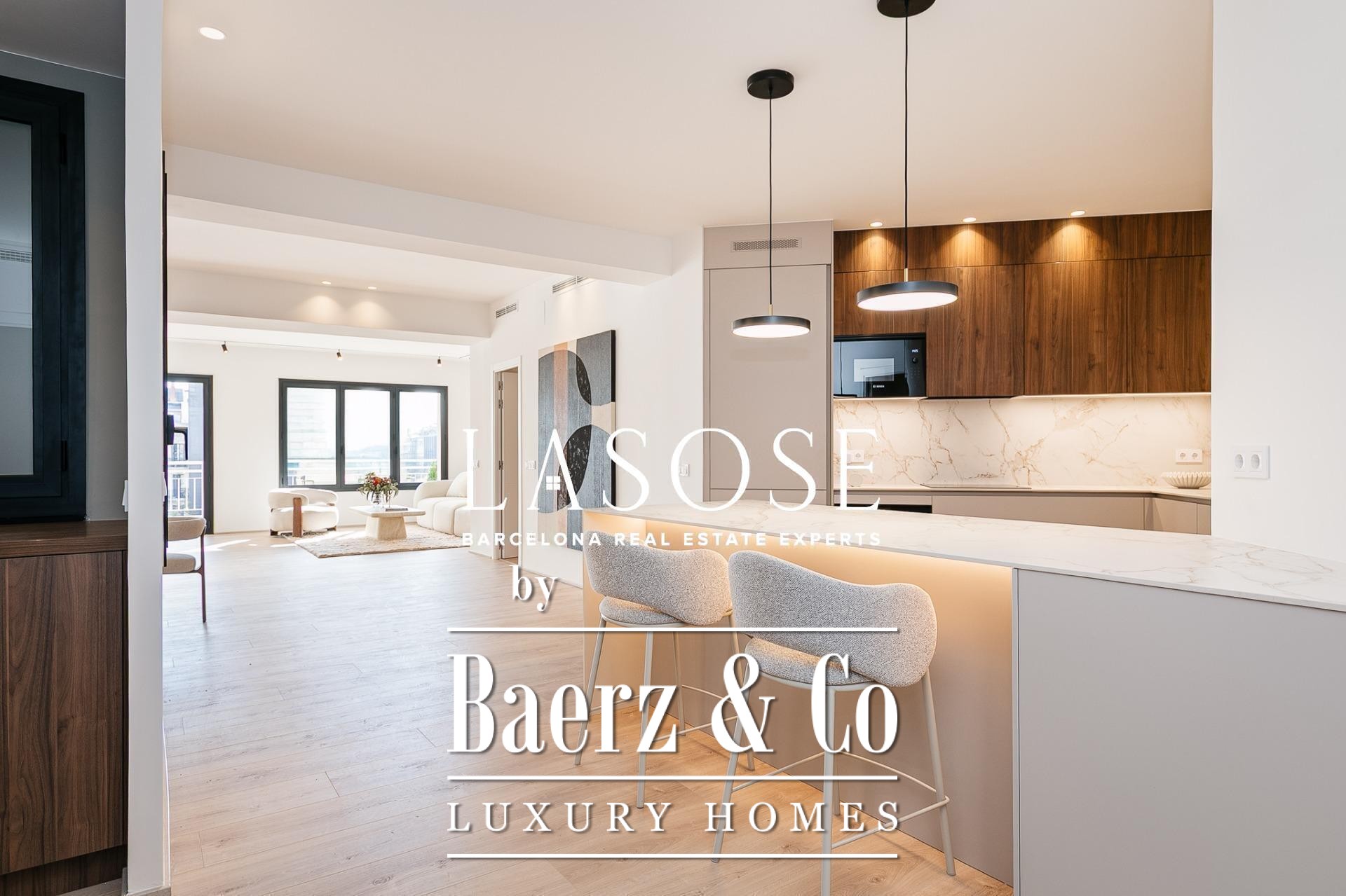 The apartment has undergone a complete refurbishment finished with high-end materials. Light flows in through expansive southeast-facing windows, illuminating generous interior volumes and the open 90 m² living-dining area. Here, doors open onto a panoramic corner terrace overlooking the tree-lined boulevards and Plaça Mossèn Jacint Verdaguer. The kitchen, by Santos and fitted with Bosch appliances, centers around a social island with an integrated wine cellar and coffee zone, complemented by an adjacent pantry room for discreet storage.