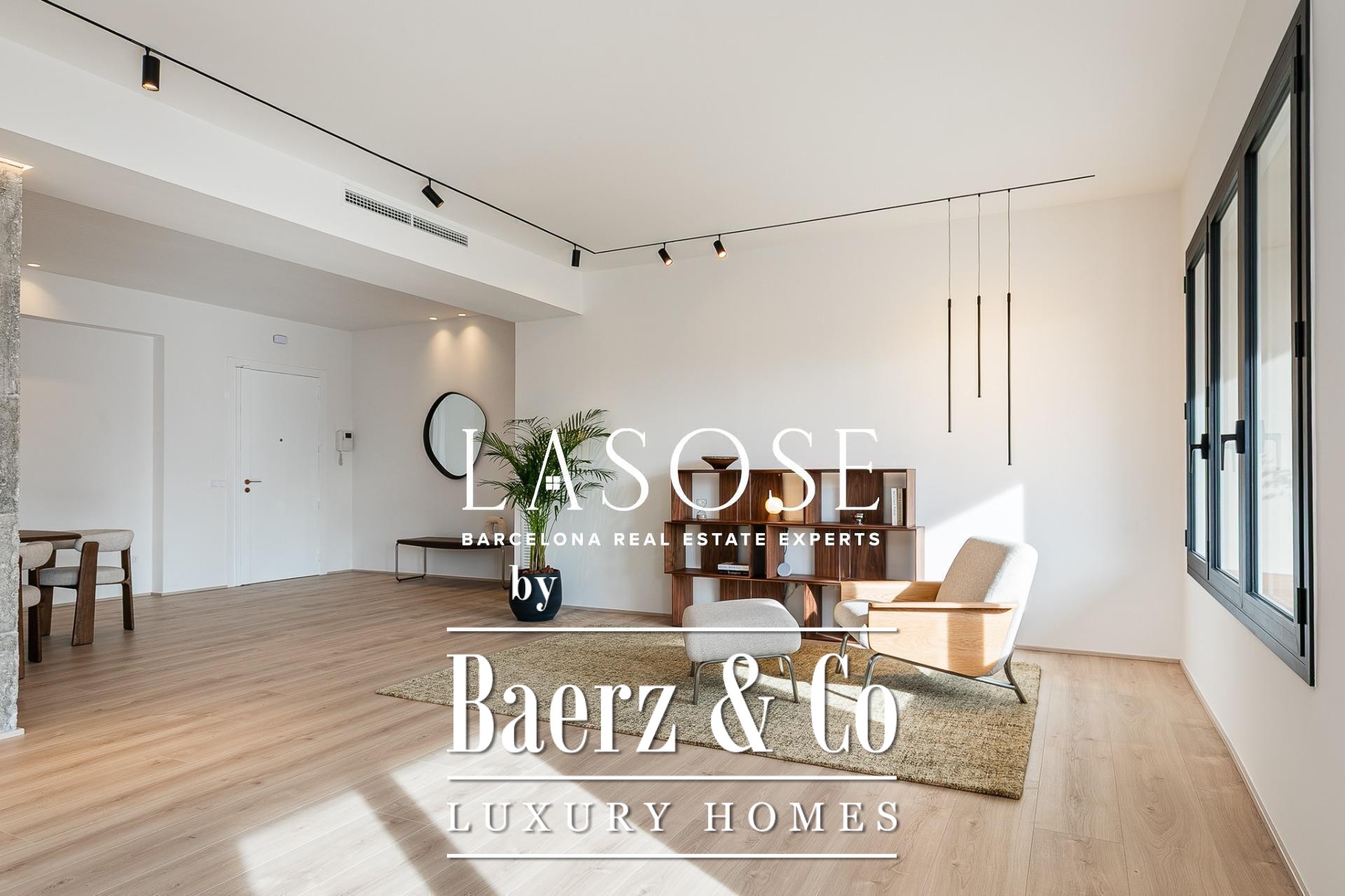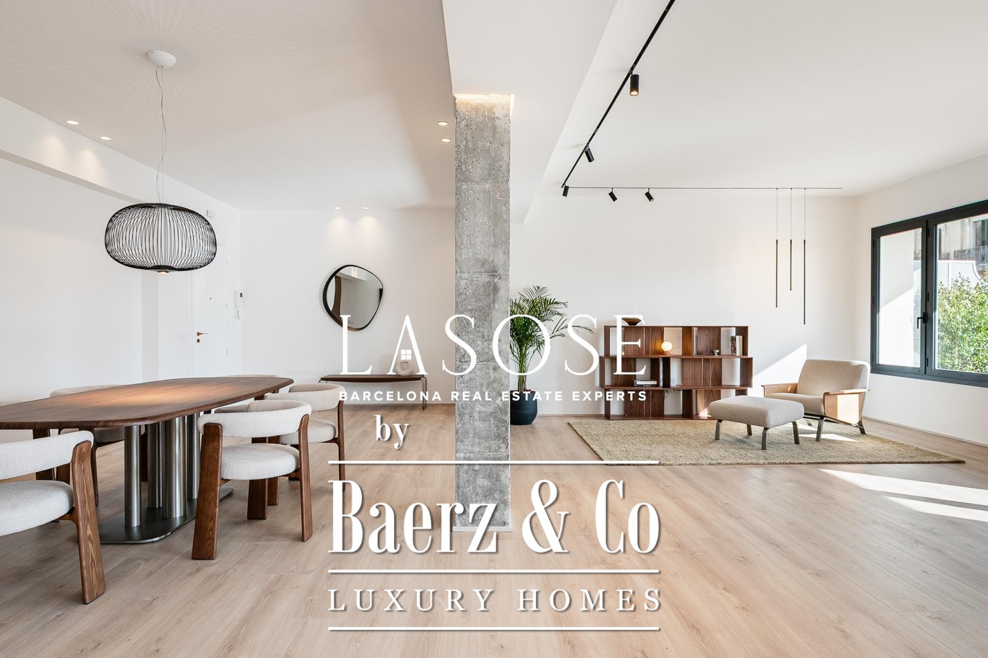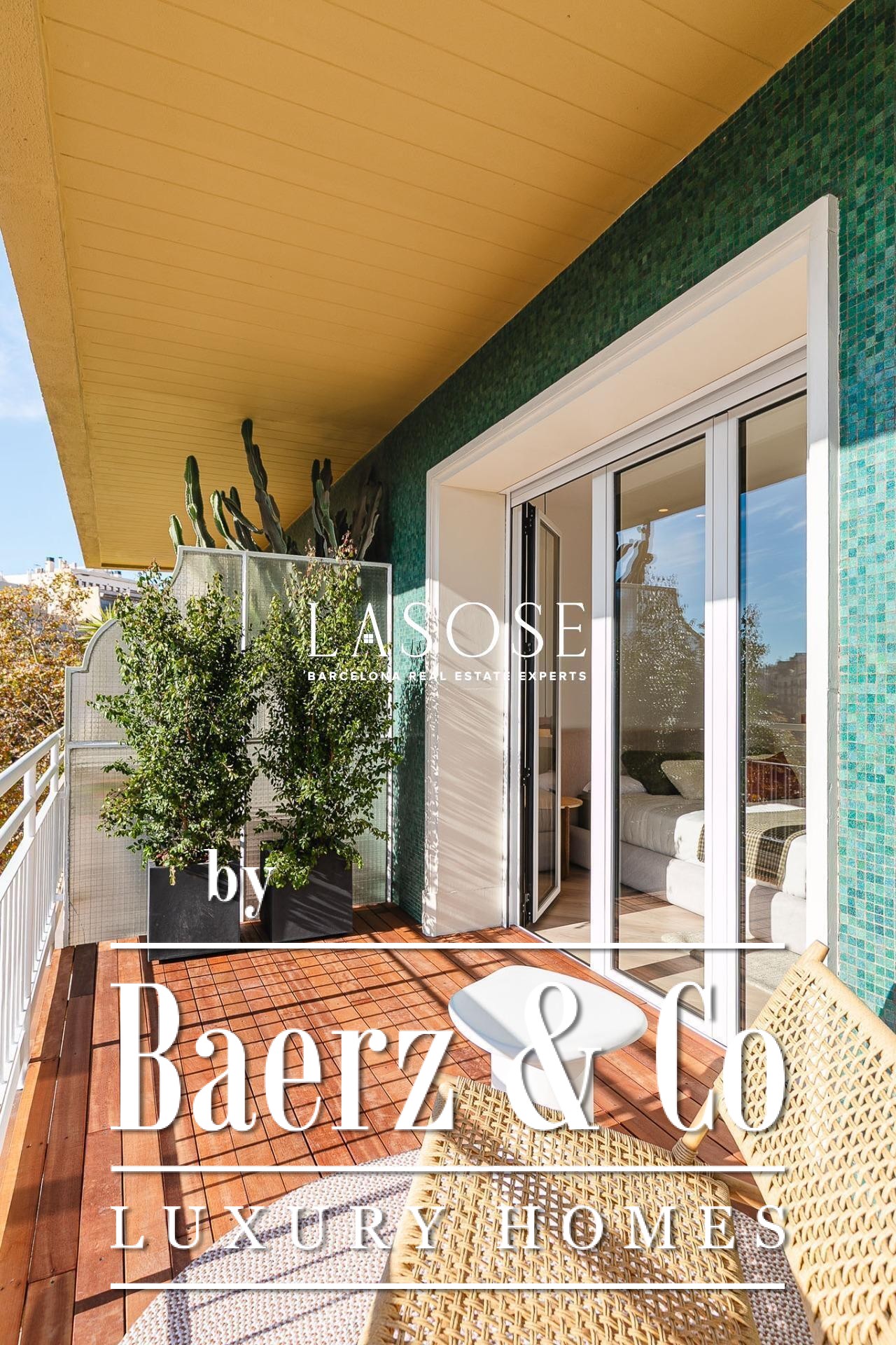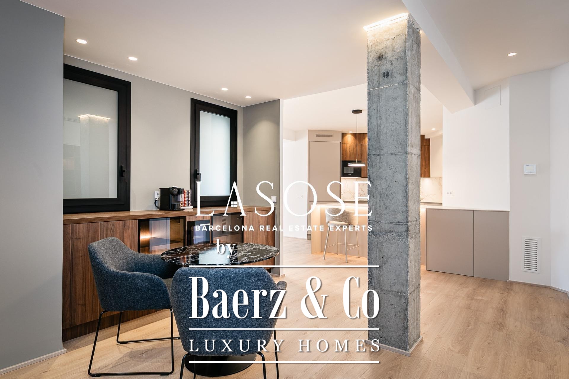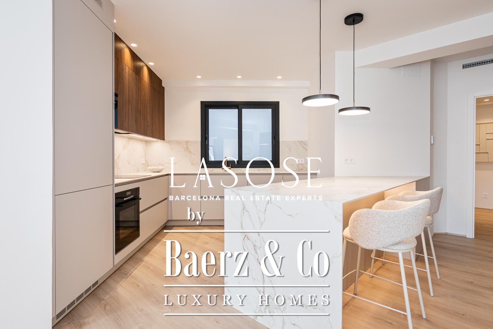 The apartment has undergone a complete refurbishment finished with high-end materials. Light flows in through expansive southeast-facing windows, illuminating generous interior volumes and the open 90 m² living-dining area. Here, doors open onto a panoramic corner terrace overlooking the tree-lined boulevards and Plaça Mossèn Jacint Verdaguer. The kitchen, by Santos and fitted with Bosch appliances, centers around a social island with an integrated wine cellar and coffee zone, complemented by an adjacent pantry room for discreet storage.