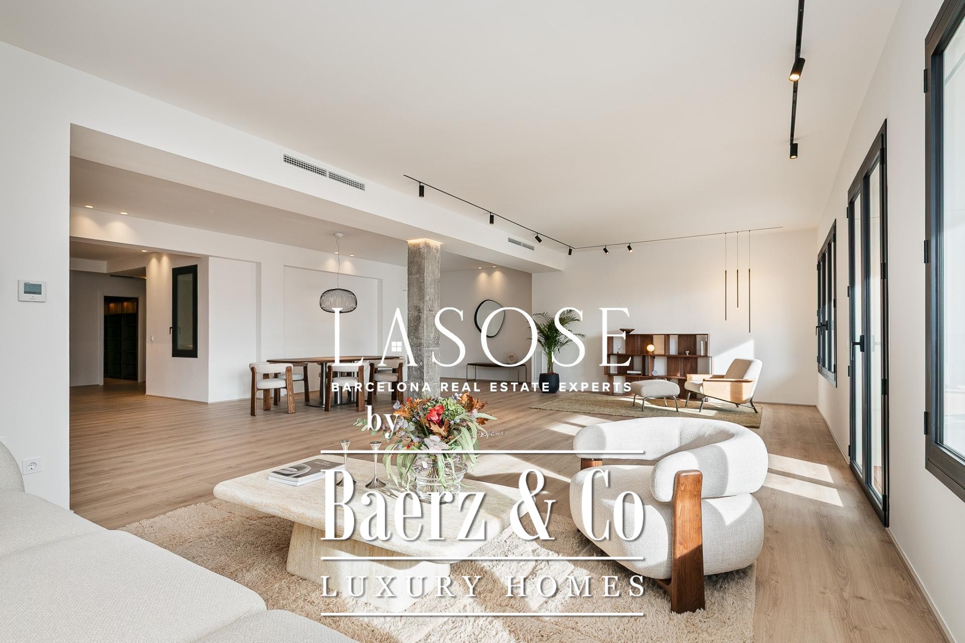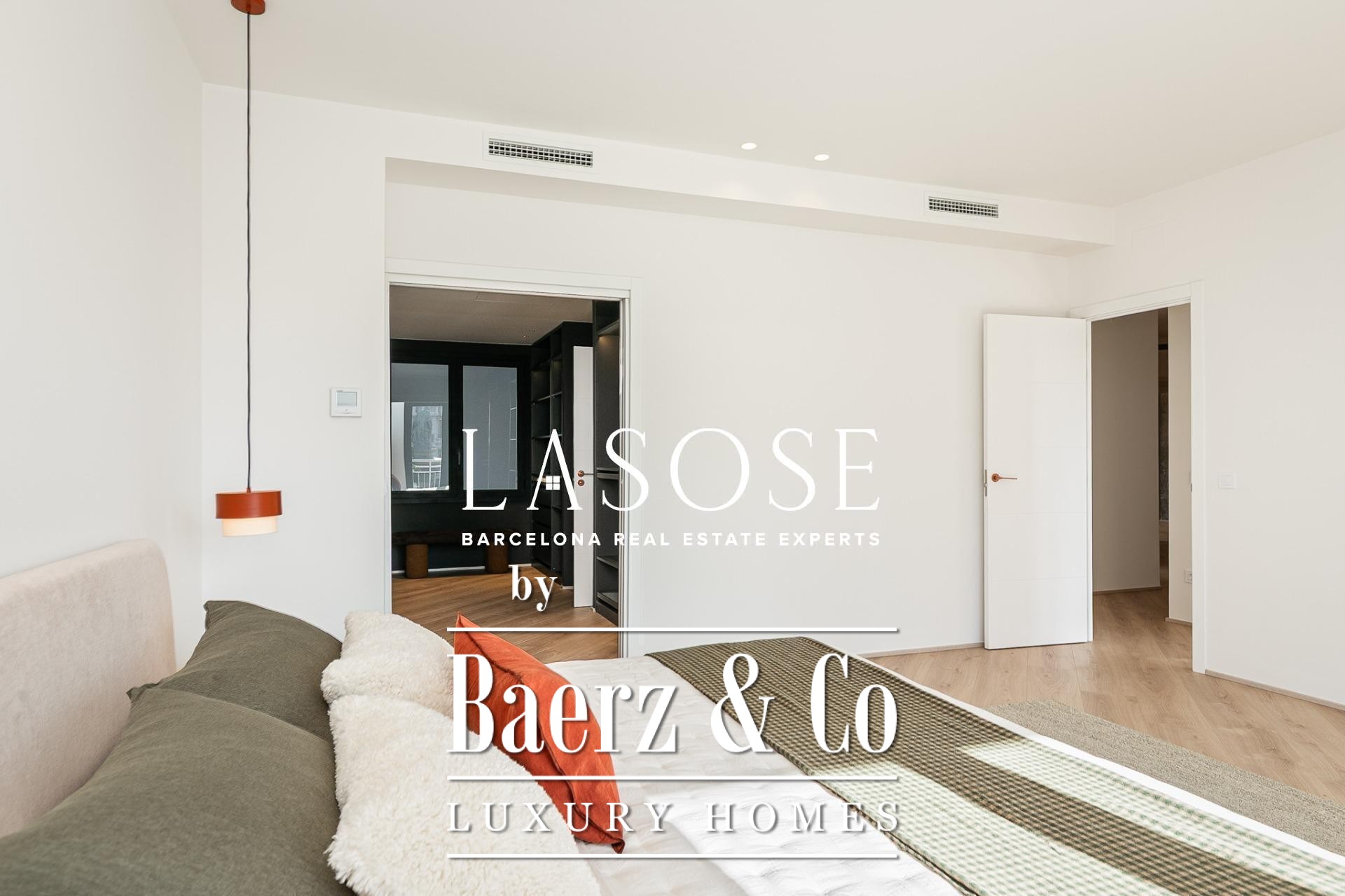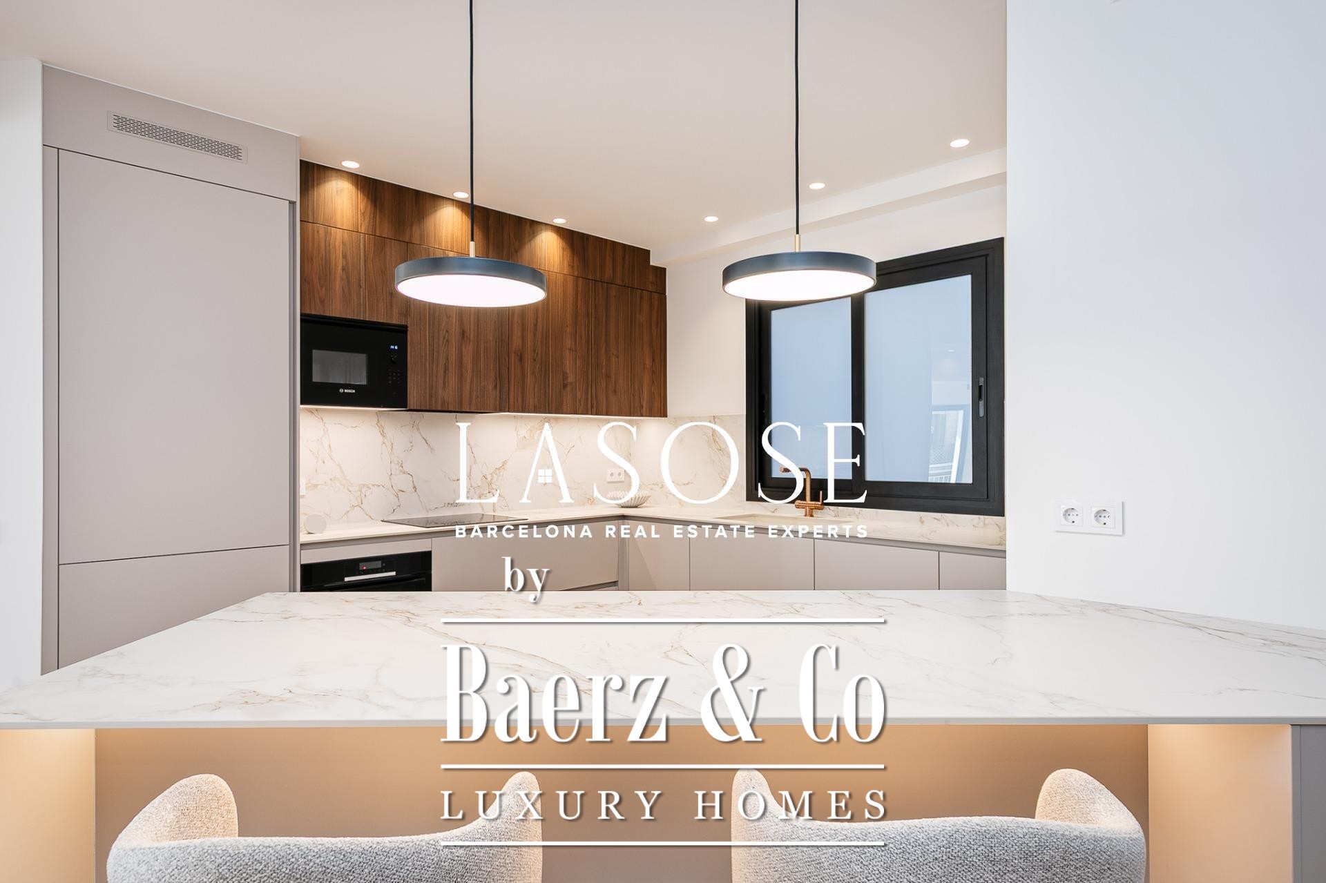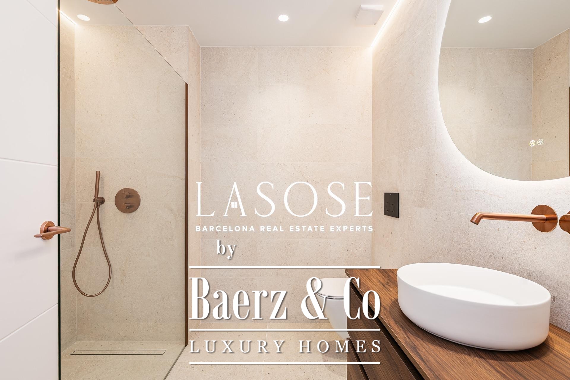 The apartment has undergone a complete refurbishment finished with high-end materials. Light flows in through expansive southeast-facing windows, illuminating generous interior volumes and the open 90 m² living-dining area. Here, doors open onto a panoramic corner terrace overlooking the tree-lined boulevards and Plaça Mossèn Jacint Verdaguer. The kitchen, by Santos and fitted with Bosch appliances, centers around a social island with an integrated wine cellar and coffee zone, complemented by an adjacent pantry room for discreet storage.