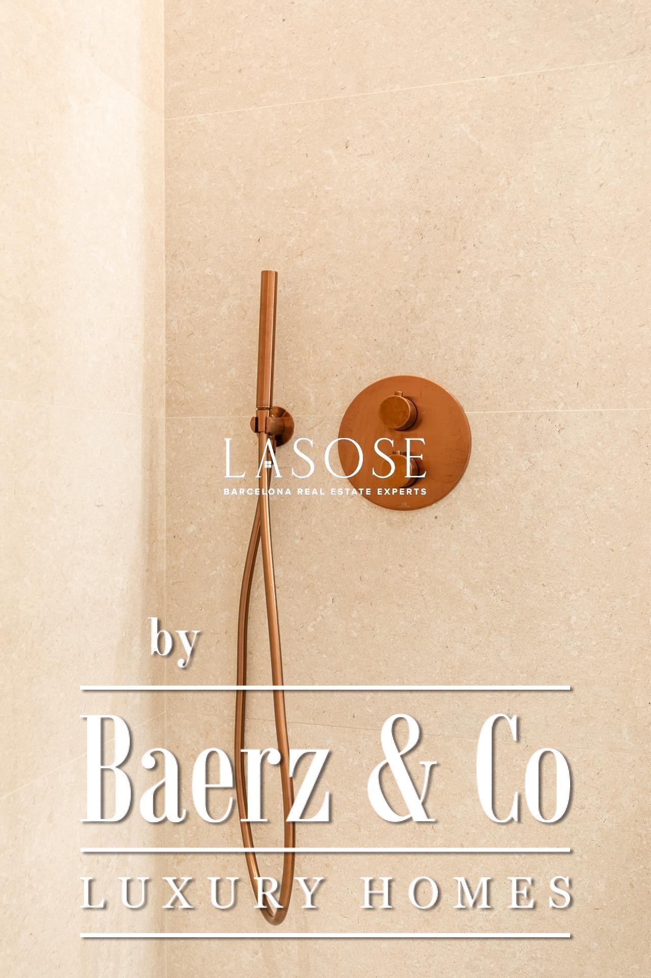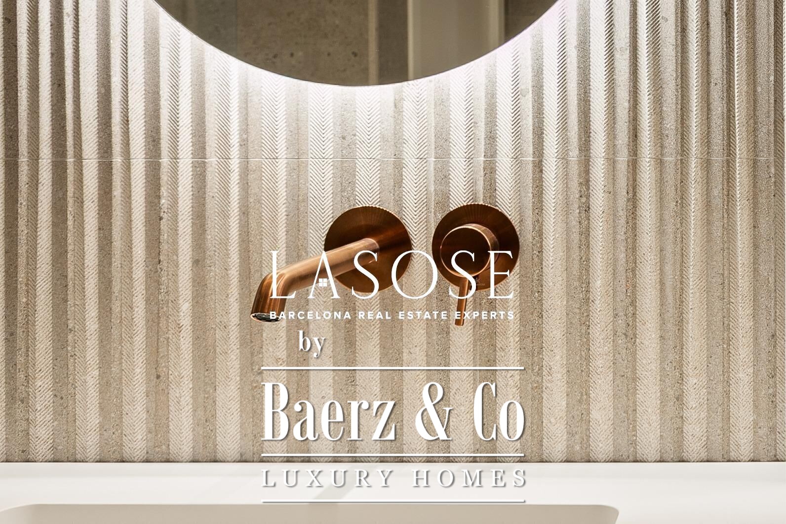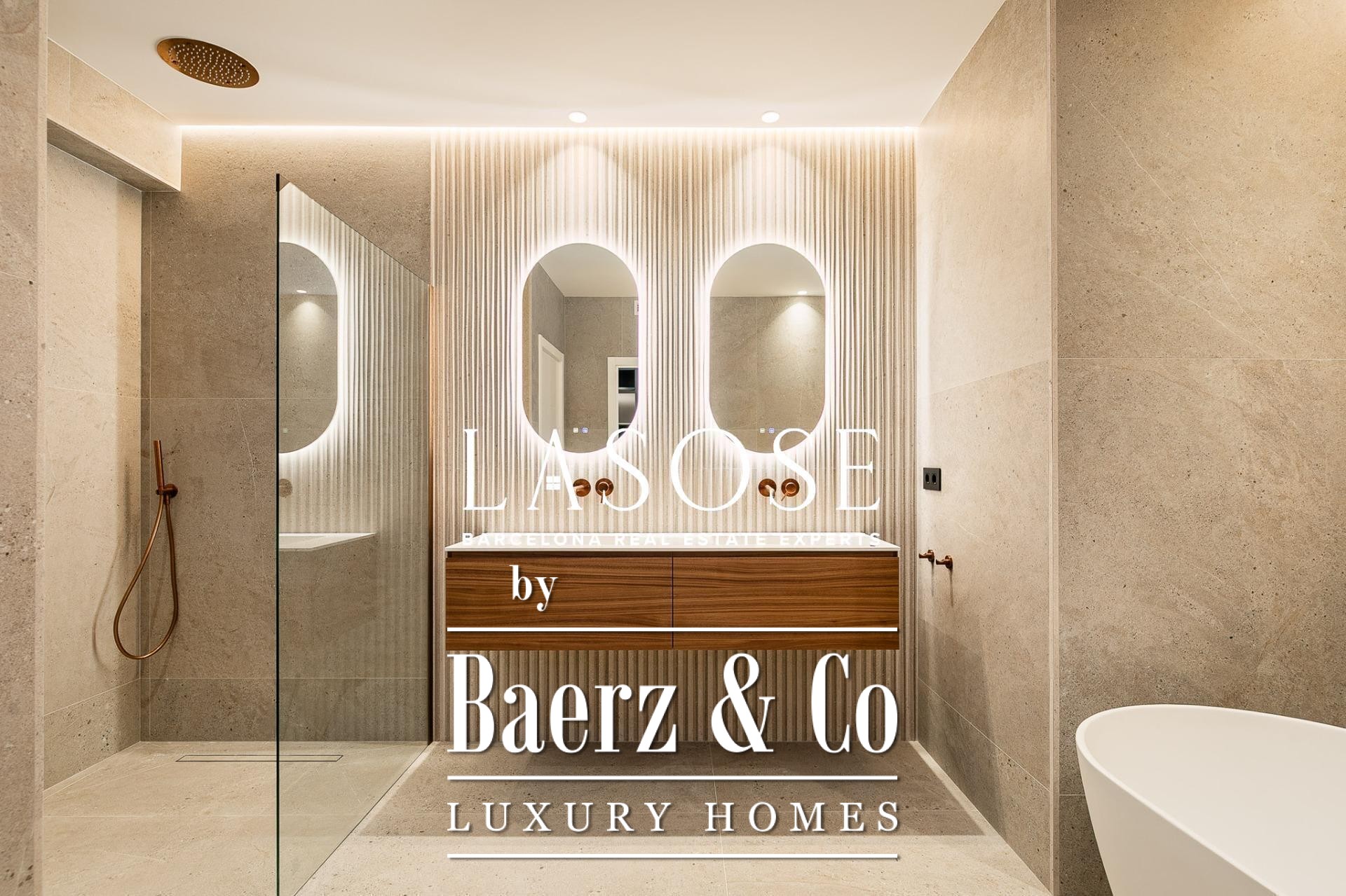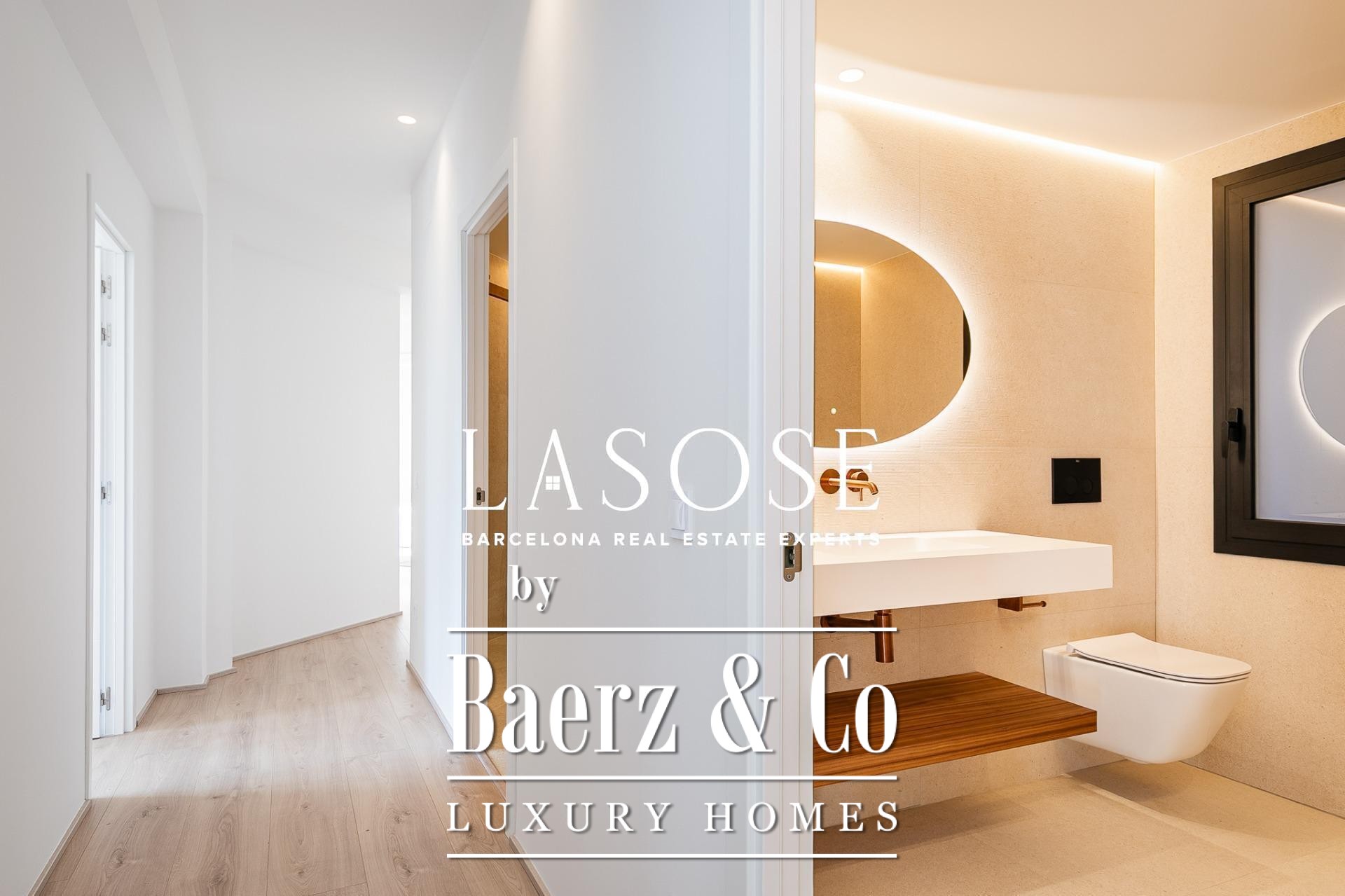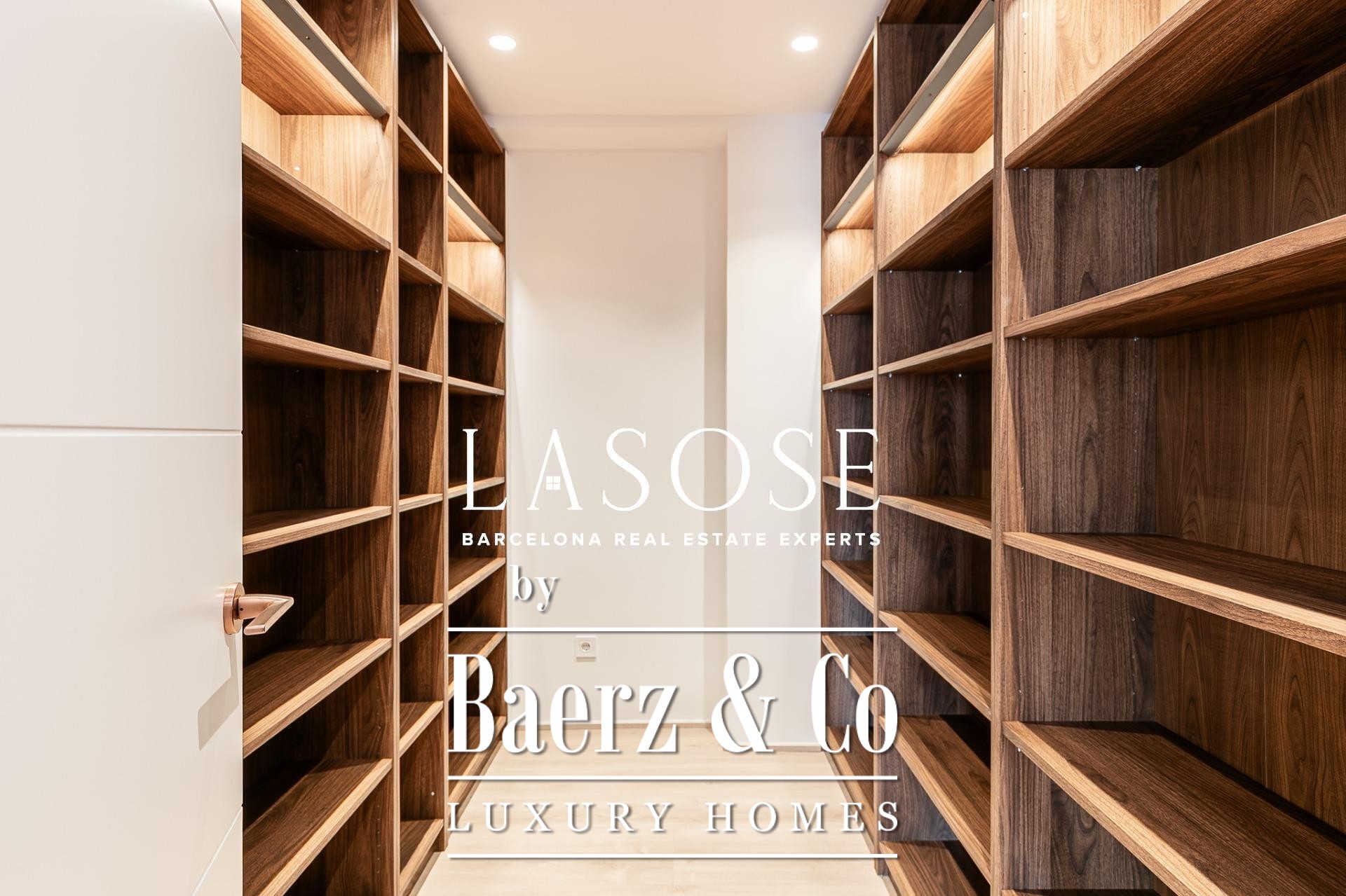 The apartment has undergone a complete refurbishment finished with high-end materials. Light flows in through expansive southeast-facing windows, illuminating generous interior volumes and the open 90 m² living-dining area. Here, doors open onto a panoramic corner terrace overlooking the tree-lined boulevards and Plaça Mossèn Jacint Verdaguer. The kitchen, by Santos and fitted with Bosch appliances, centers around a social island with an integrated wine cellar and coffee zone, complemented by an adjacent pantry room for discreet storage.