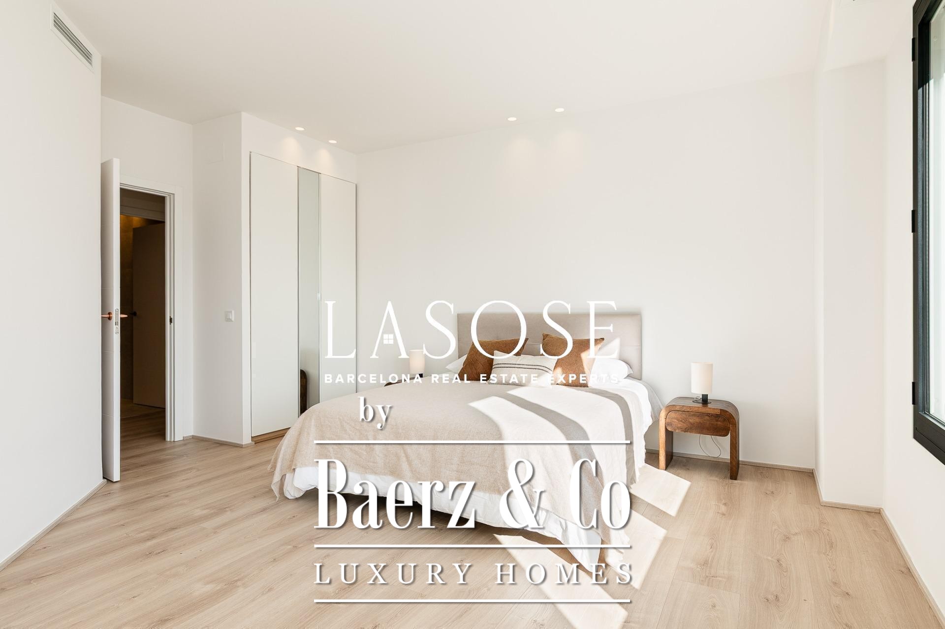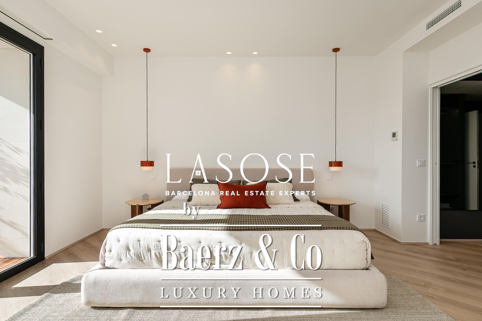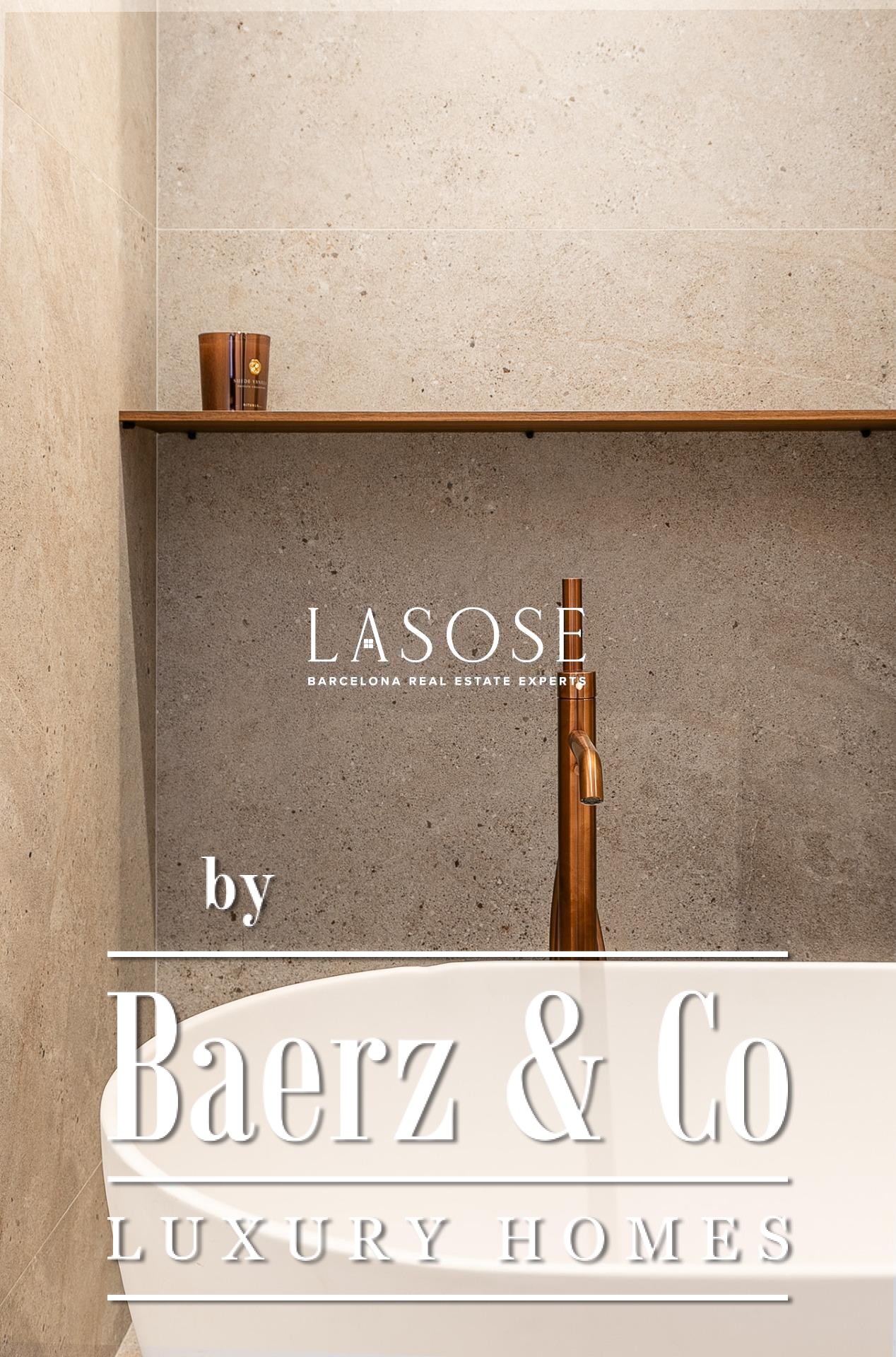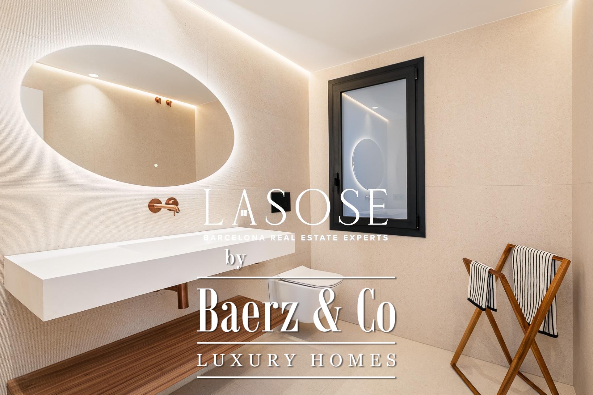 The apartment has undergone a complete refurbishment finished with high-end materials. Light flows in through expansive southeast-facing windows, illuminating generous interior volumes and the open 90 m² living-dining area. Here, doors open onto a panoramic corner terrace overlooking the tree-lined boulevards and Plaça Mossèn Jacint Verdaguer. The kitchen, by Santos and fitted with Bosch appliances, centers around a social island with an integrated wine cellar and coffee zone, complemented by an adjacent pantry room for discreet storage.