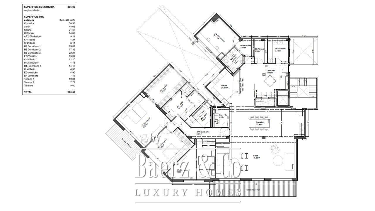 Four double bedrooms define the night area. The master suite offers a private terrace, a walk-in wardrobe and en-suite bathroom with a freestanding tub. A second en-suite bedroom ensures comfort for guests, while Porcelanosa stone and Noken fixtures elevate all bathrooms. The residence includes a storage room, laundry, service area and advanced home technology: full home automation, Mitsubishi zoned climate control, aerothermal heating and double-glazed carpentries.
