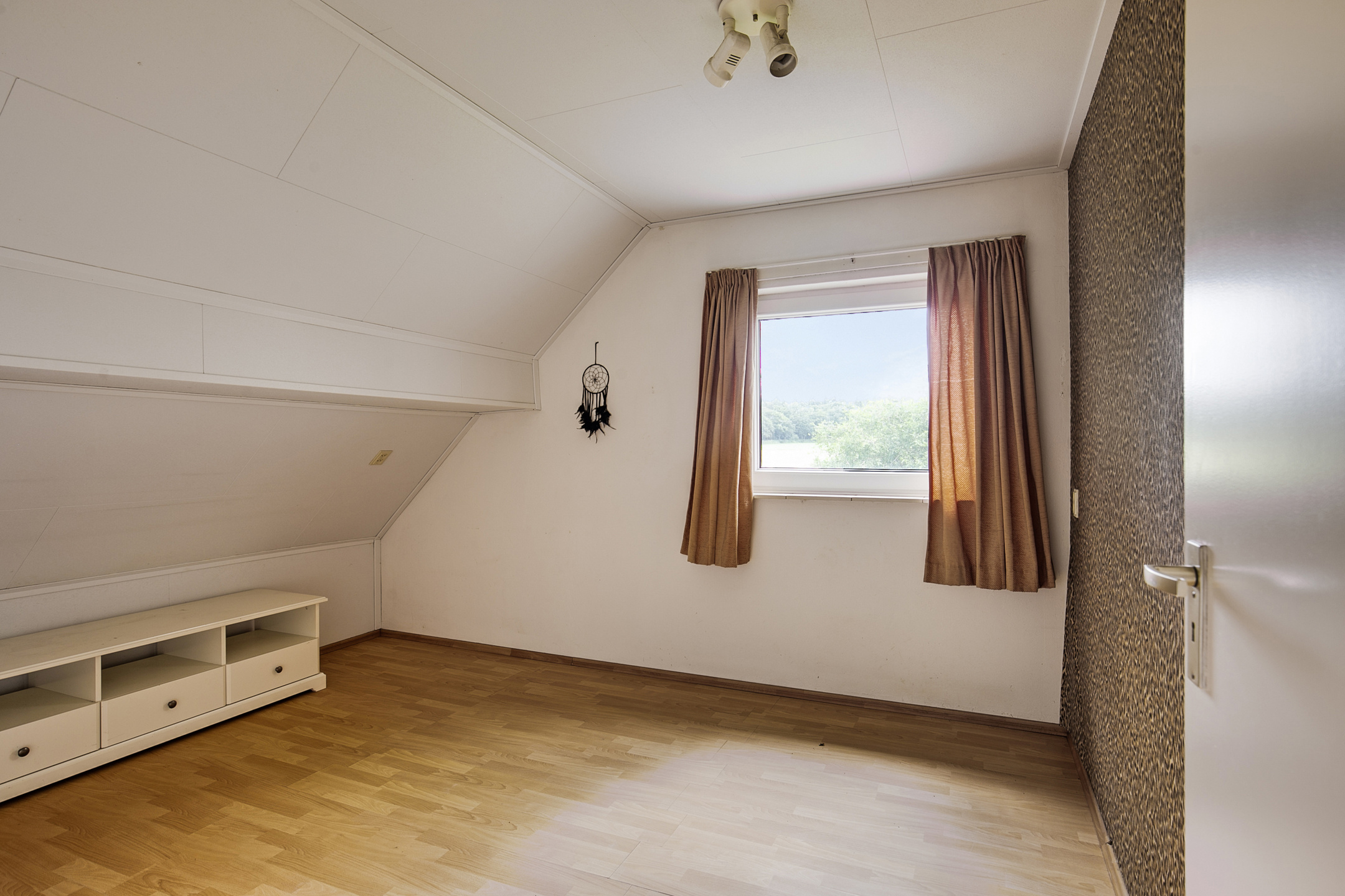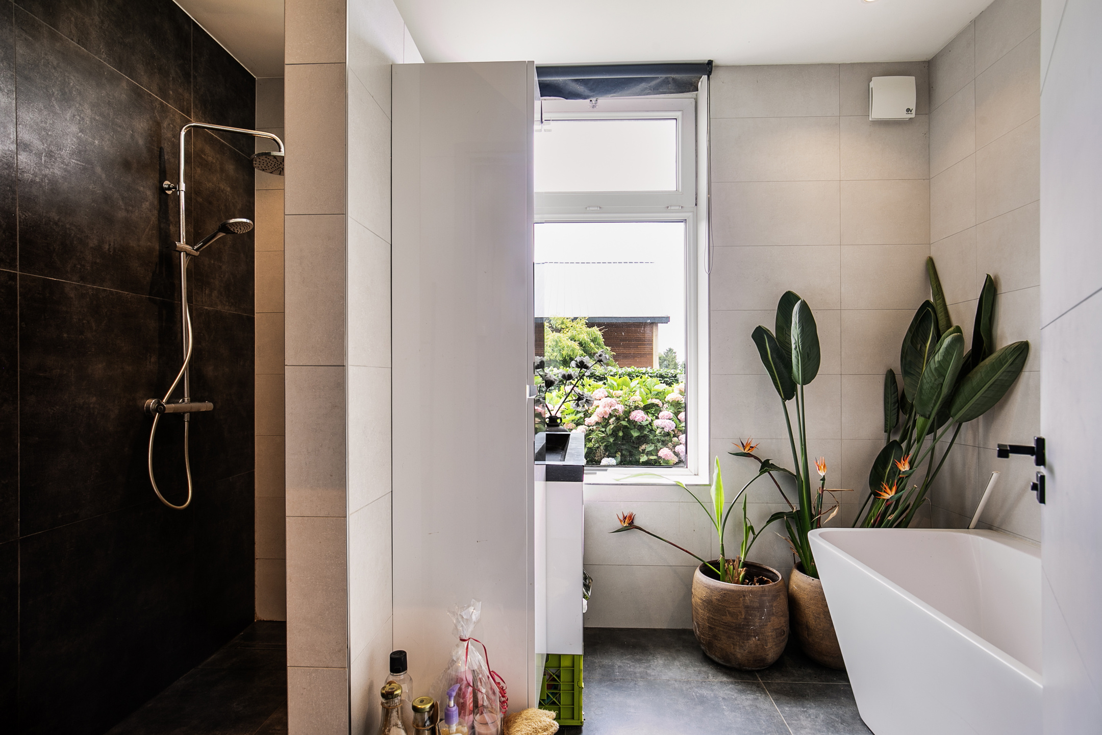 The right-hand section of the house was completely renovated in 2019. This part is arranged on the ground floor with a hall, a living kitchen, a spacious living room, a bathroom, laundry room, toilet room and a cellar cupboard. The hall has a tiled floor, stucco walls and a stucco ceiling. The meter cupboard and a closet with storage space are located in the hallway. The pleasant living kitchen is in open connection with the adjacent living room and is equipped with a corner kitchen layout. This kitchen unit is equipped with a sink, an electric cooker with an oven, a microwave, a dishwasher and a fridge. A large window above the worktop offers a nice view of the accommodation and provides plenty of light. Room-high windows in the side and rear elevations also provide a sea of light in the living room. In addition, a wicket door provides access to the rear garden. The living room is finished with a tiled floor, stucco walls and a stucco ceiling. There is also a large closet wall with sliding doors with plenty of practical storage space. The fully tiled bathroom is fitted with a bathtub, a walk-in shower and a wide washbasin with a storage cabinet. The stucco ceiling has recessed lighting.