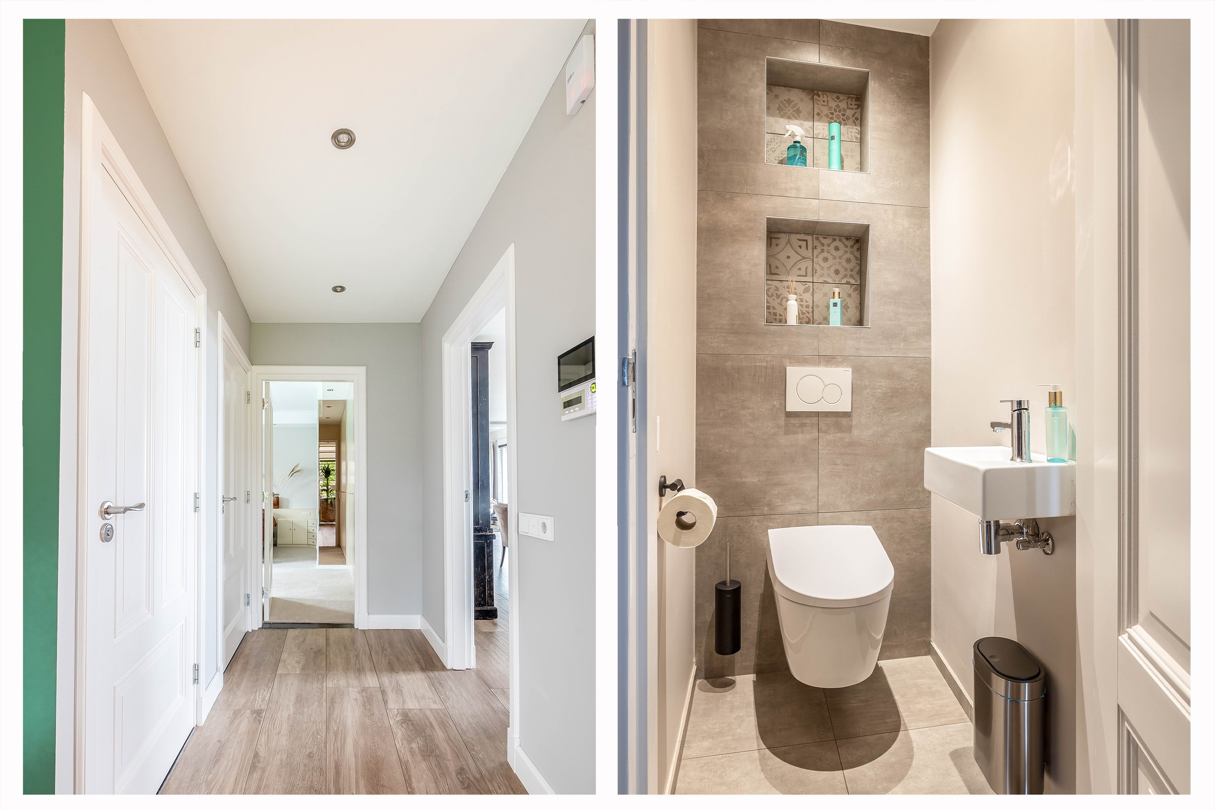 Almost the entire ground floor (excluding the bedroom and bathroom) is fitted with a ceramic tiled floor with underfloor heating. The toilet is equipped with a washbasin, and the utility room features connections for household appliances and a door leading to the garden.
