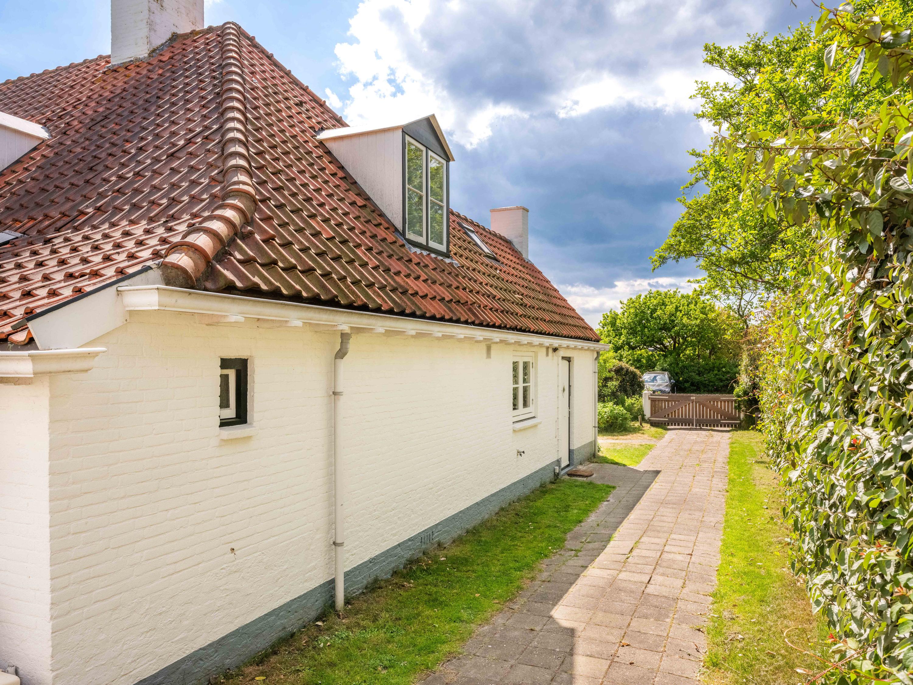 The first floor has three bedrooms, each with a washbasin and built-in wardrobe. Thanks to several dormer windows, there is plenty of light and space. There is a separate central heating cupboard and a second bathroom with a bath, shower, toilet, skylight and mechanical ventilation. From the landing, a small dormer window offers a view of the coast.