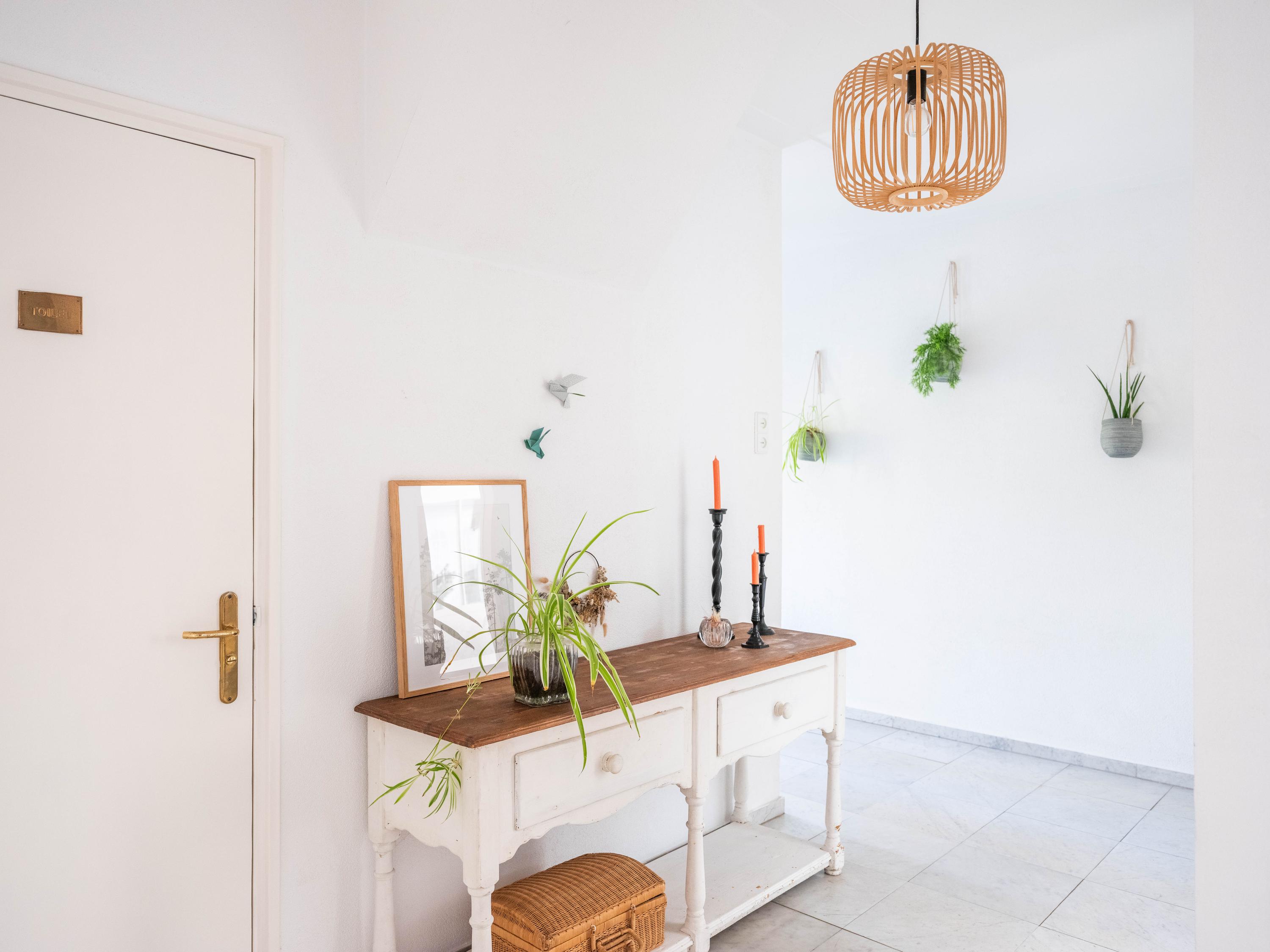 We find the very spacious, bright living room on the other side of the hall, with a cosy fireplace and sliding doors to a sunny terrace. Furthermore, on the ground floor, adjacent to the living room, we find an enclosed office/workspace with an adjoining laundry room with washing machine and dryer connections neatly concealed in a closet. From this room there is a sliding door giving access to the garden and terrace.