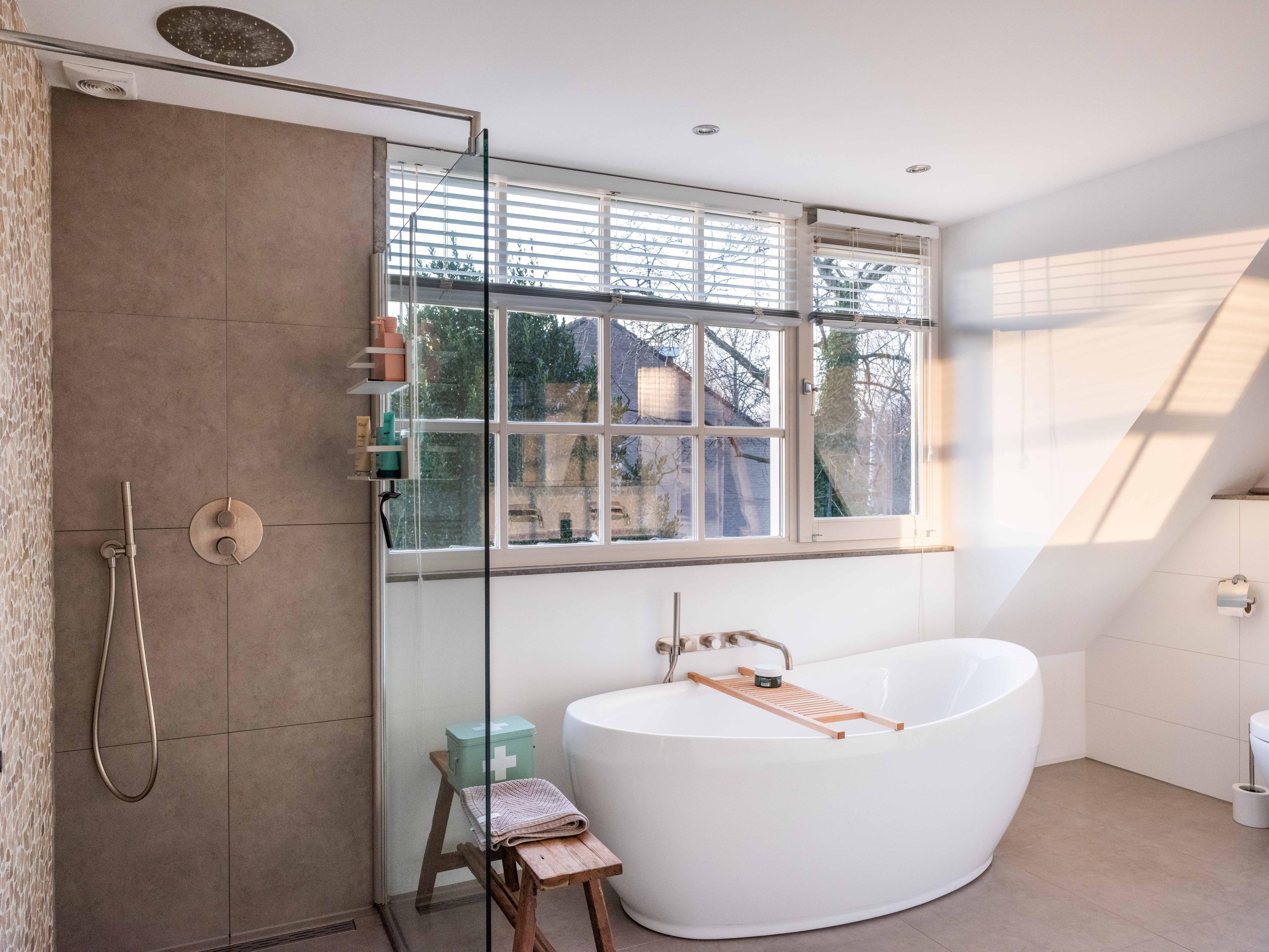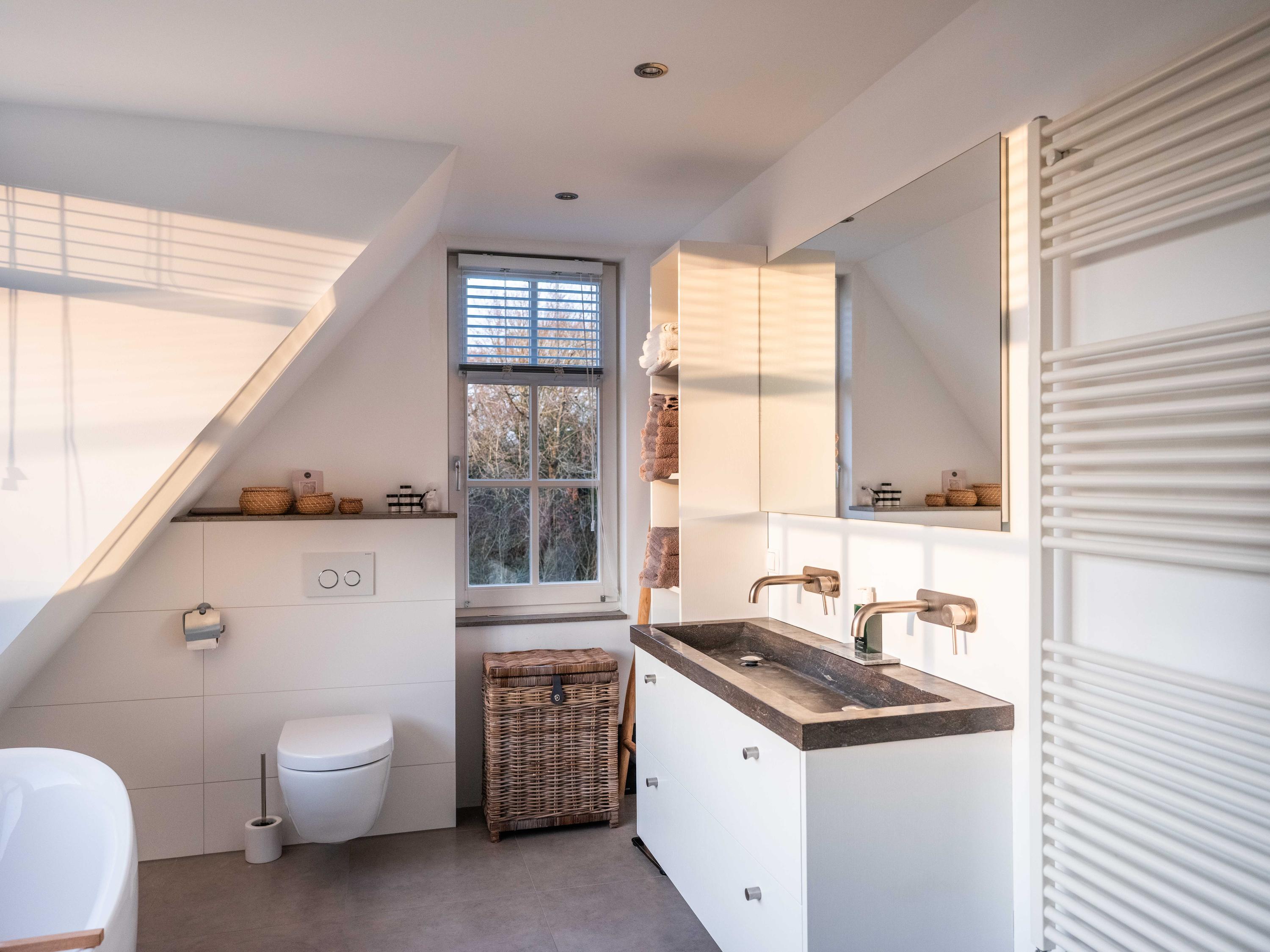 The first floor offers three well-sized bedrooms, each with its own atmosphere and fitted with custom wardrobes. The luxurious bathroom is stylishly finished with natural materials, and here too, quality and tranquility have been chosen. Throughout the house, it is clear that care and taste have been taken to create a harmonious whole.