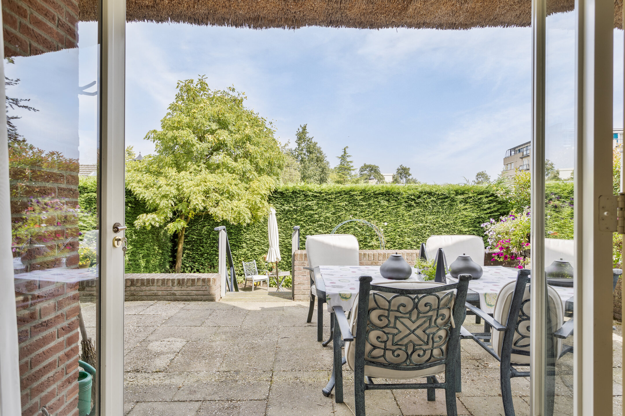 De tuin is beschut gelegen waarbij direct aansluitend achter de woonkamer een terras aanwezig is voor de gezellige uren. Via een trap bereikt u het groene deel van de tuin welke volledig omheind is en waar vandaan u de woning rondom kan bereiken. Het geheel is groen omheind en aan de voorzijde voorzien van een elektrische poort en deurbelinstallatie.