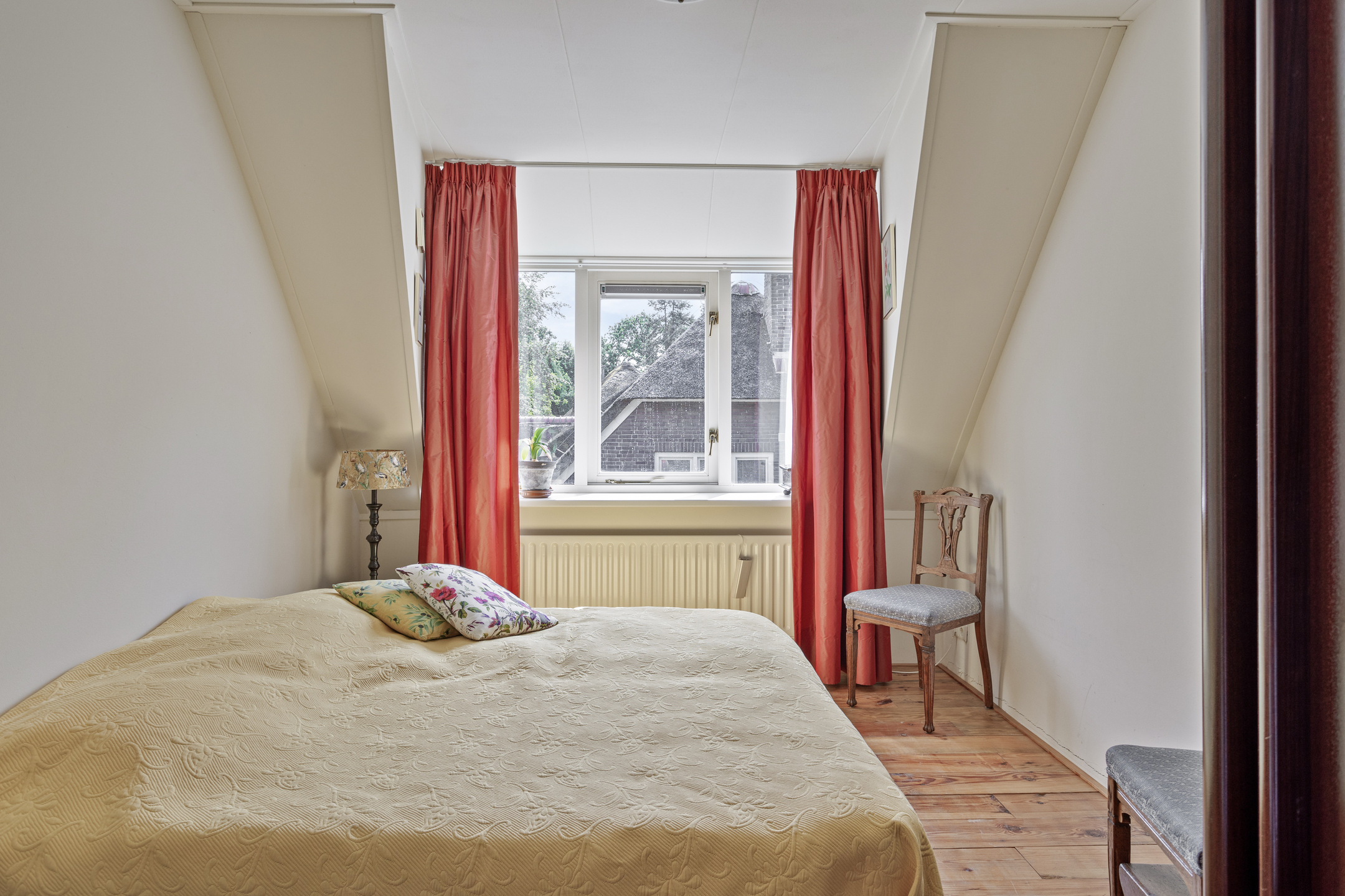 slaapkamer linksachter, met een inbouwkast en een dakkapel, wandafwerking structuurverf, grenen planken vloer, plafond afgewerkt met gipsplaten;