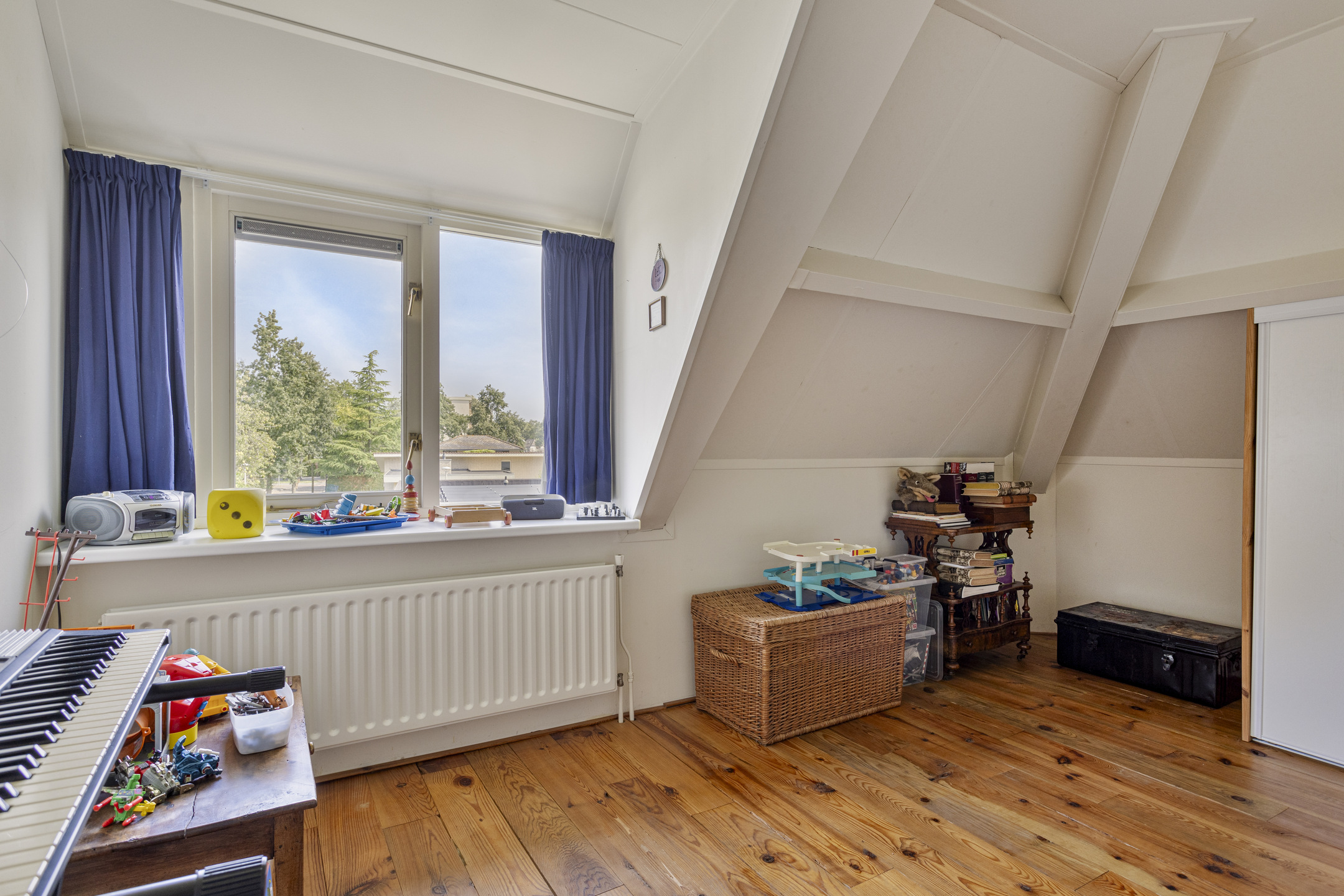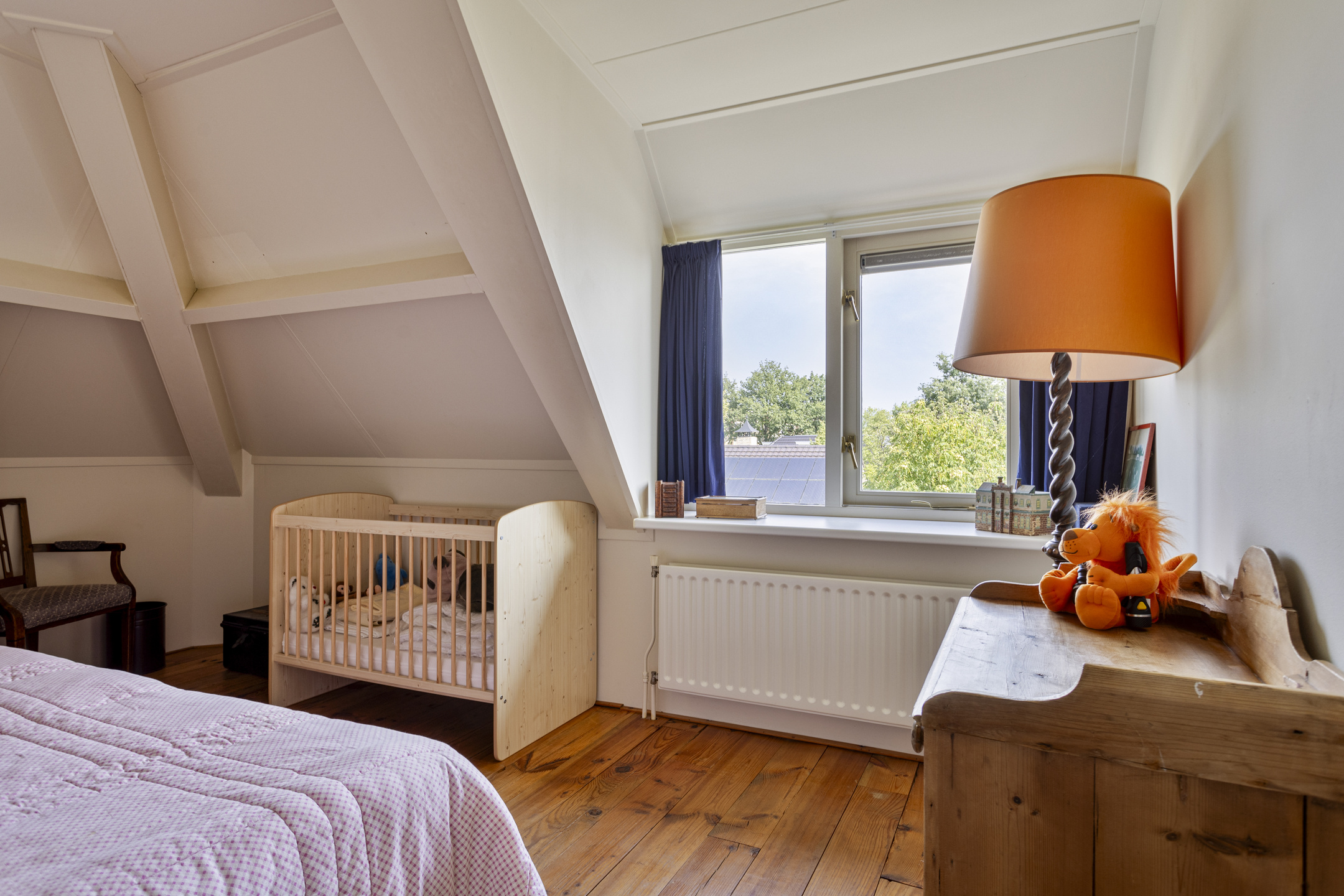hoofdslaapkamer voorzijde (ca. 29 m²) met inbouwschuifkasten en een dakkapel, wandafwerking stucwerk, grenen planken vloer, dakbeschot in het zicht;