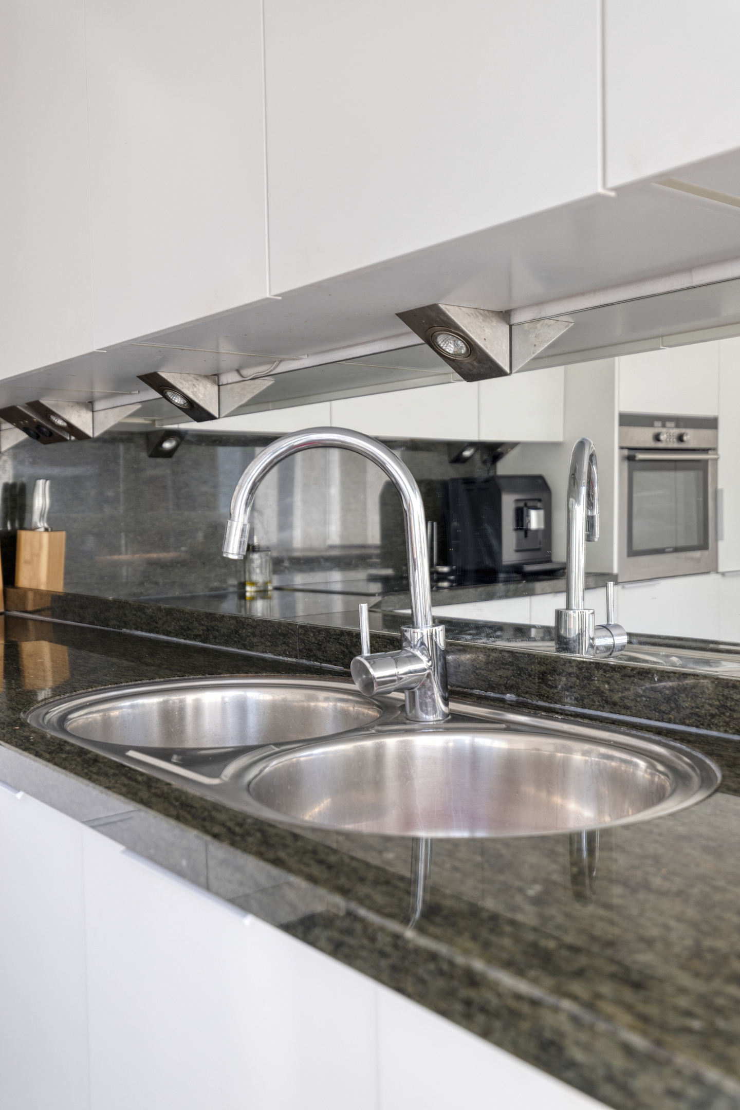 The recently renovated L-shaped kitchen is fully equipped with built-in appliances, including a dishwasher, induction hob, extractor hood, double sink with mixer tap, oven, and fridge-freezer combination. A window screen has also been installed.