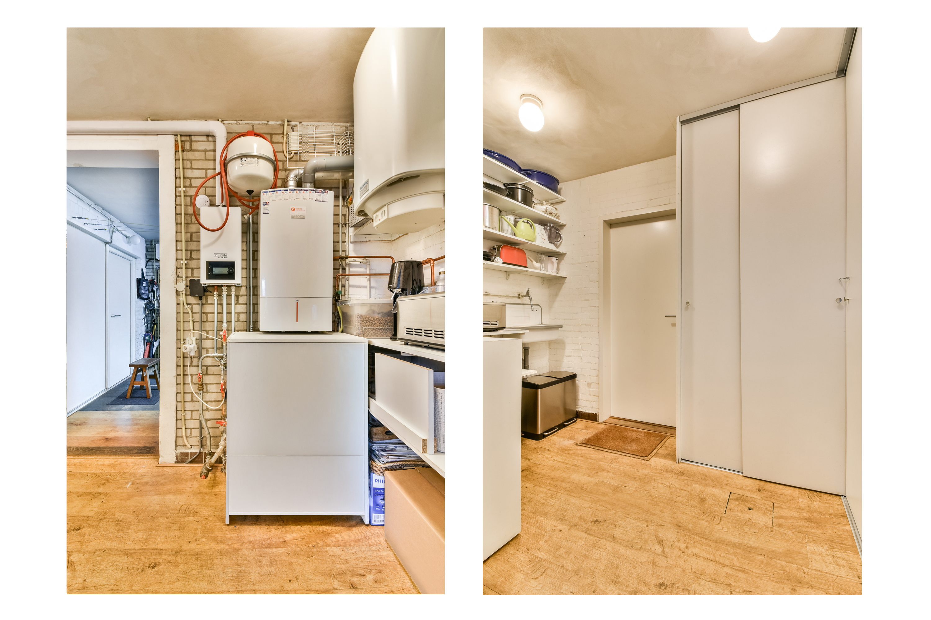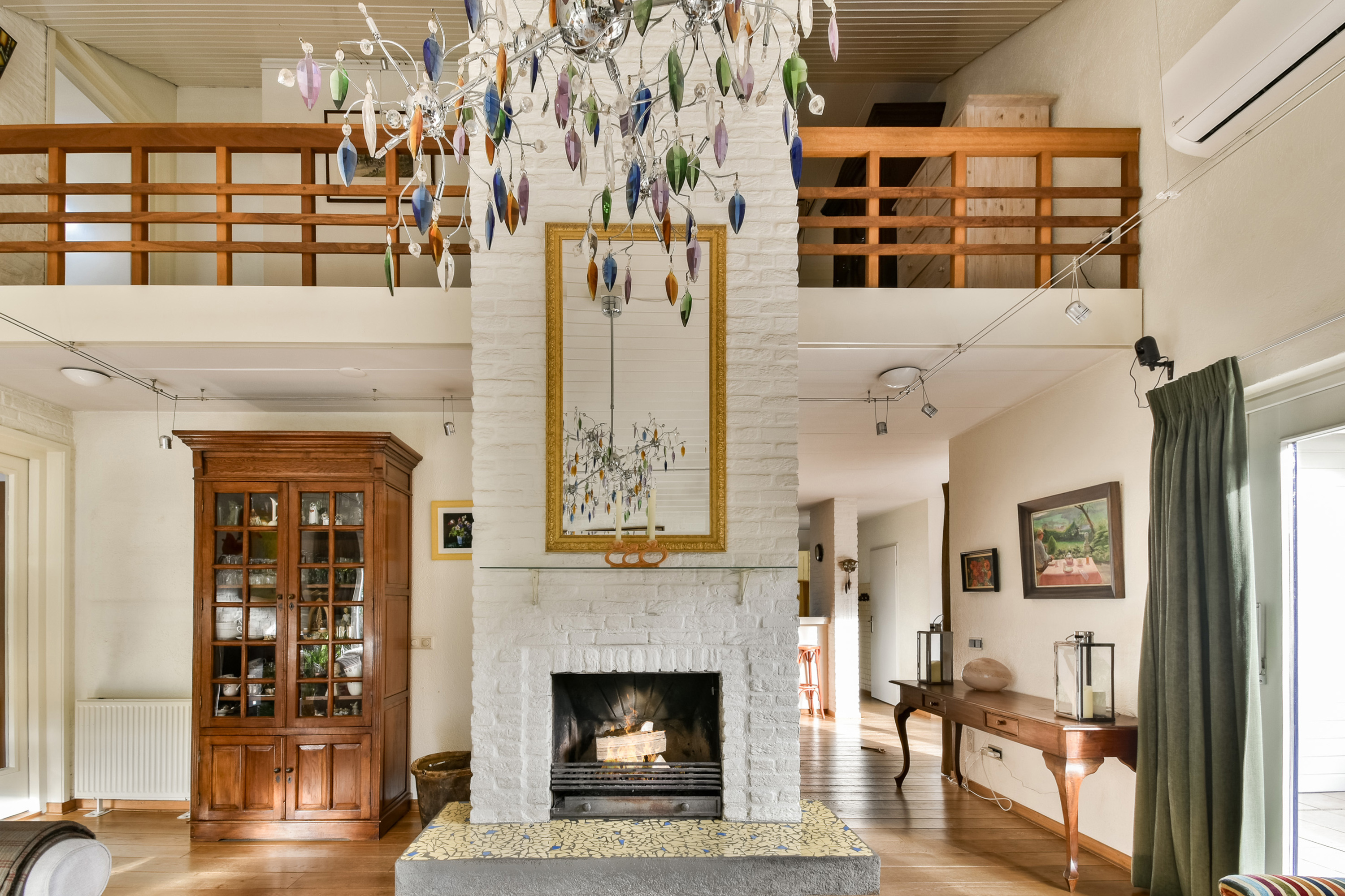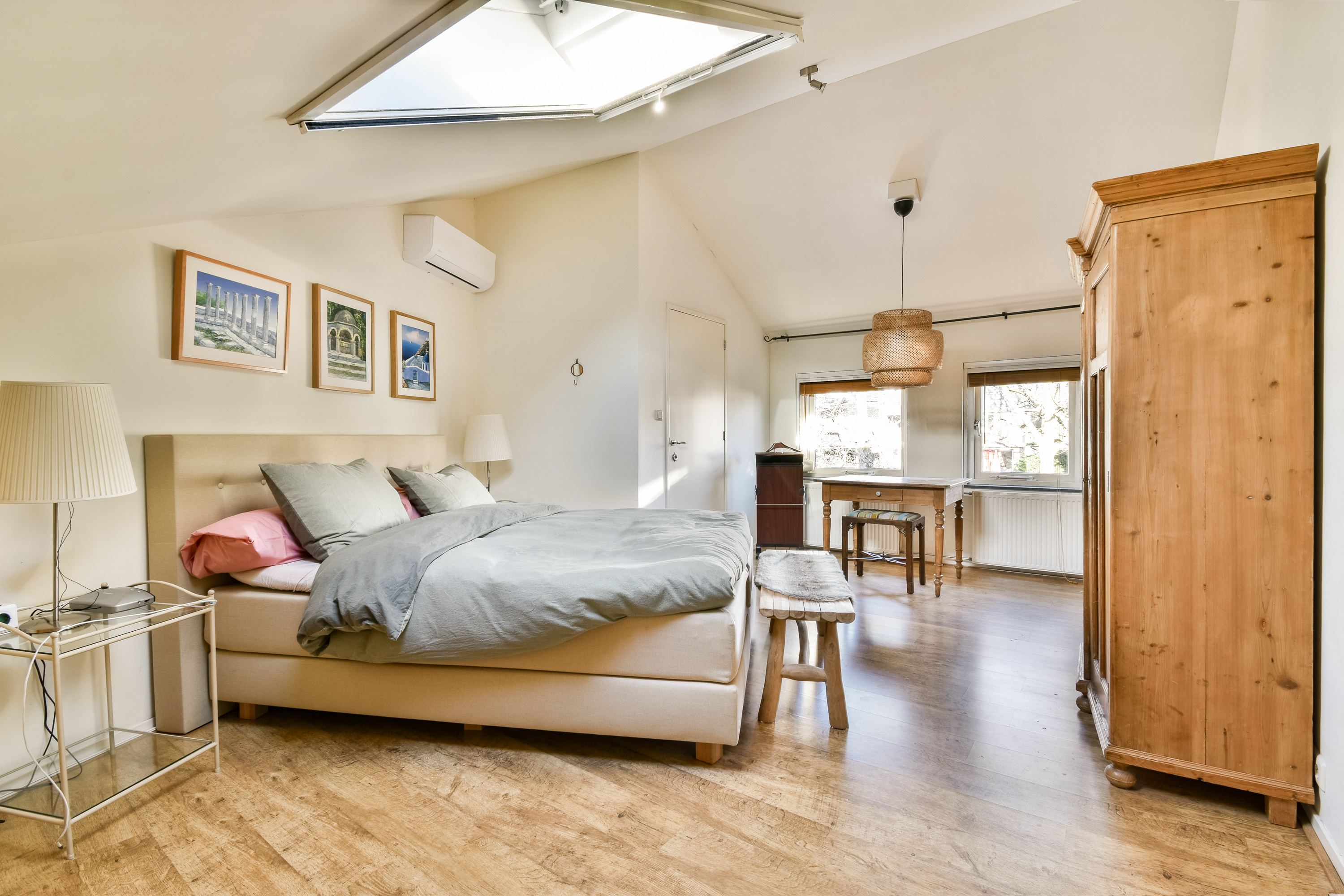 On the ground floor, the entrance opens into a spacious living room with air conditioning and a fireplace, complemented by wide doors leading directly to the garden and sunny patio. Adjacent to the kitchen equipped with built-in appliances lies a utility room and indoor storage. The massief oak flooring throughout the main level introduces warmth, while an extra versatile room opens onto the garden, providing possibilities for home office or creative pursuits.