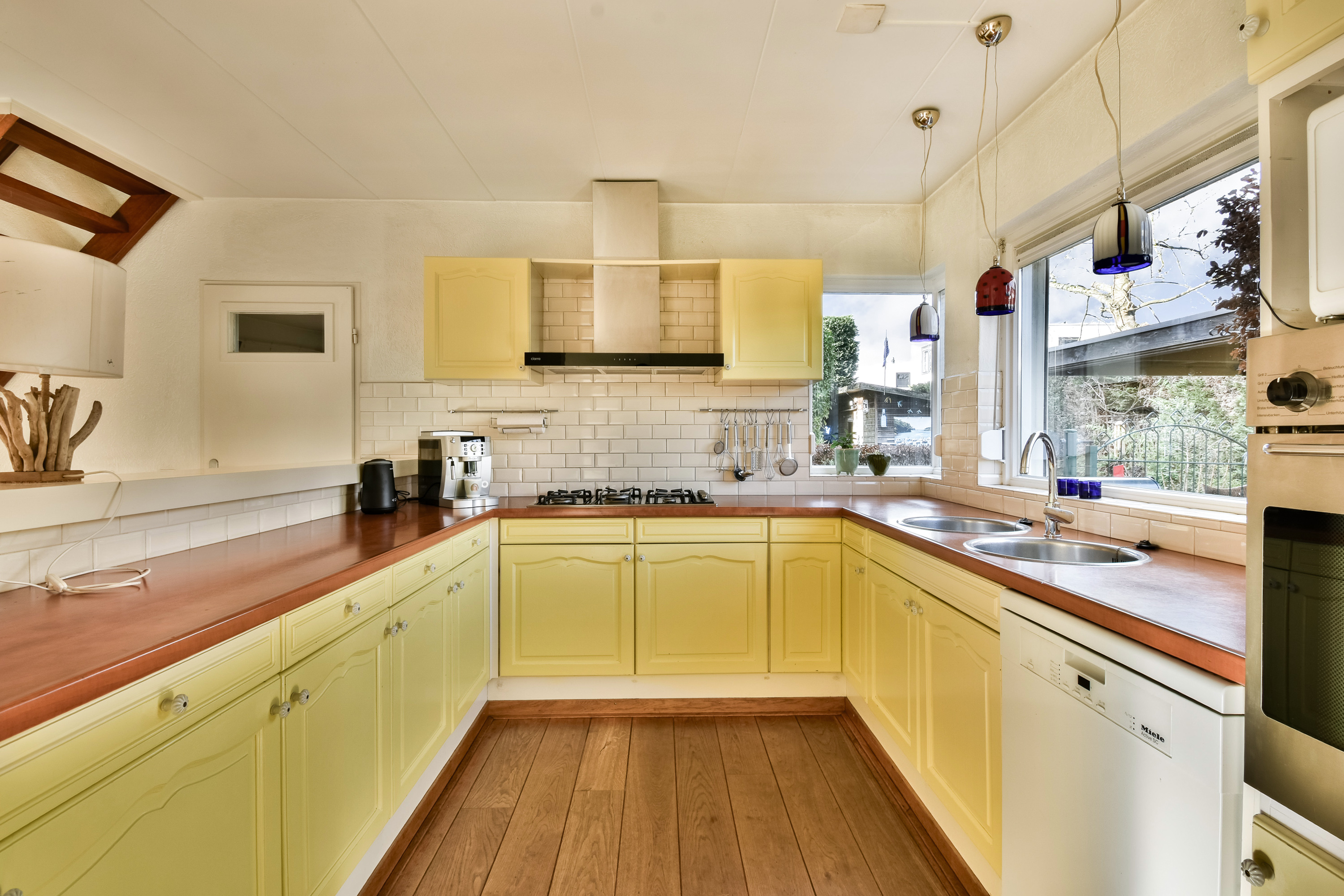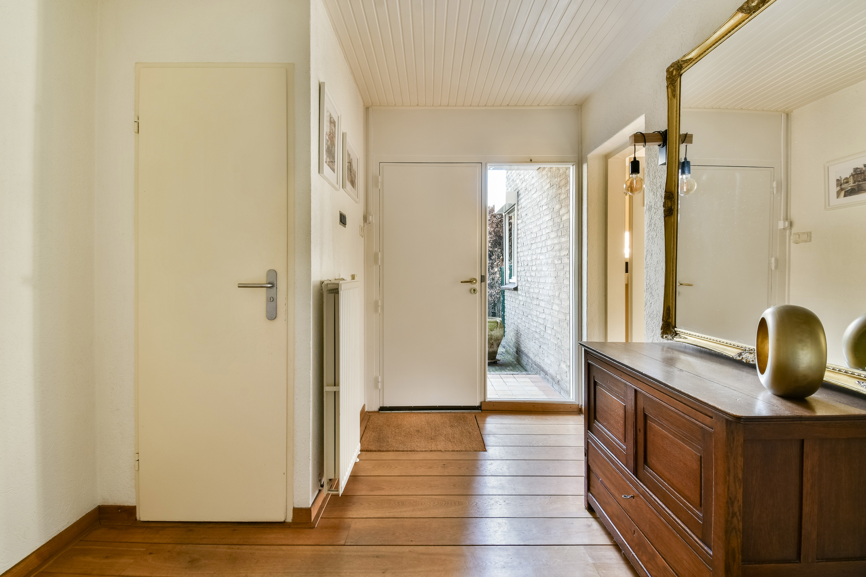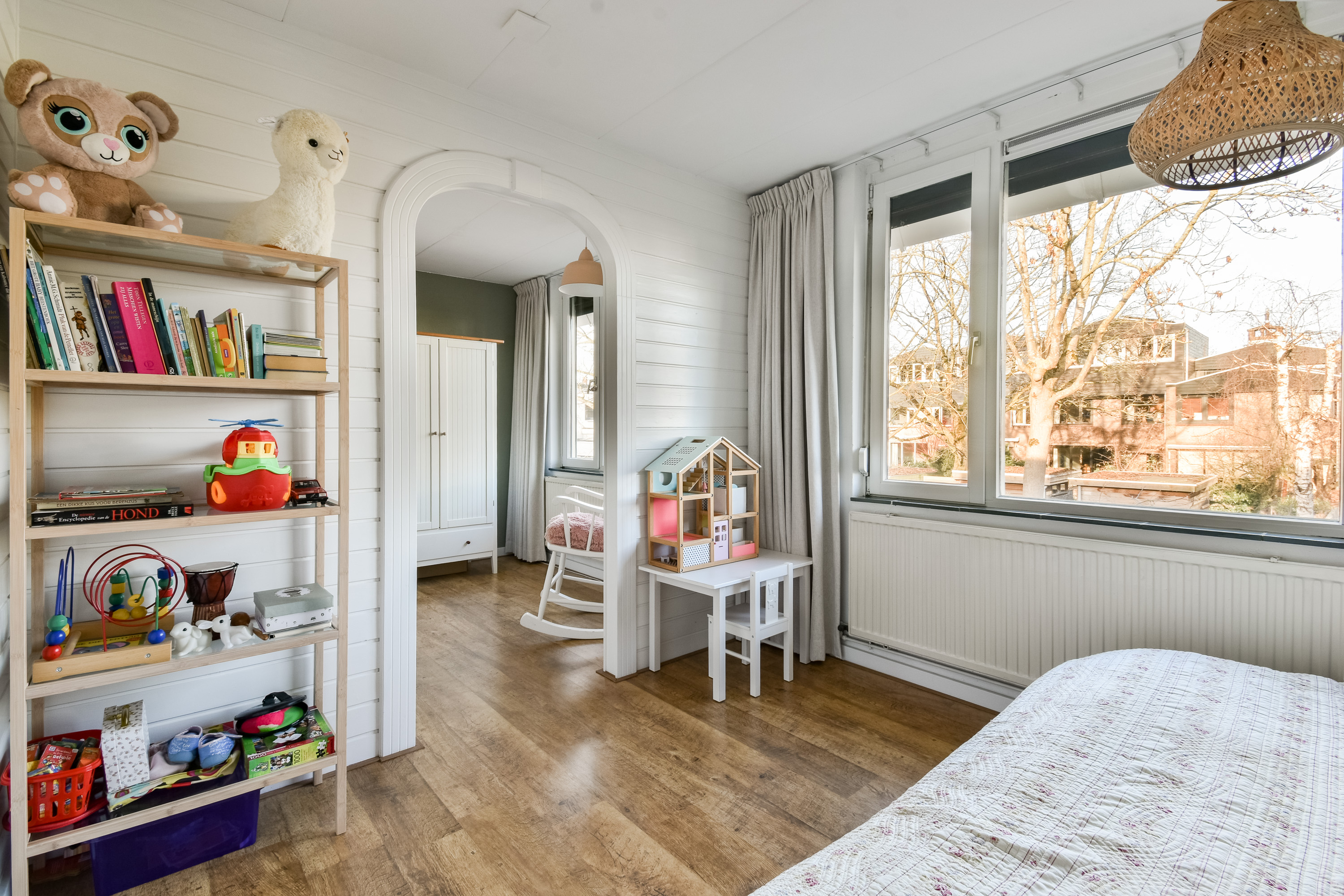 On the ground floor, the entrance opens into a spacious living room with air conditioning and a fireplace, complemented by wide doors leading directly to the garden and sunny patio. Adjacent to the kitchen equipped with built-in appliances lies a utility room and indoor storage. The massief oak flooring throughout the main level introduces warmth, while an extra versatile room opens onto the garden, providing possibilities for home office or creative pursuits.