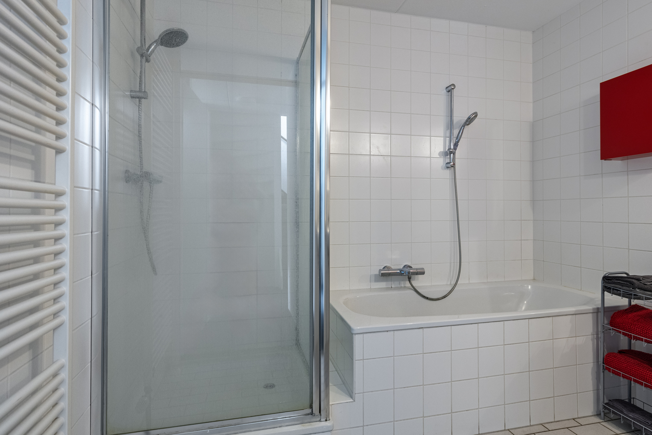 The centrally located bathroom includes a shower, bathtub, double sinks, and a towel radiator.