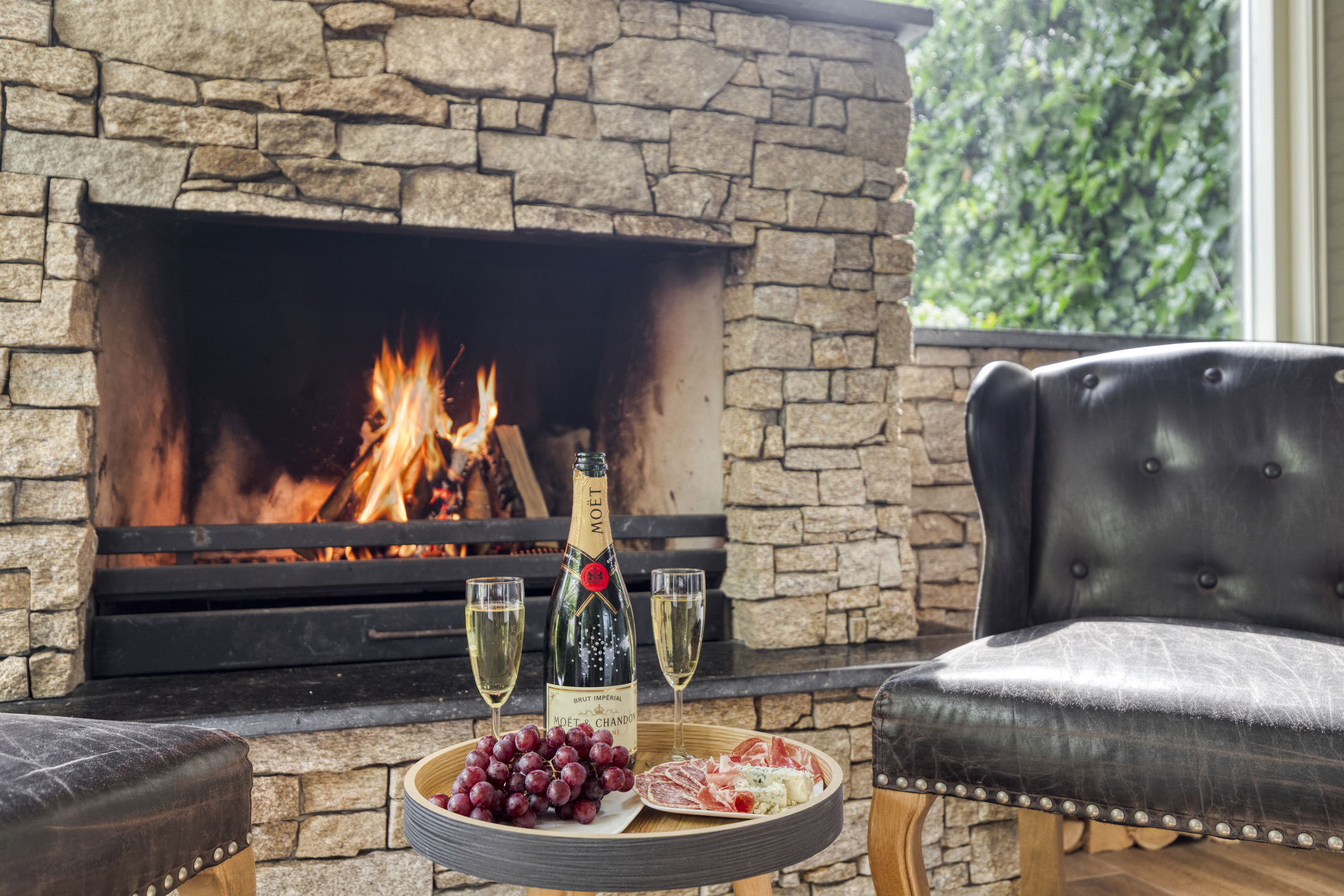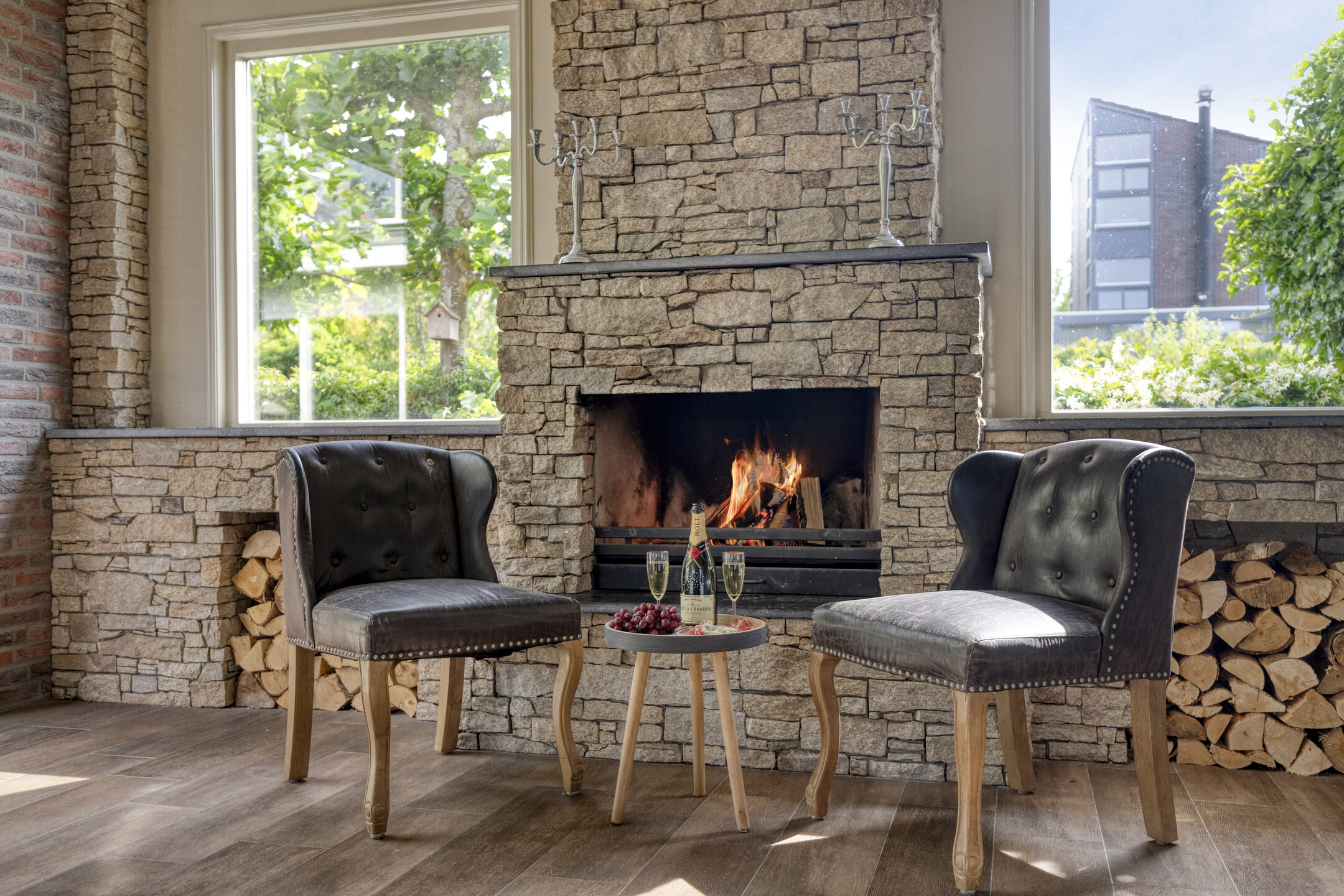 -Spacious living, kitchen, and dining area with a charming veranda with fireplace.