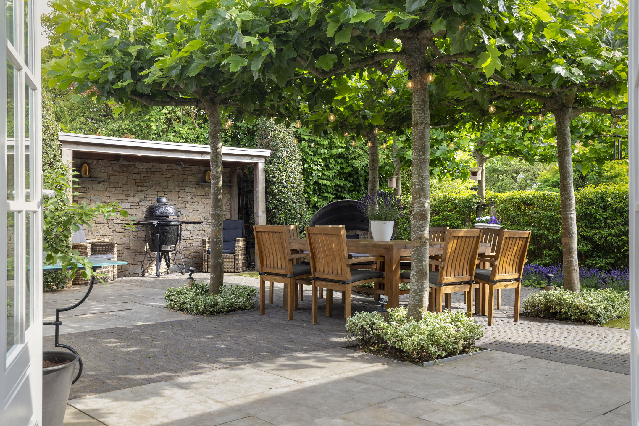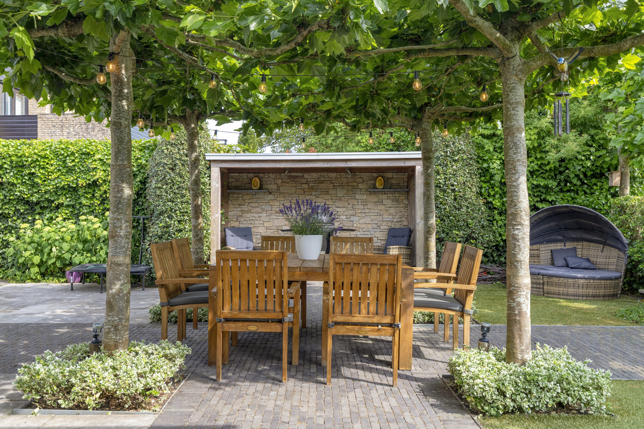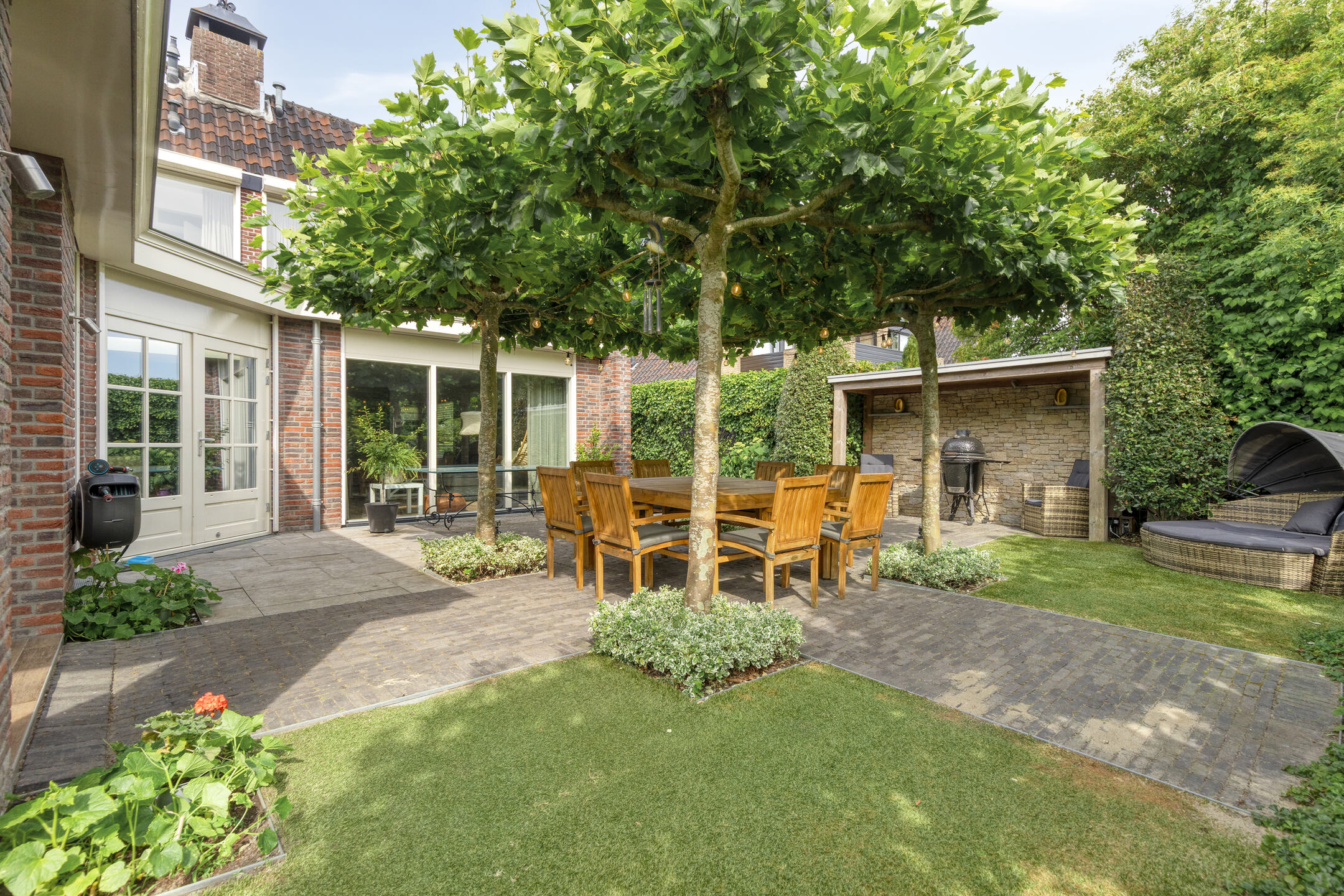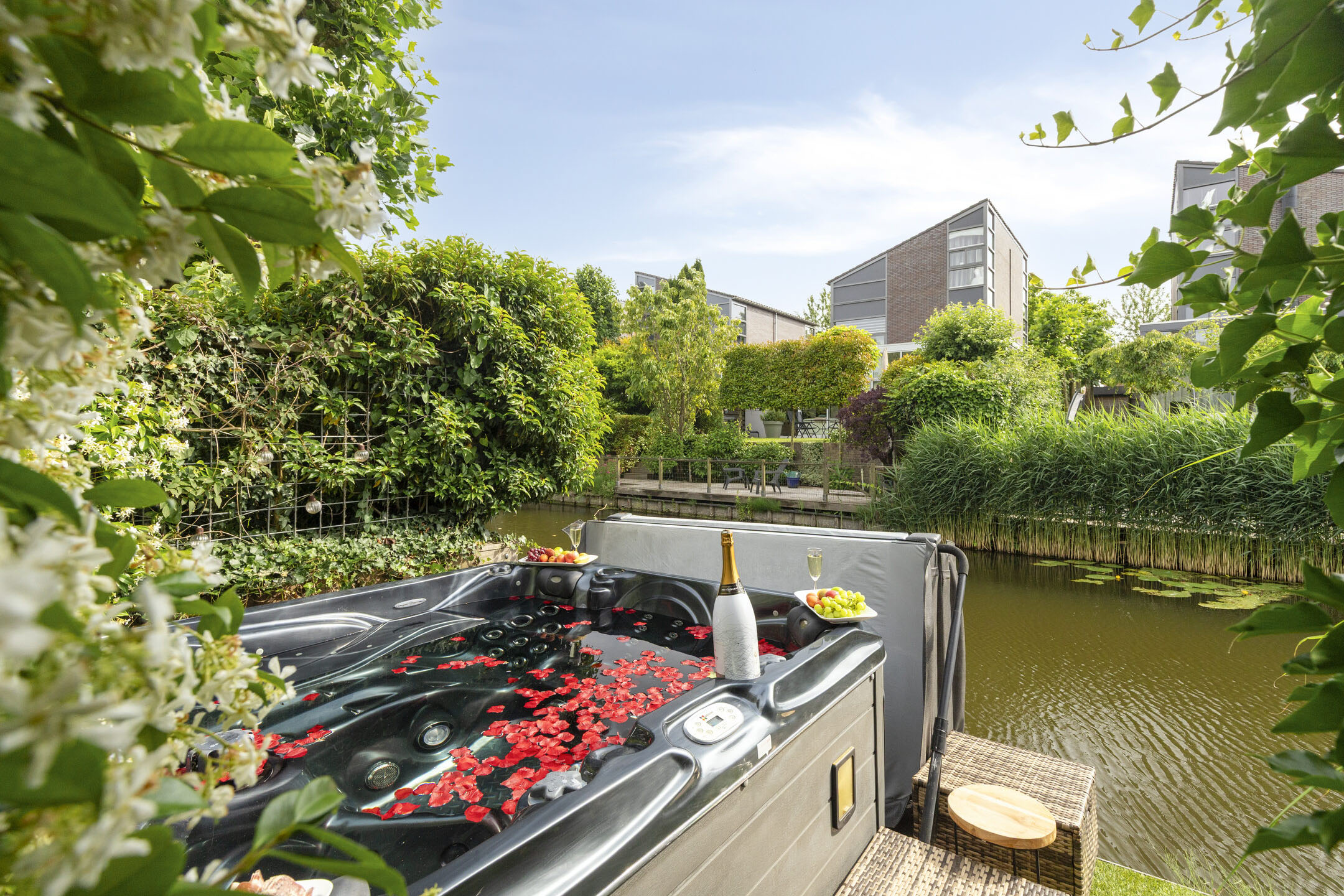 The backyard features a large terrace with a cozy central seating area shaded by four parasol-shaped plane trees. By the waterfront, there’s a wooden deck with a Jacuzzi.