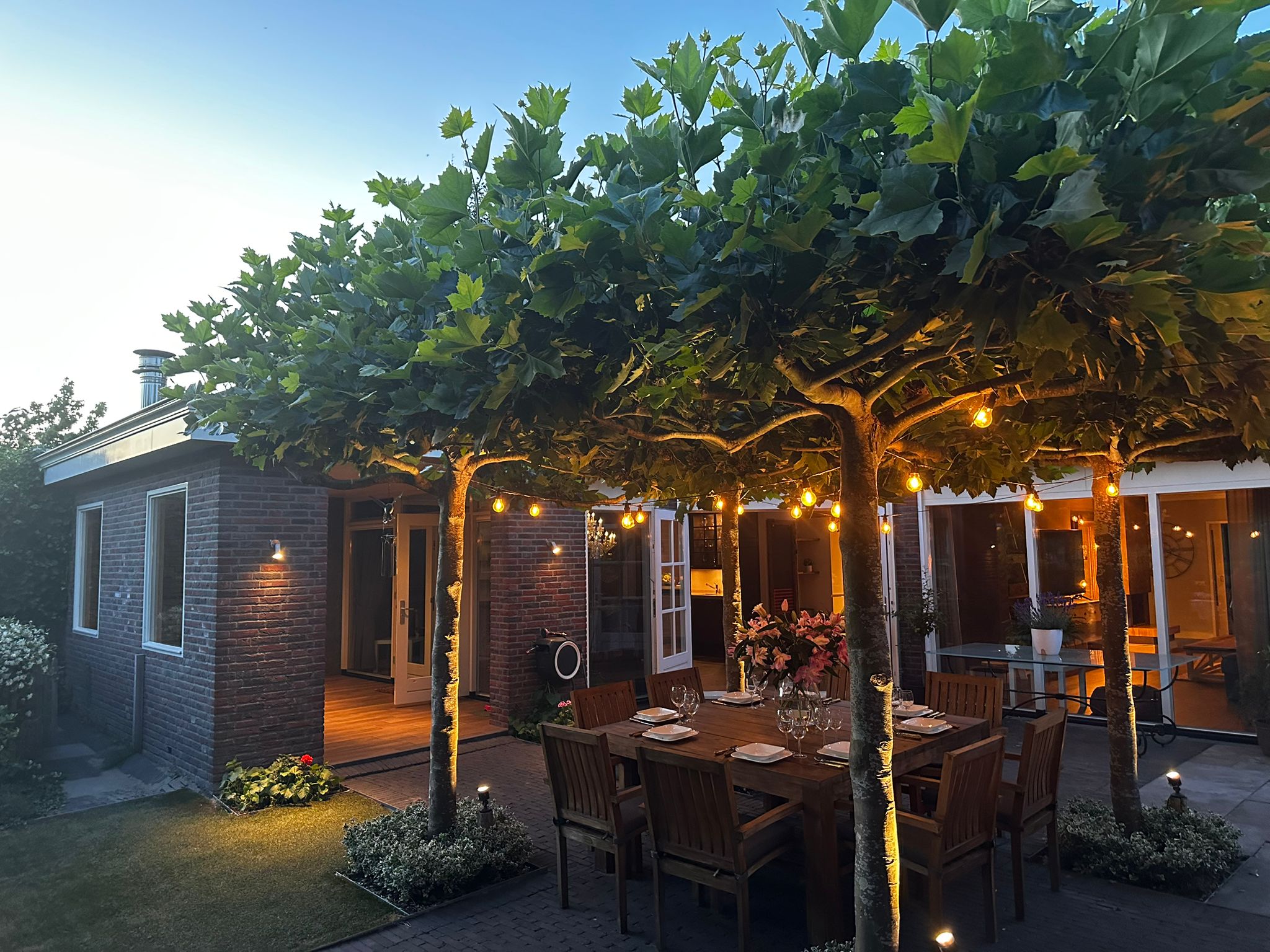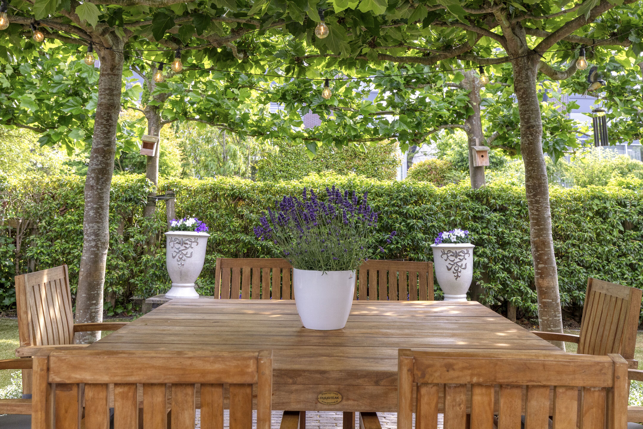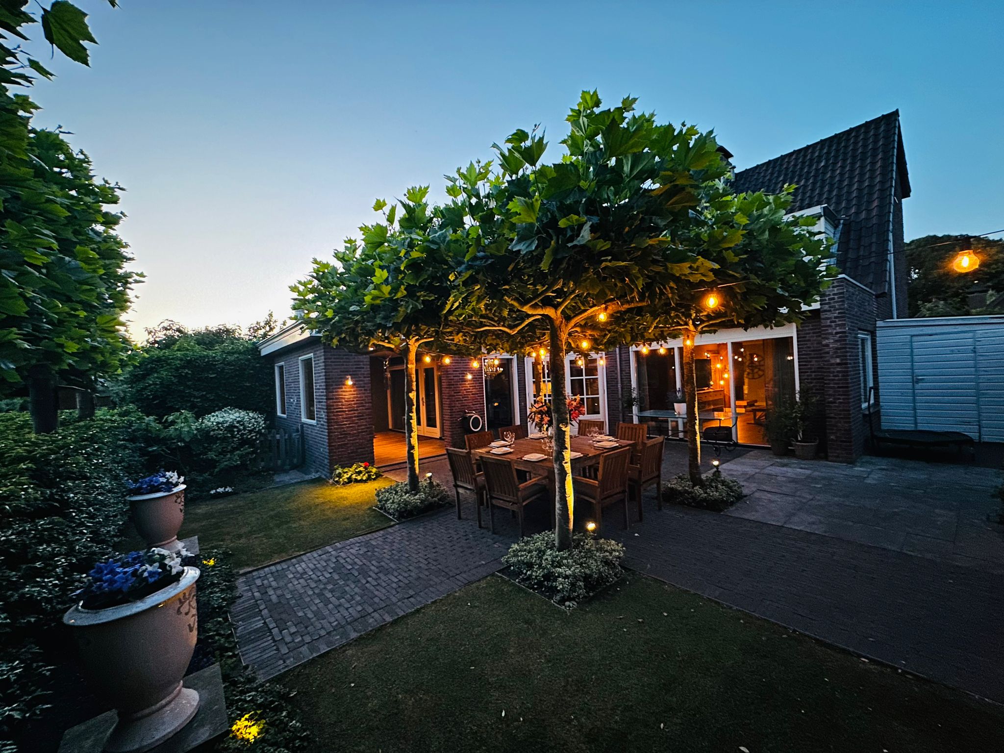 The backyard features a large terrace with a cozy central seating area shaded by four parasol-shaped plane trees. By the waterfront, there’s a wooden deck with a Jacuzzi.
