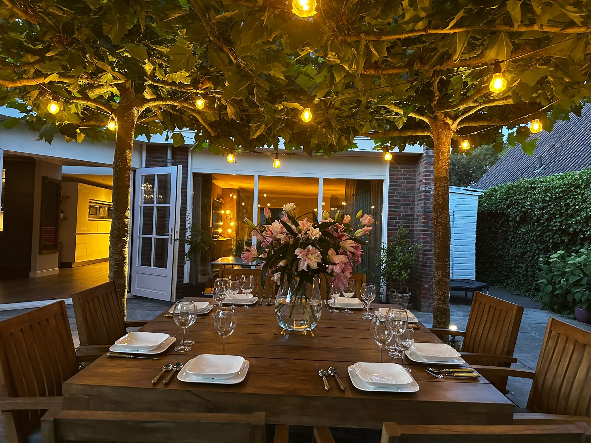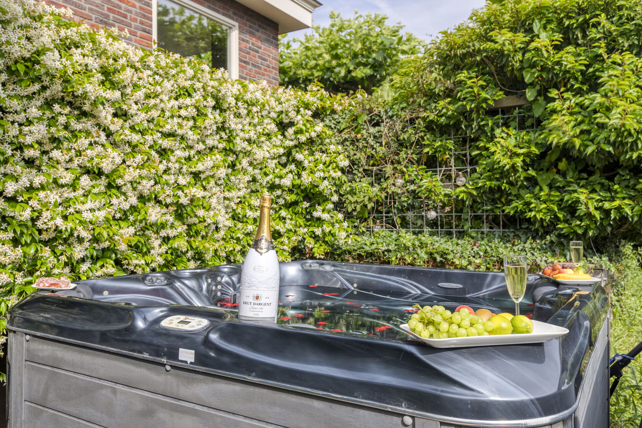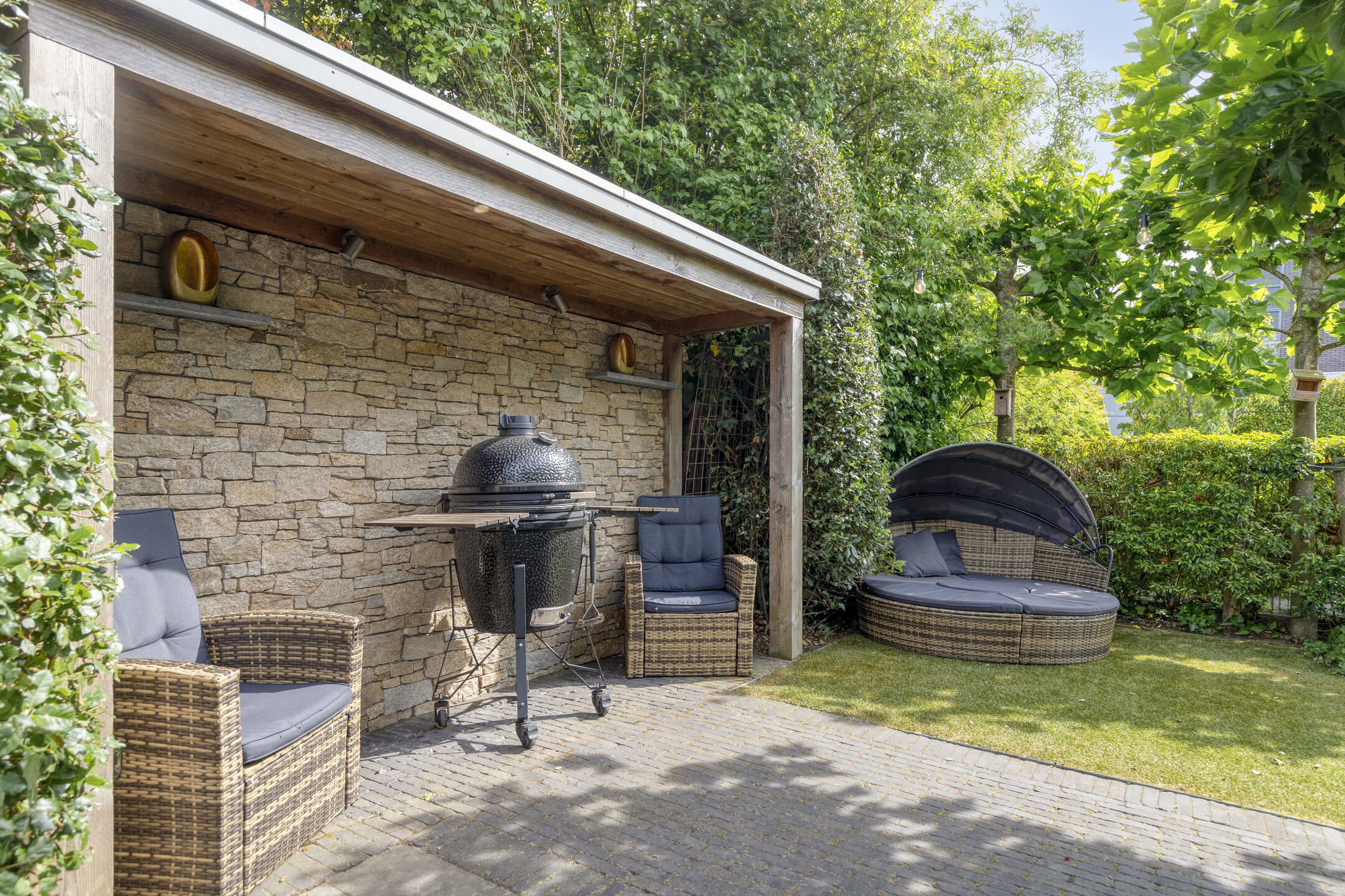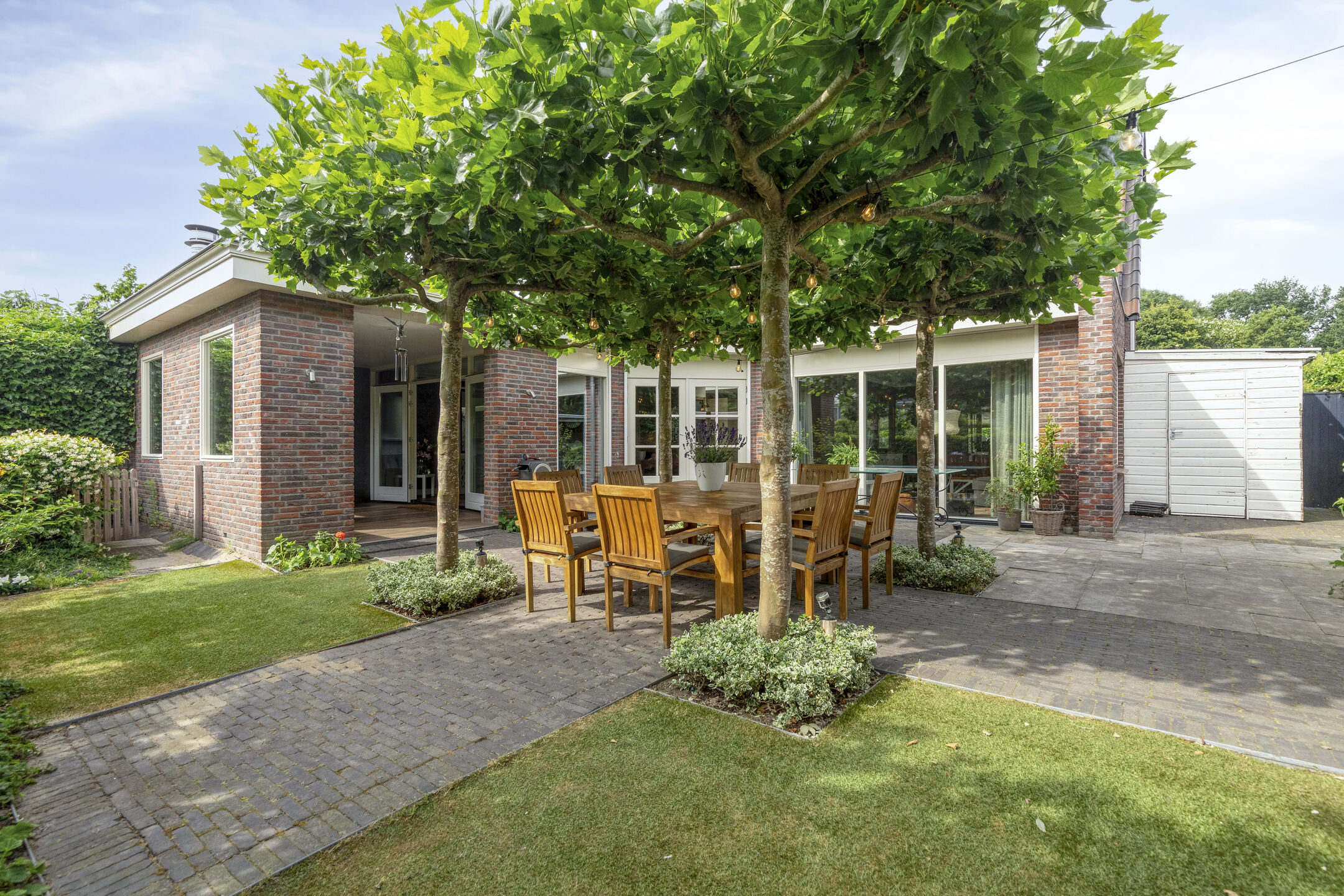 The backyard features a large terrace with a cozy central seating area shaded by four parasol-shaped plane trees. By the waterfront, there’s a wooden deck with a Jacuzzi.