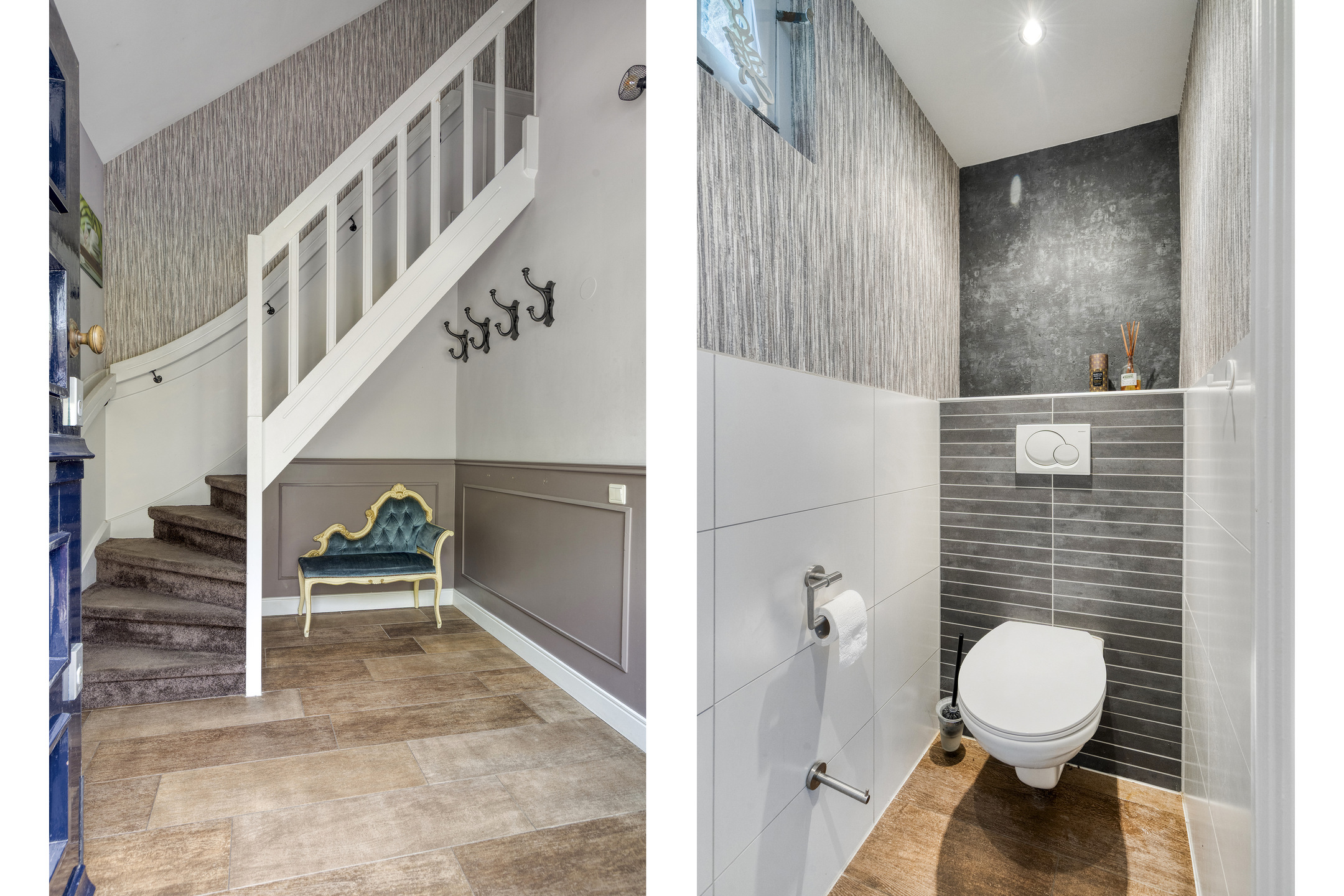 Entrance to the house is located at the side. Hallway with toilet, meter cupboard (with fiber optic connection), deep storage closet under the stairs, and staircase to the first floor.