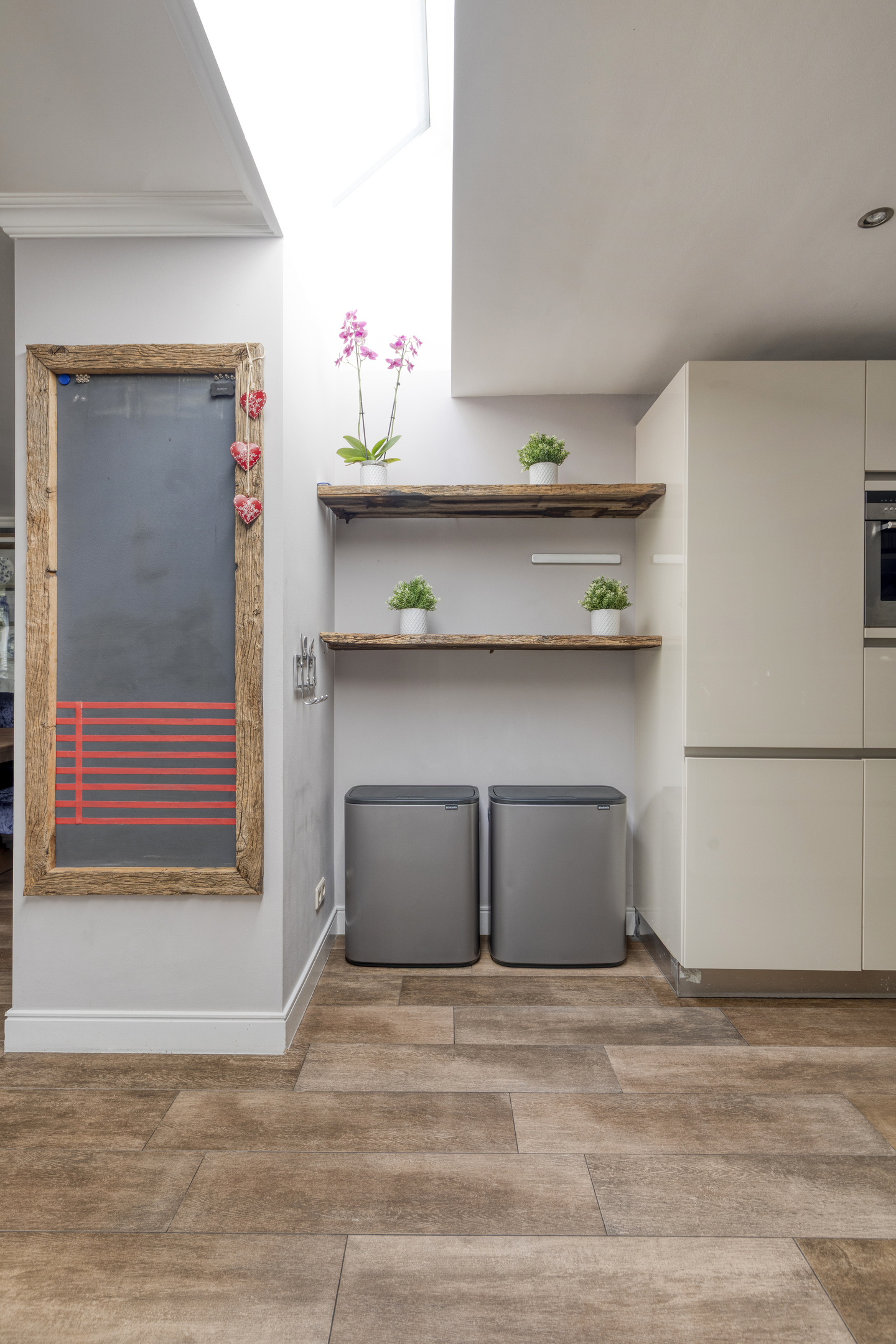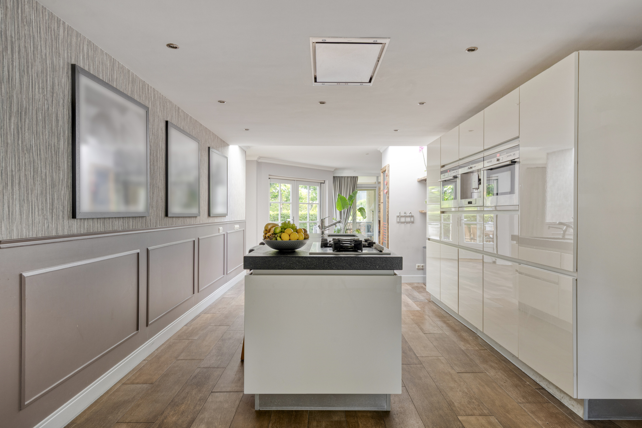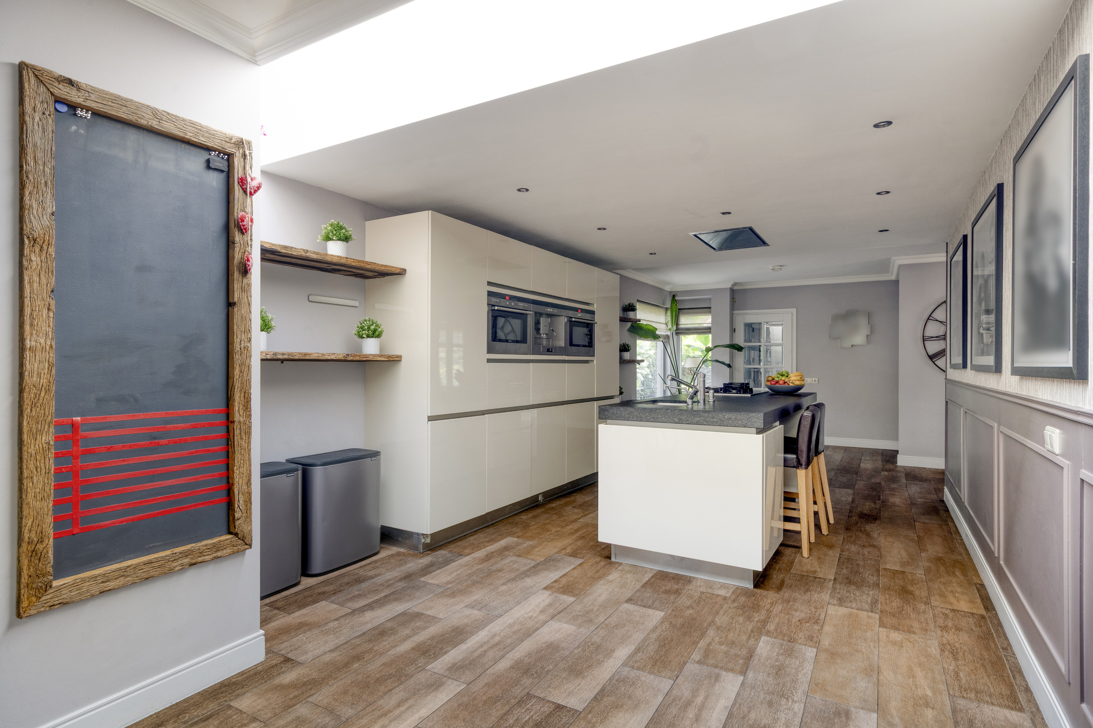 Upon entering, you step into the open kitchen with a cooking island and an extensive wall of cabinets with Siemens appliances, including: a built-in coffee machine, combination microwave/oven, and fridge-freezer. The island houses a sink, plenty of drawers, a dishwasher, and a 5-burner gas stove with an integrated extractor hood. A skylight in the ceiling brings in natural light.