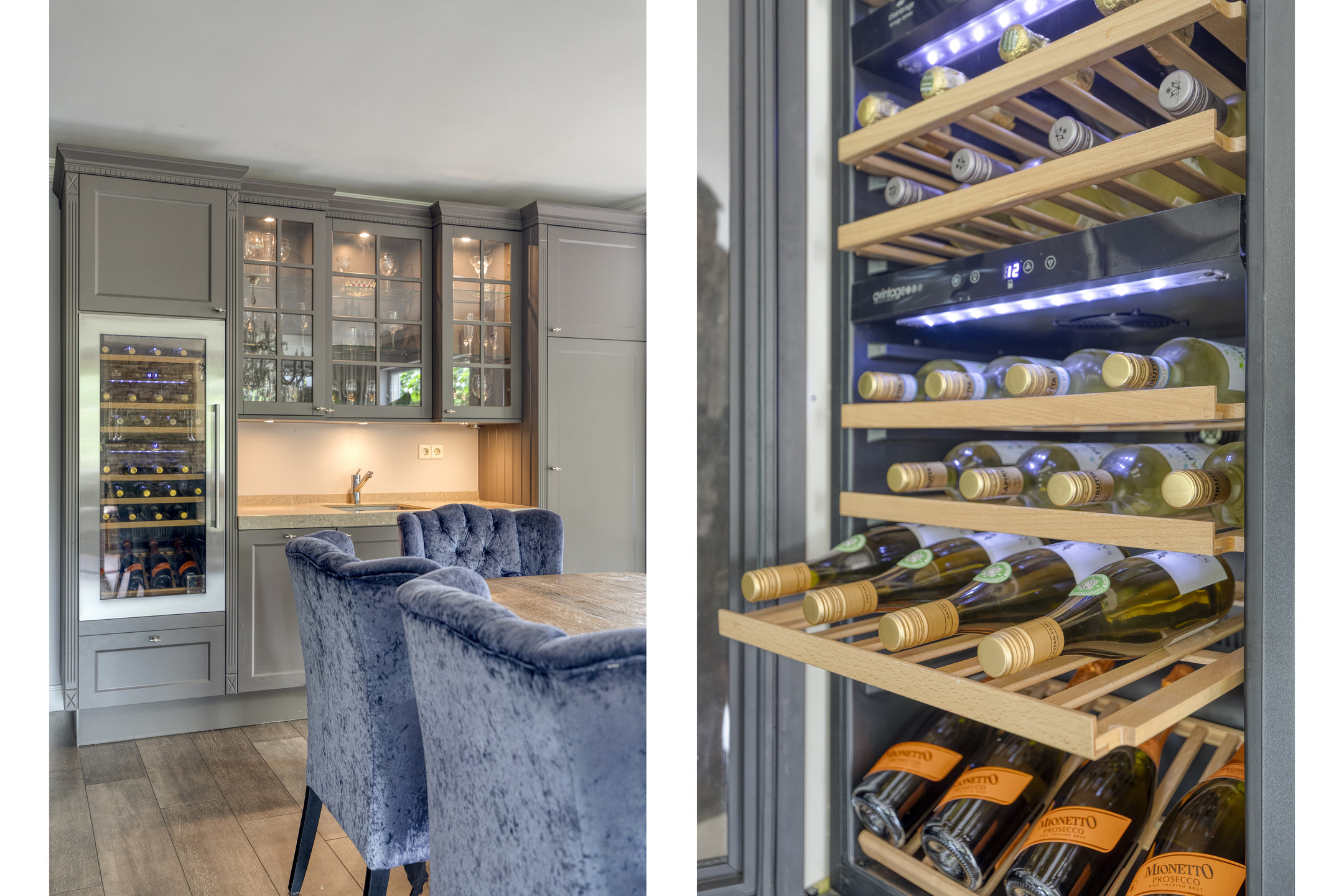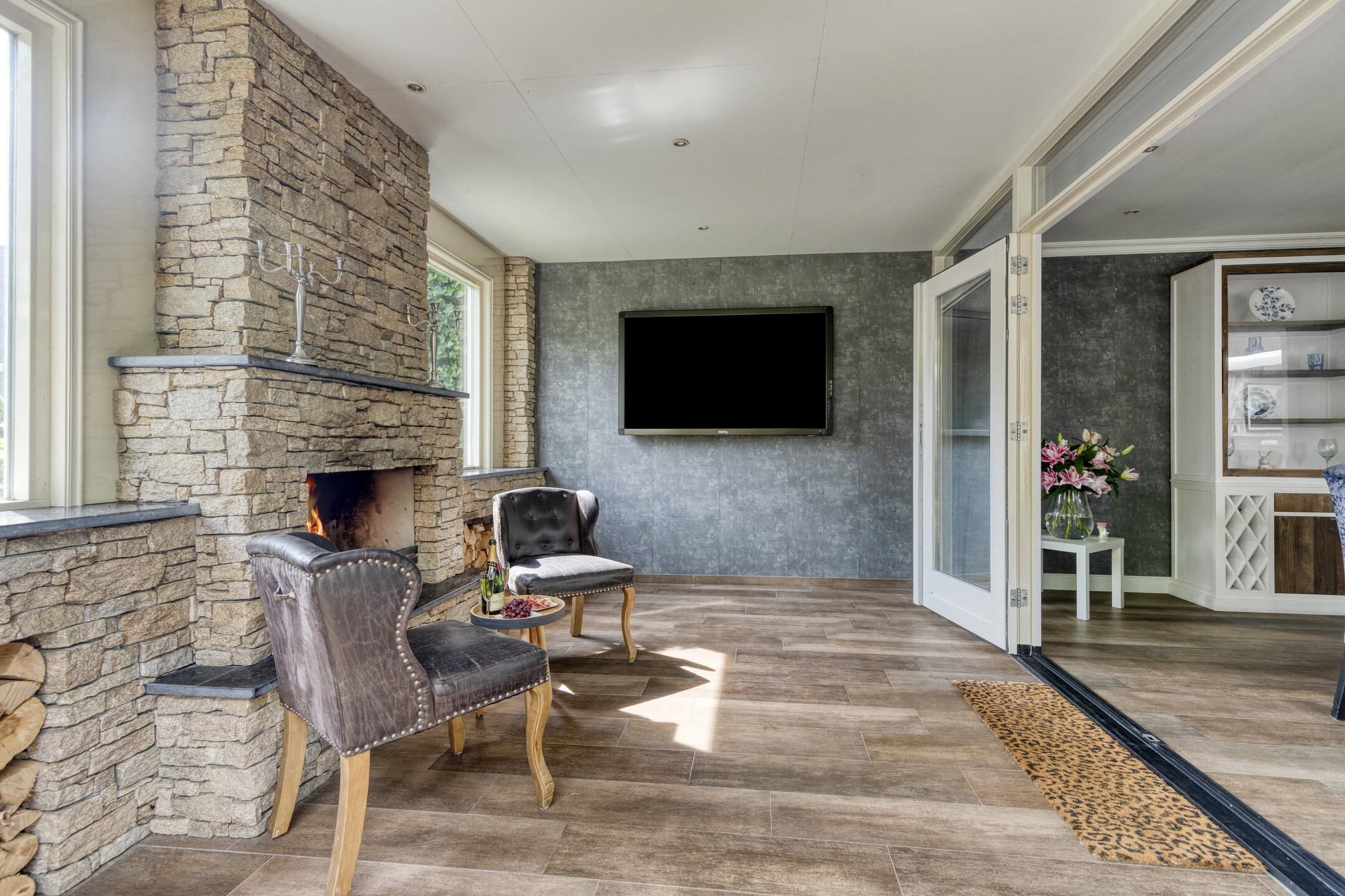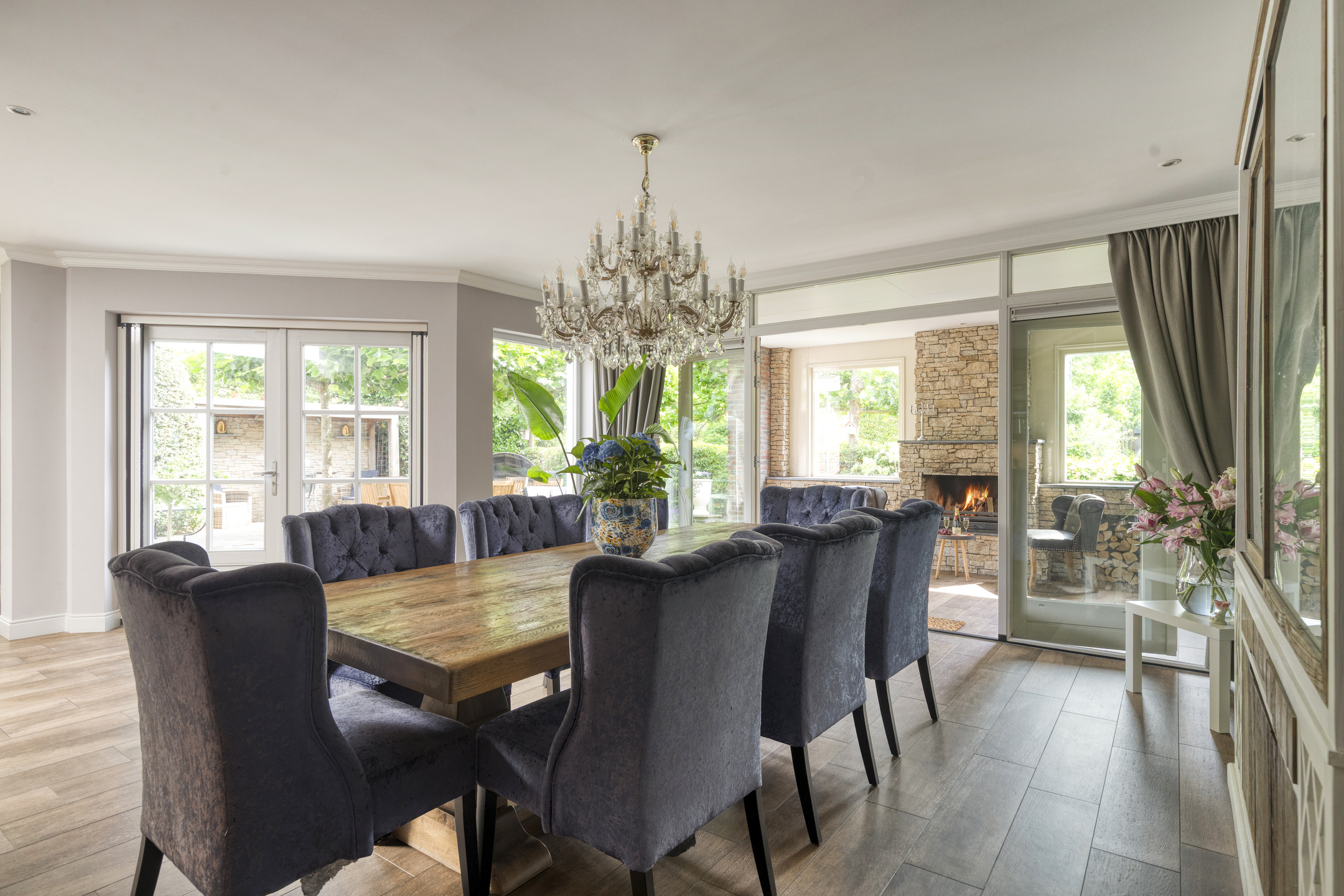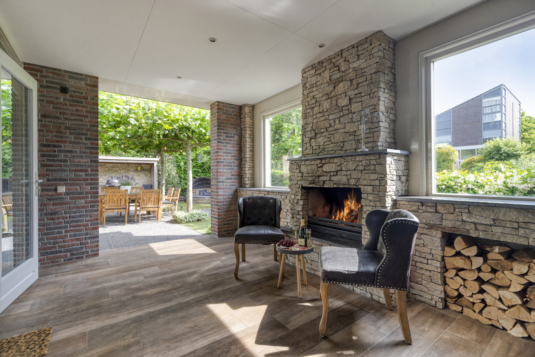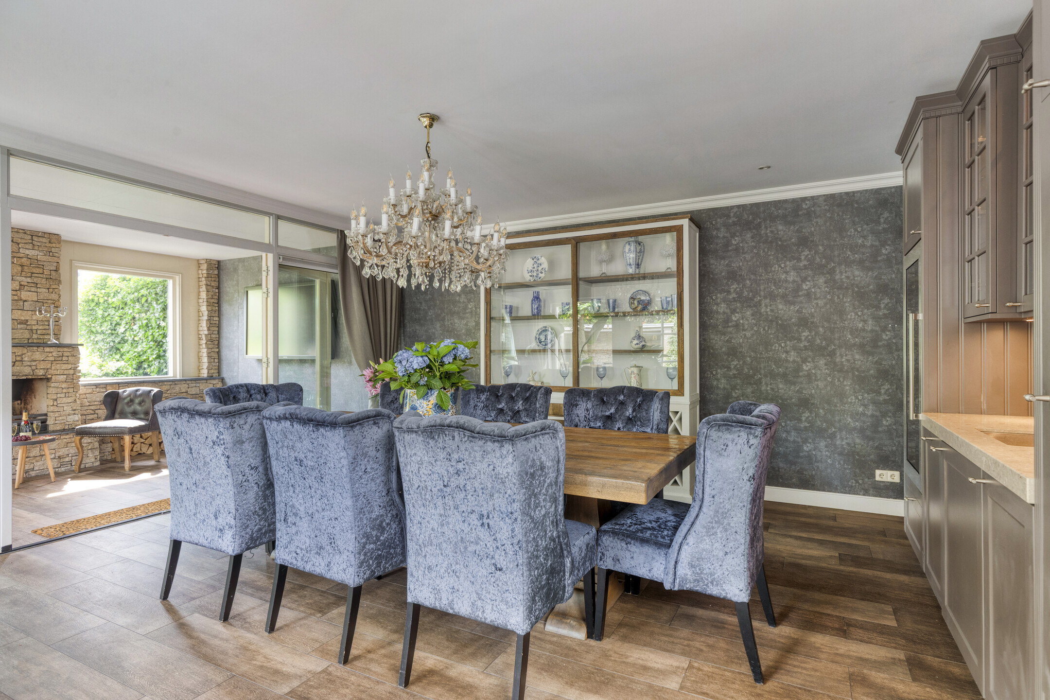 Adjacent to the kitchen is the dining area, which features an additional kitchenette with an extra fridge and a wine climate cabinet. From the dining area, French doors lead to the veranda with fireplace, and another door provides access to the garage. French doors also open to the backyard.
