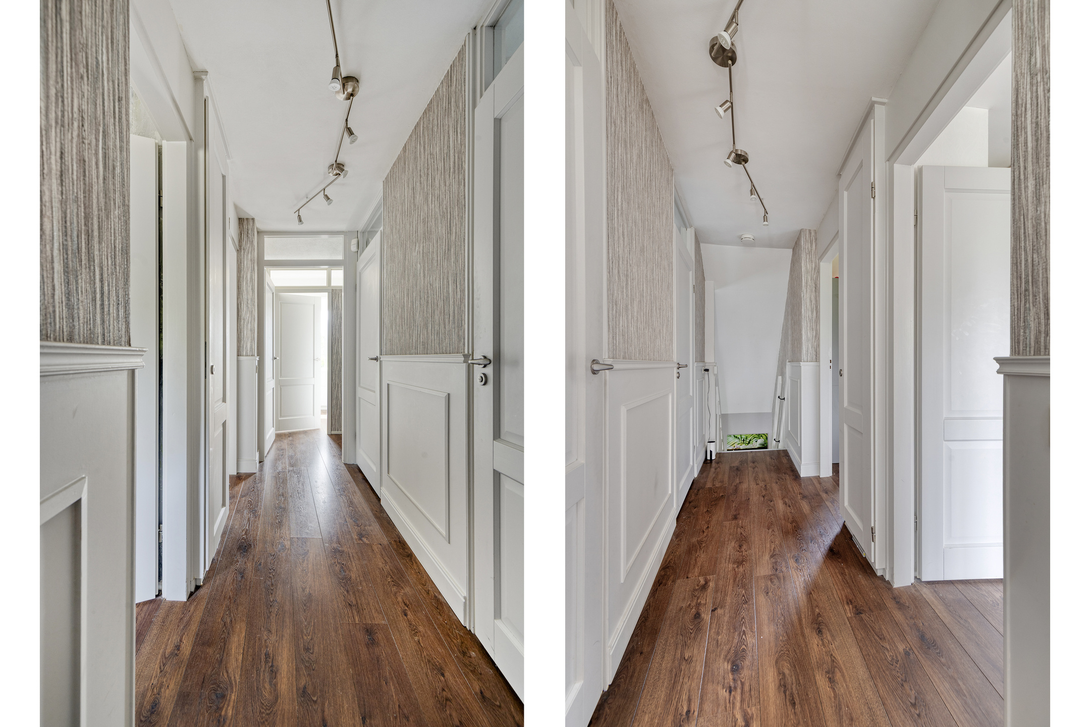 Landing with laminate flooring, providing access to the bedrooms, bathroom, staircase to the second floor, and a storage closet.