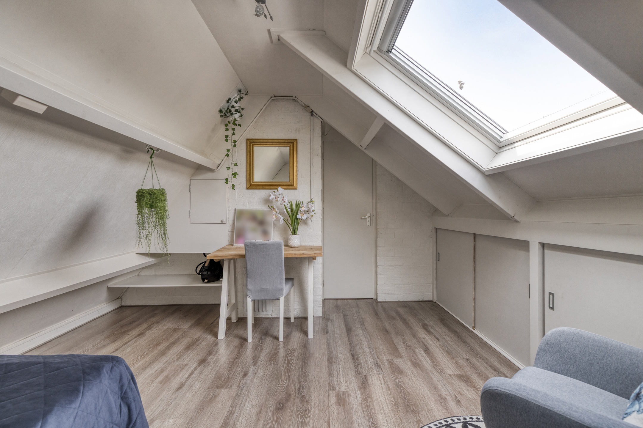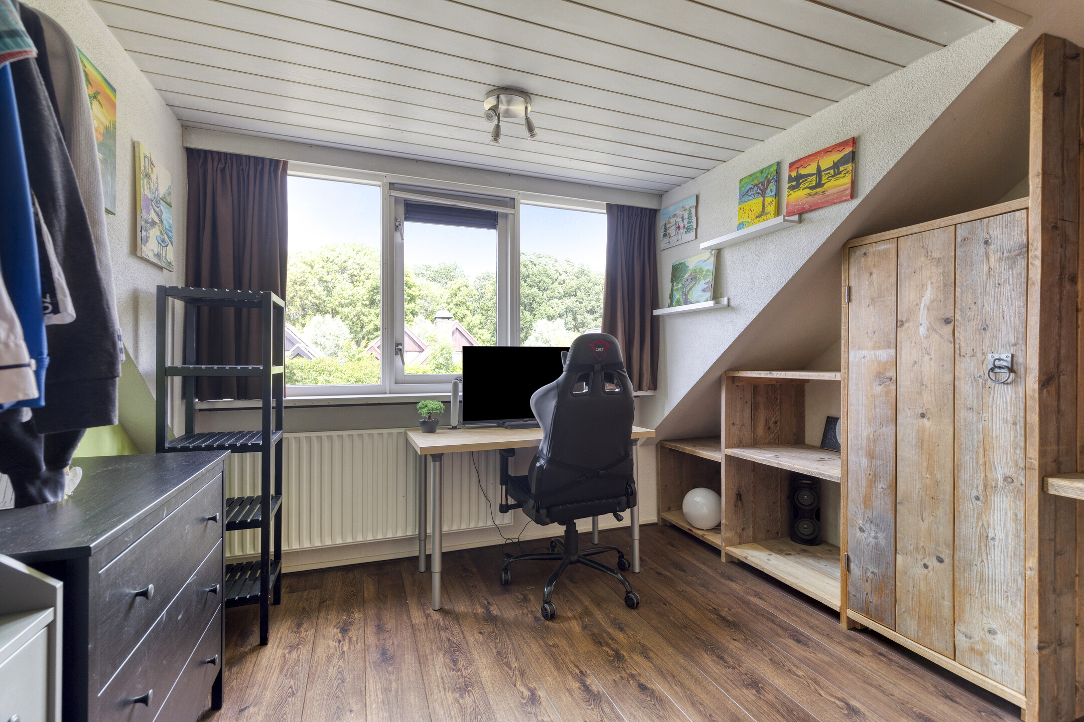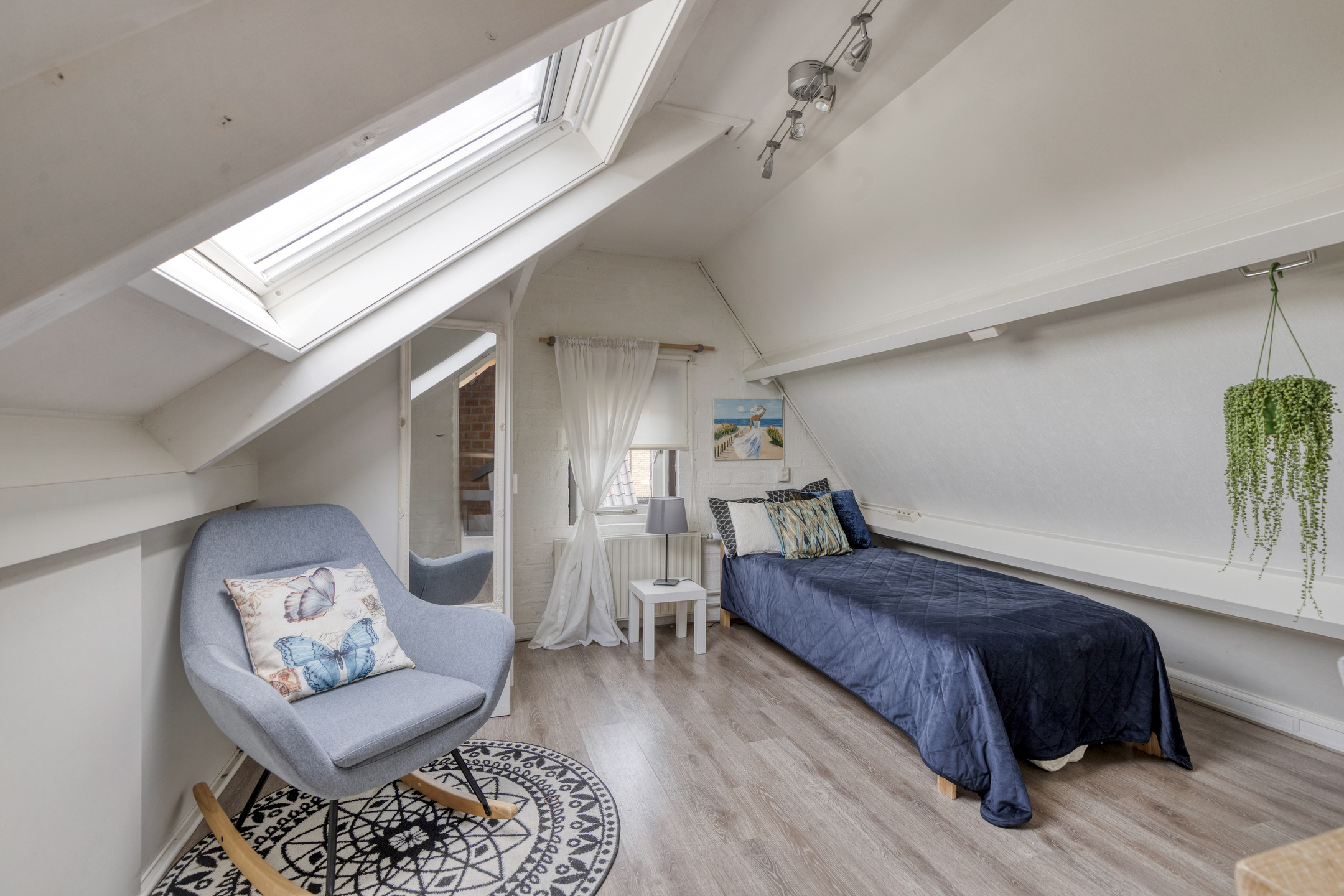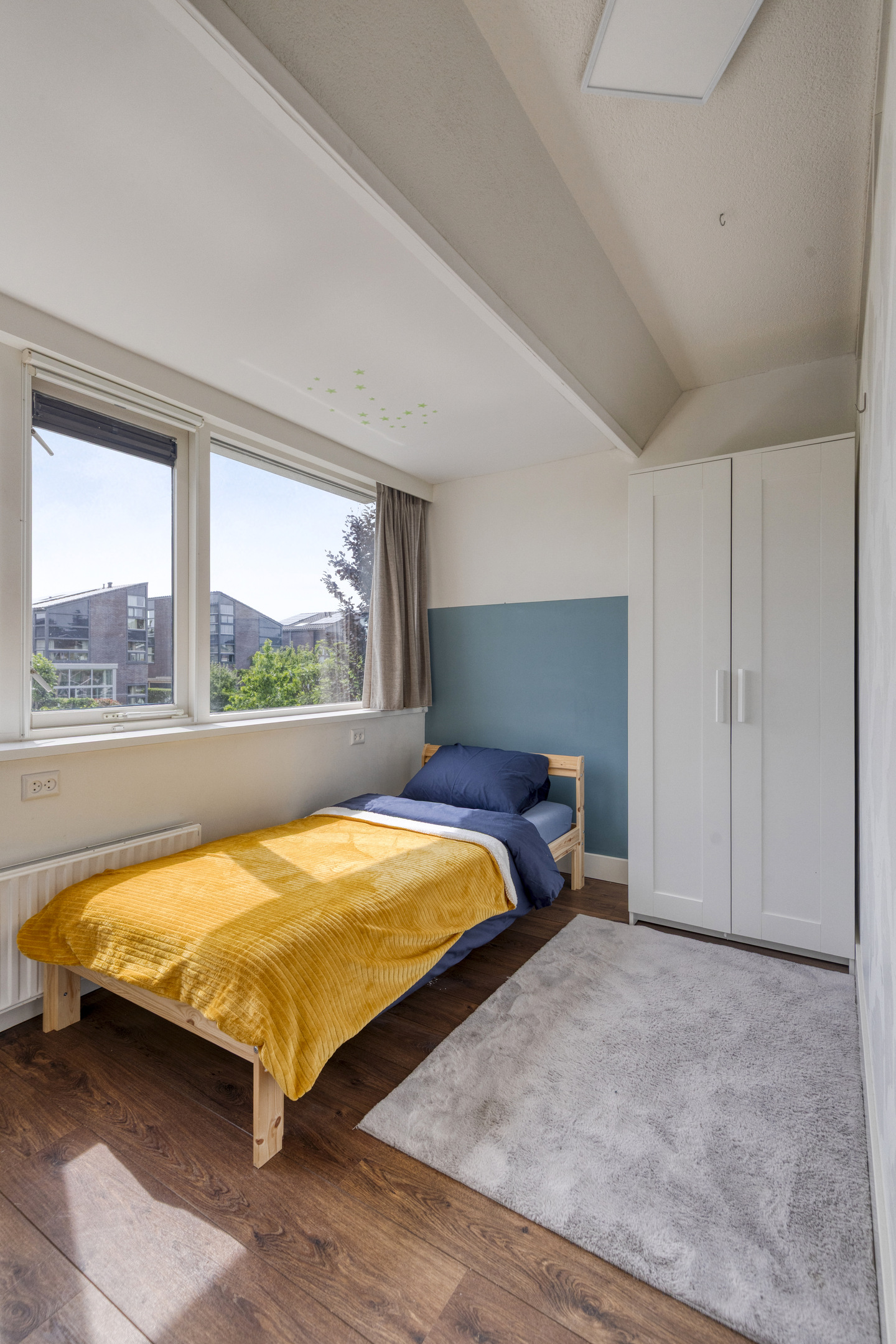 Bedroom with both a roof window and side window, plus a built-in wardrobe. Extra storage space can be found behind the knee walls under the sloped roof.