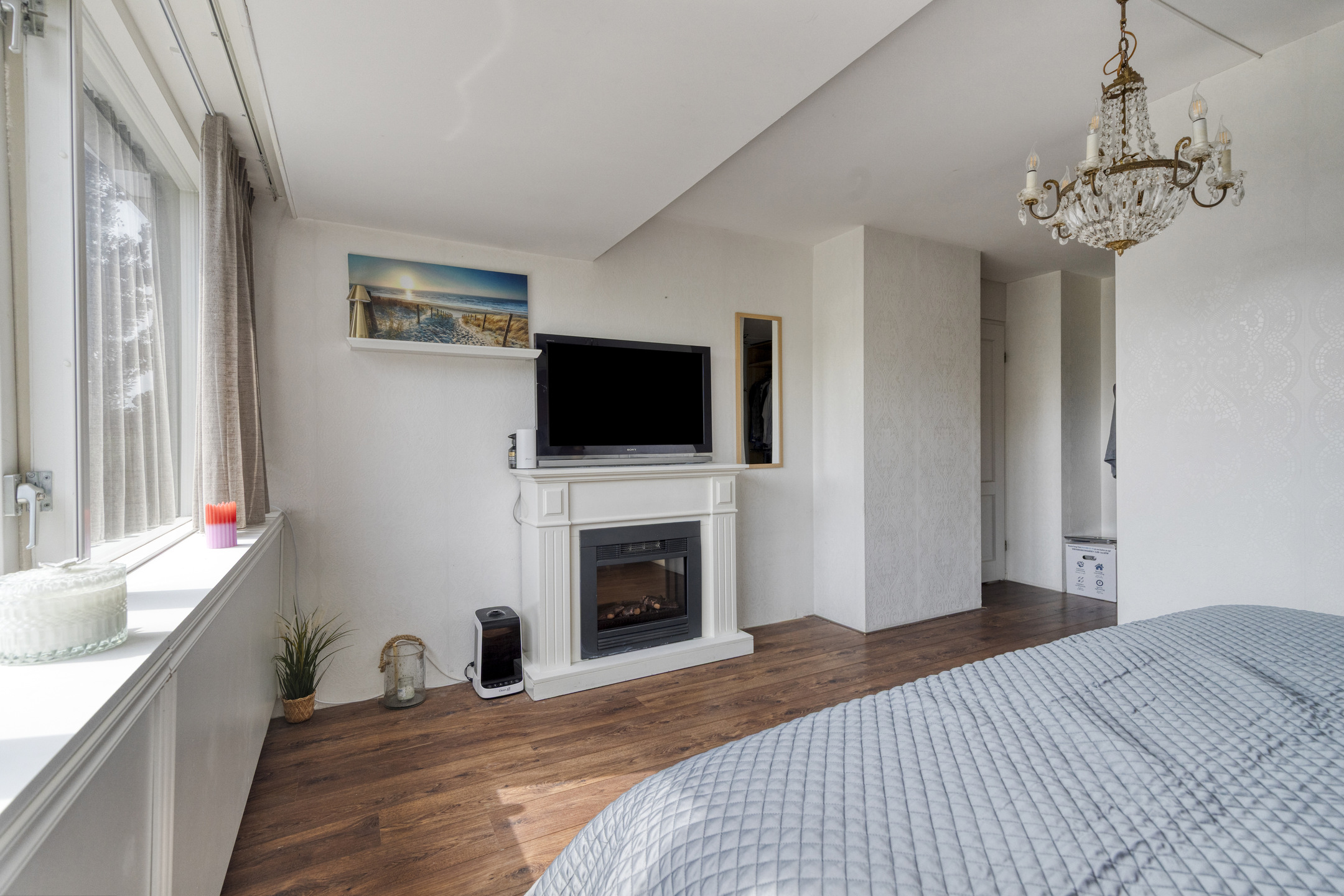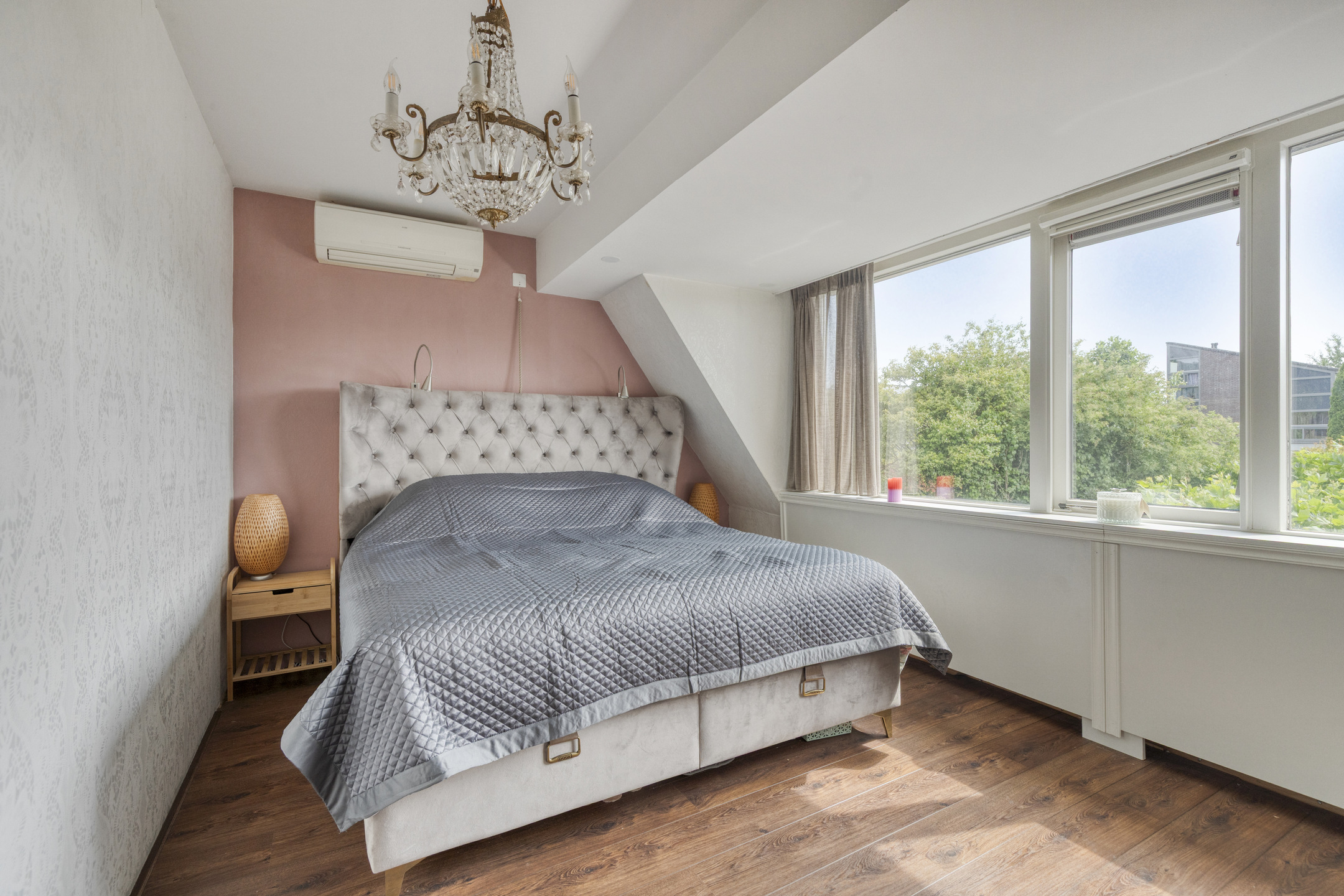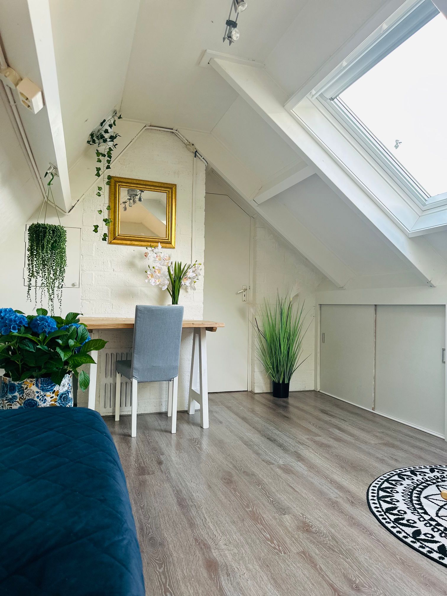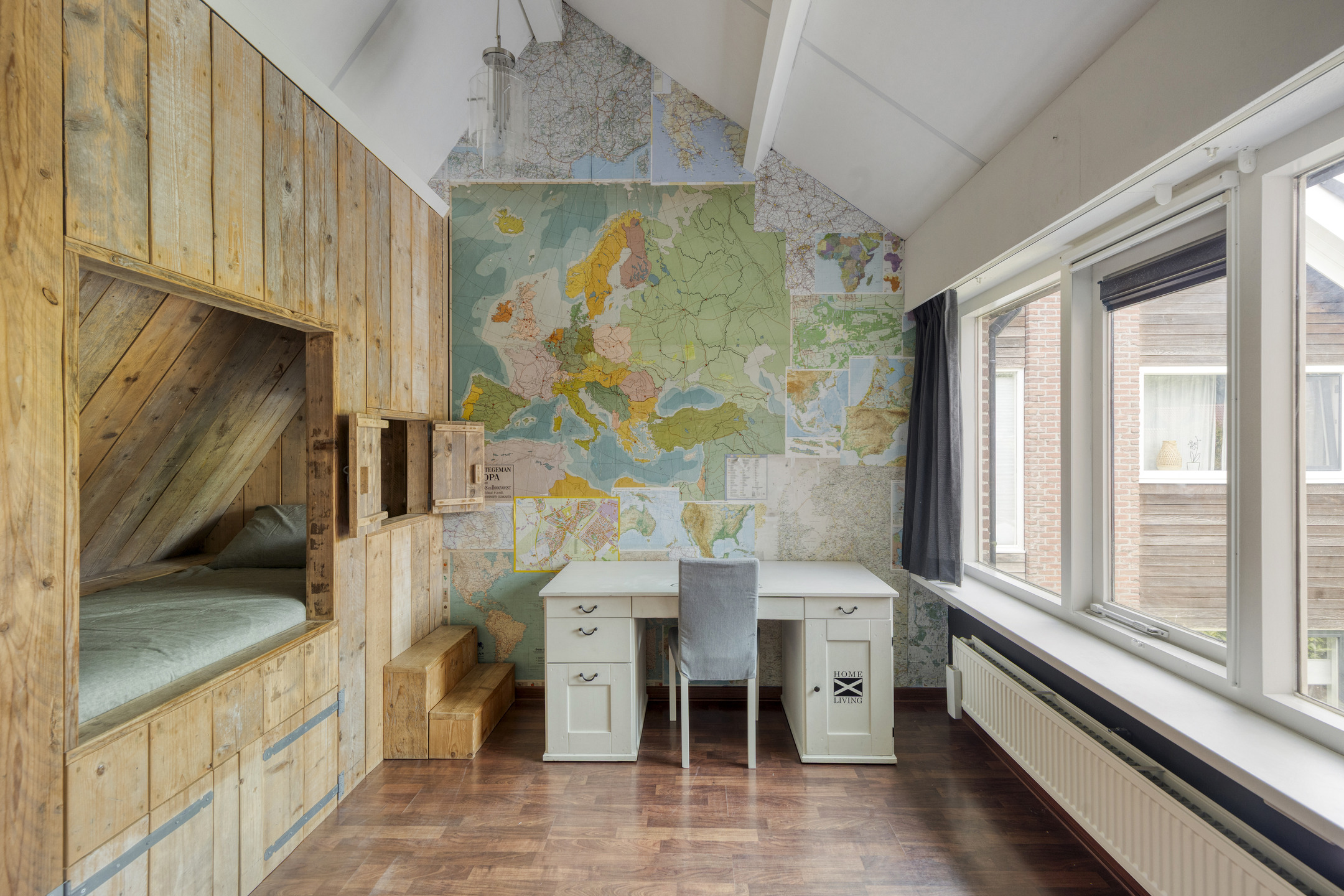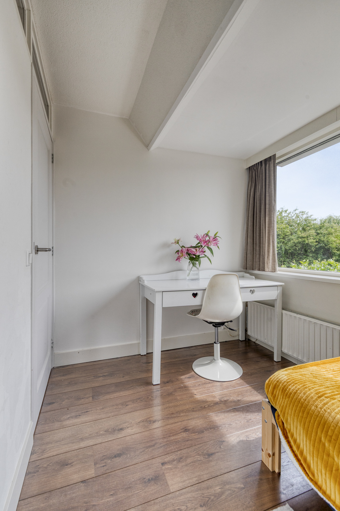Bedroom with both a roof window and side window, plus a built-in wardrobe. Extra storage space can be found behind the knee walls under the sloped roof.