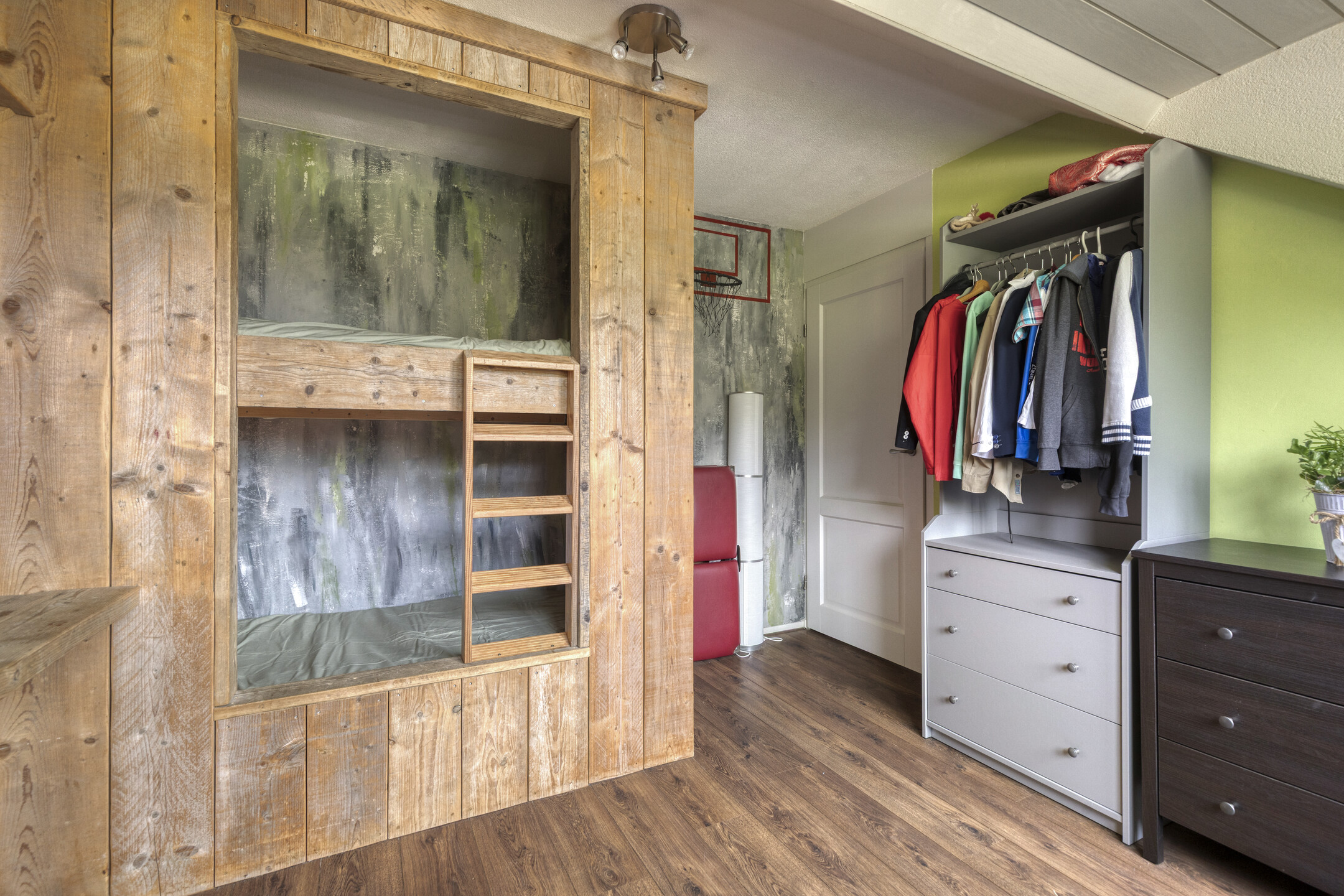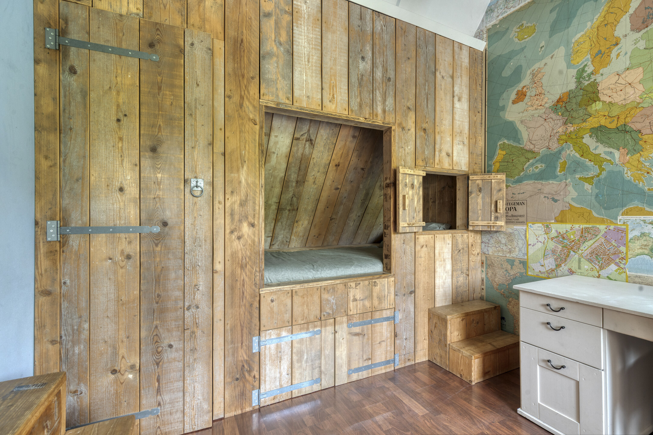 Another bedroom located above the garage, featuring a custom-built wooden bed and built-in wardrobe.
