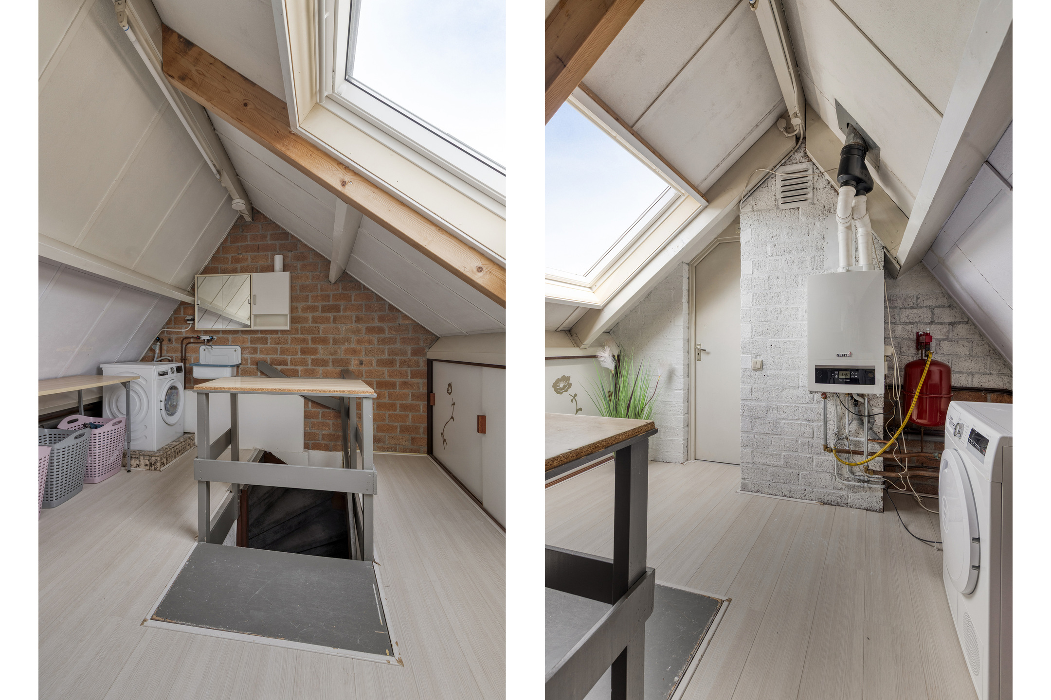 Spacious landing with roof window, washbasin, and connections for a washing machine and dryer, as well as the central heating unit.