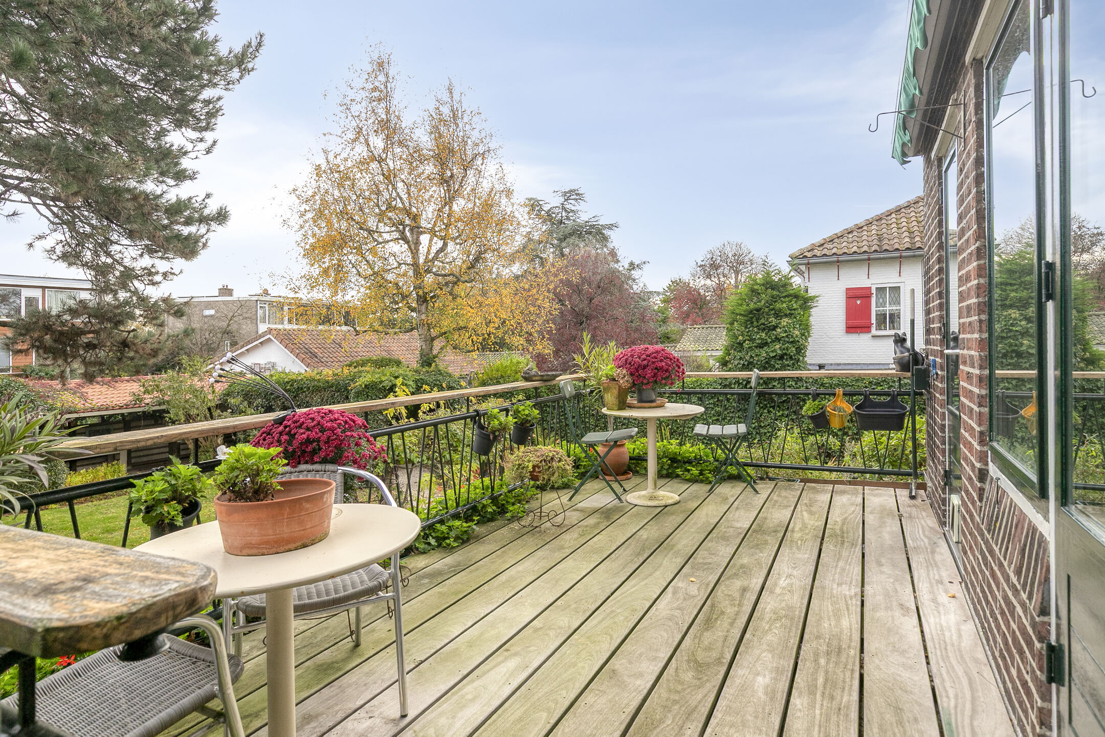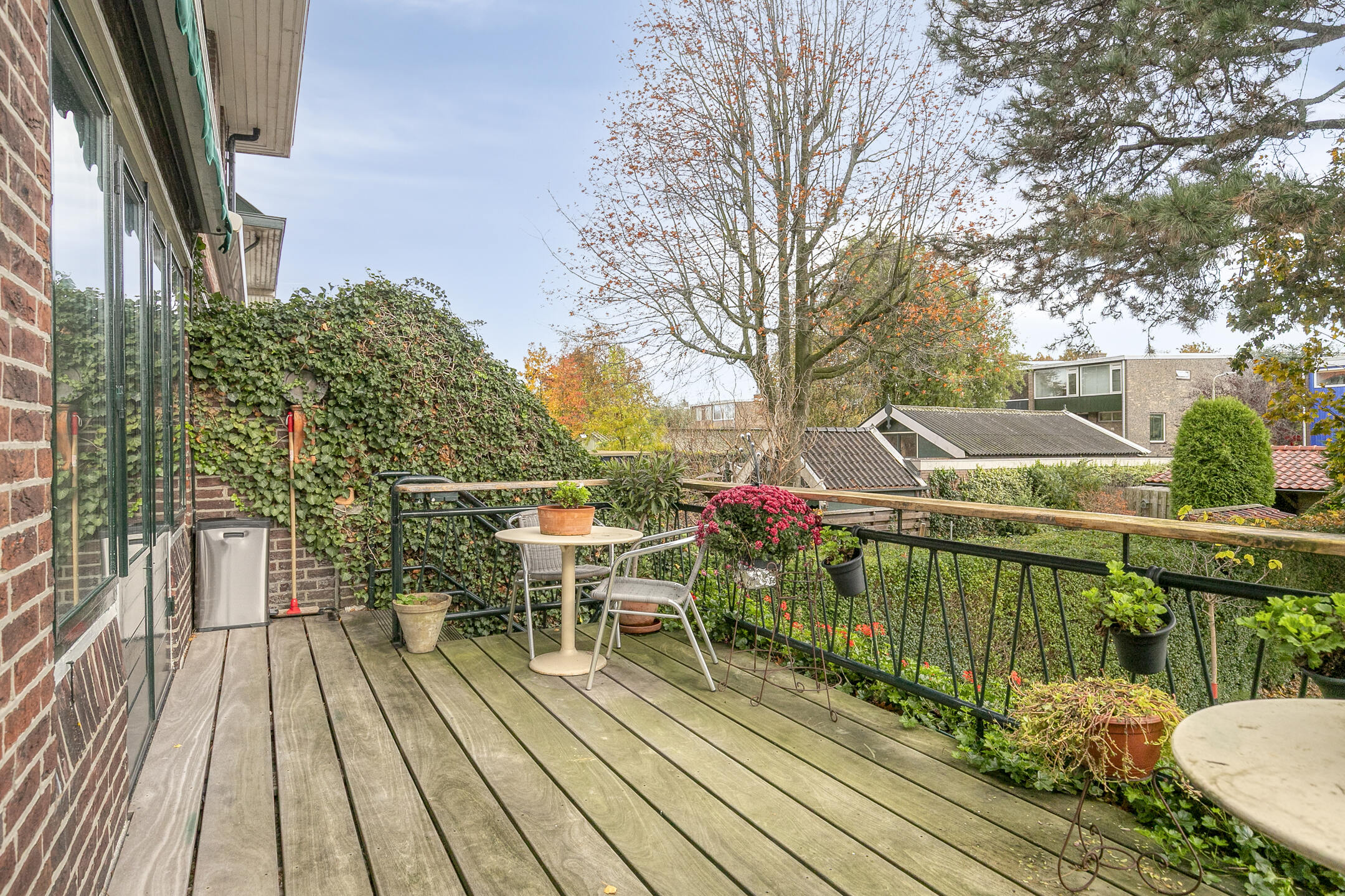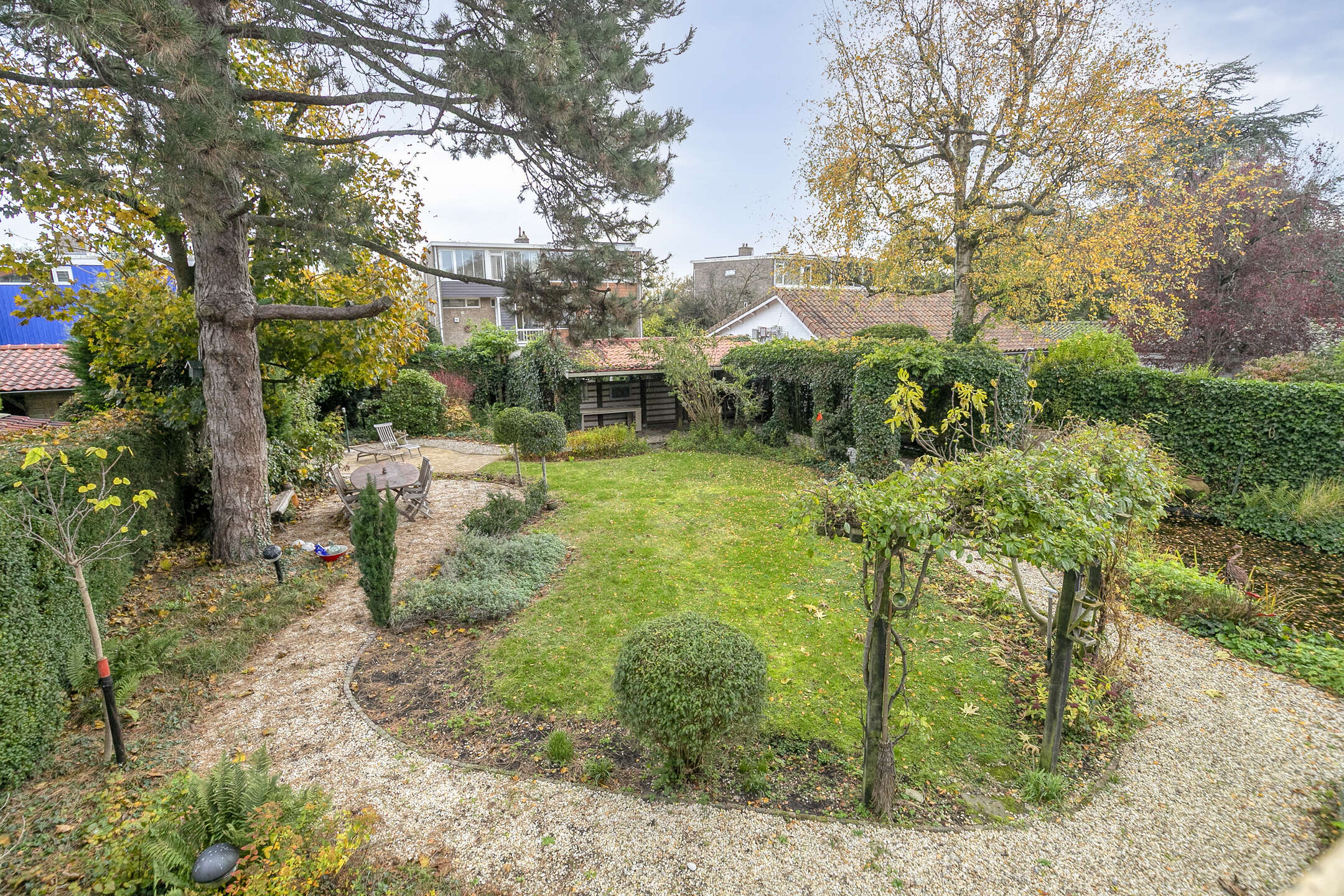 The garden is green, well maintained and provides lots of privacy. With multiple terraces you can enjoy both sun and shade throughout the day. The pond adds to the tranquil atmosphere.