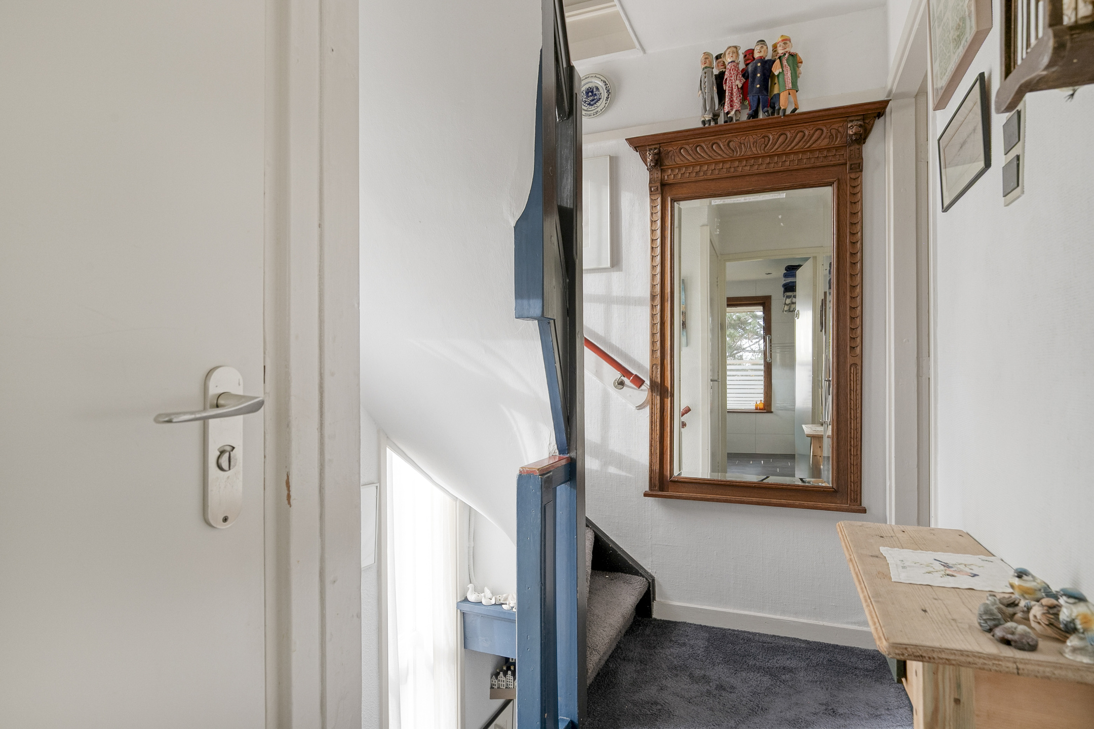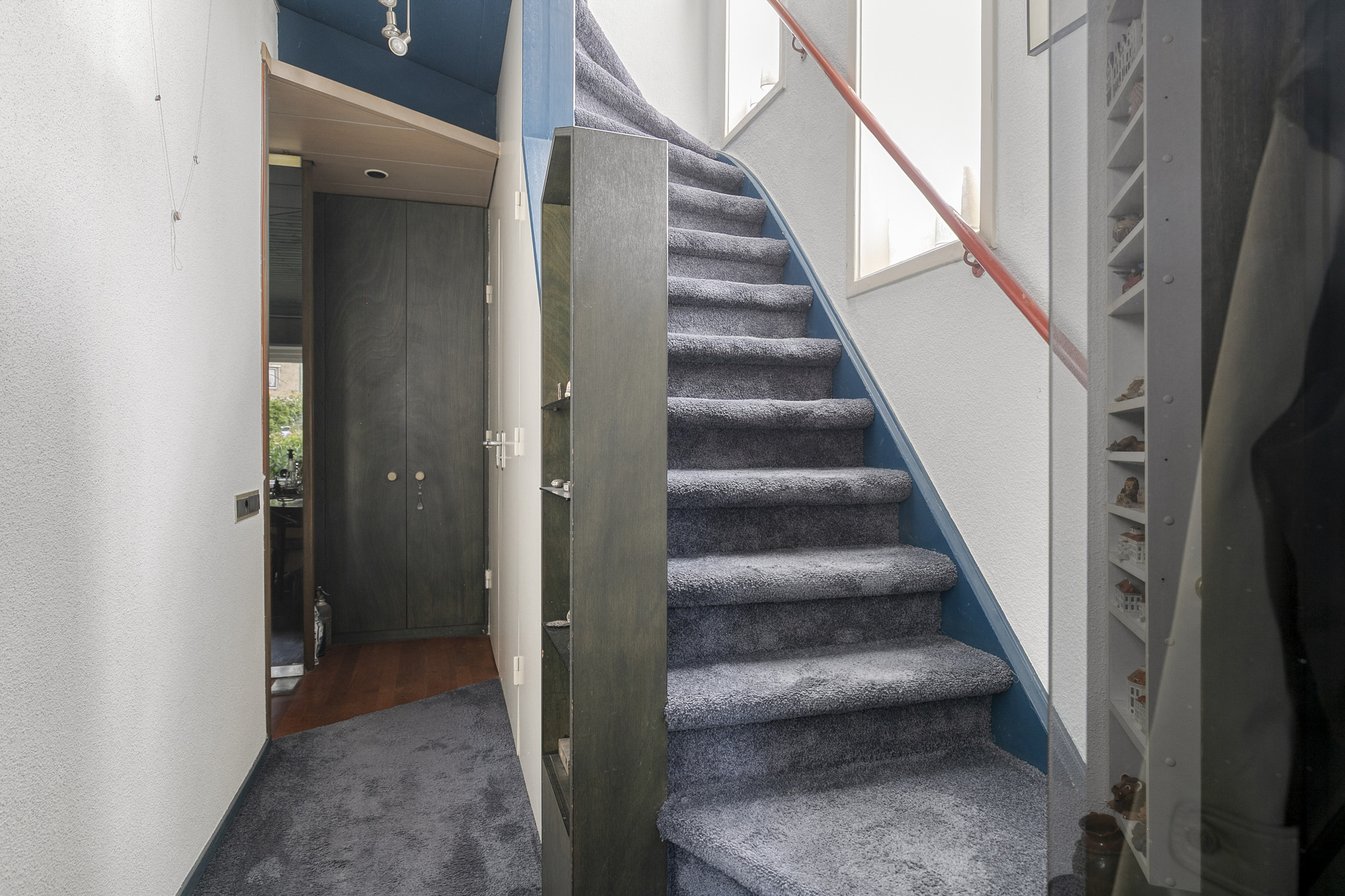 Through the entrance you step into the hall with the meter cupboard, toilet, staircase to the first floor, and access to both the living room and the basement level (souterrain).