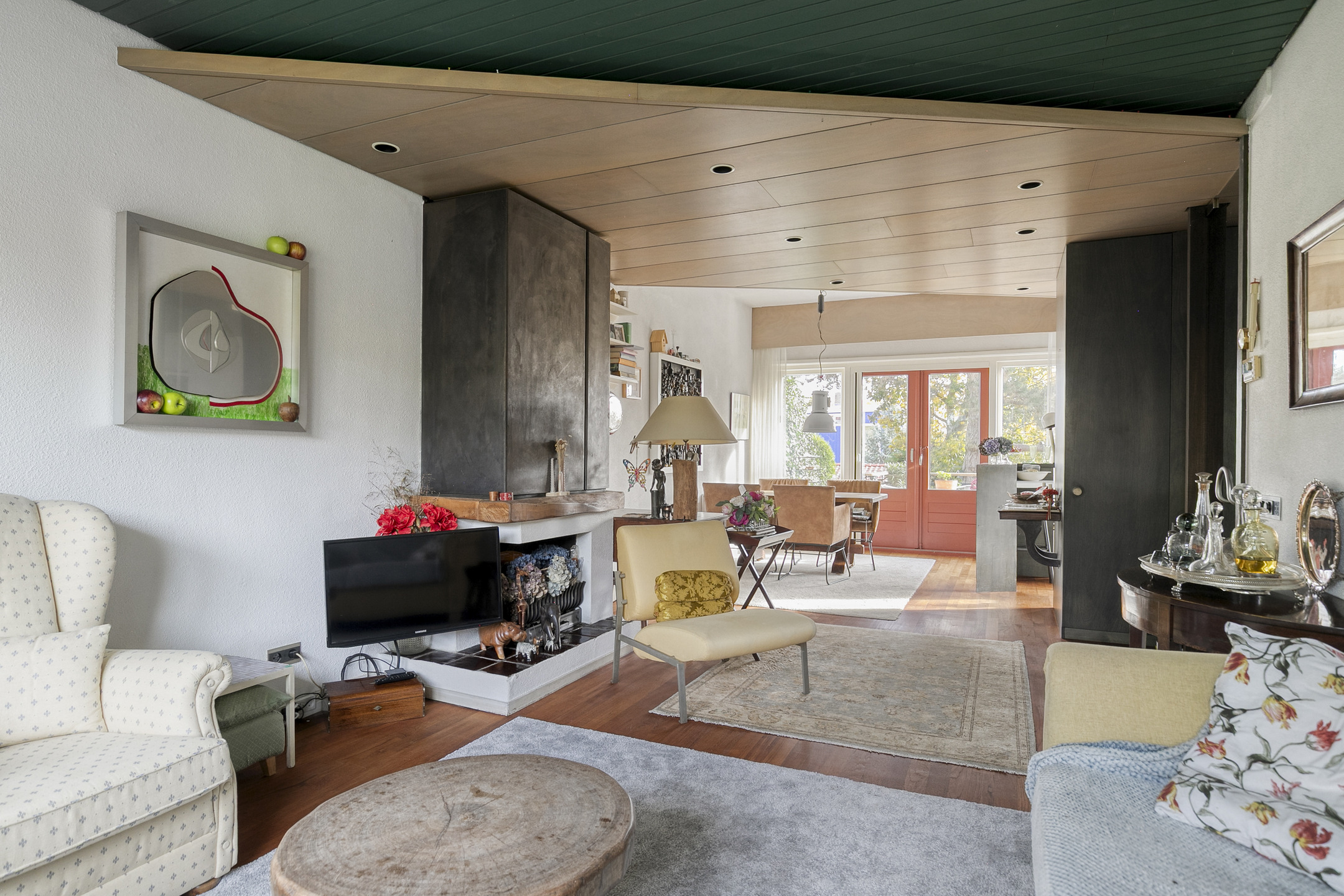The living room at the front is atmospheric and features a fireplace and a beautiful wooden parquet floor.