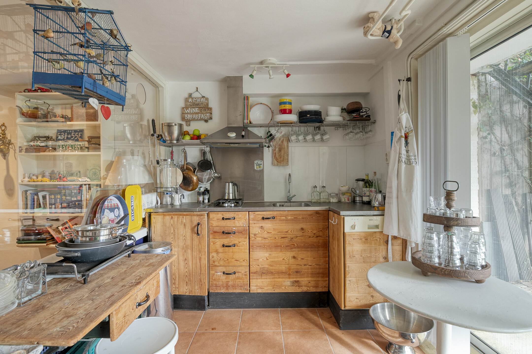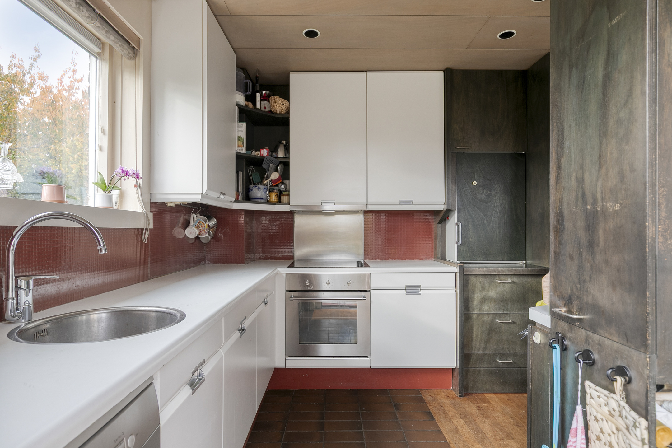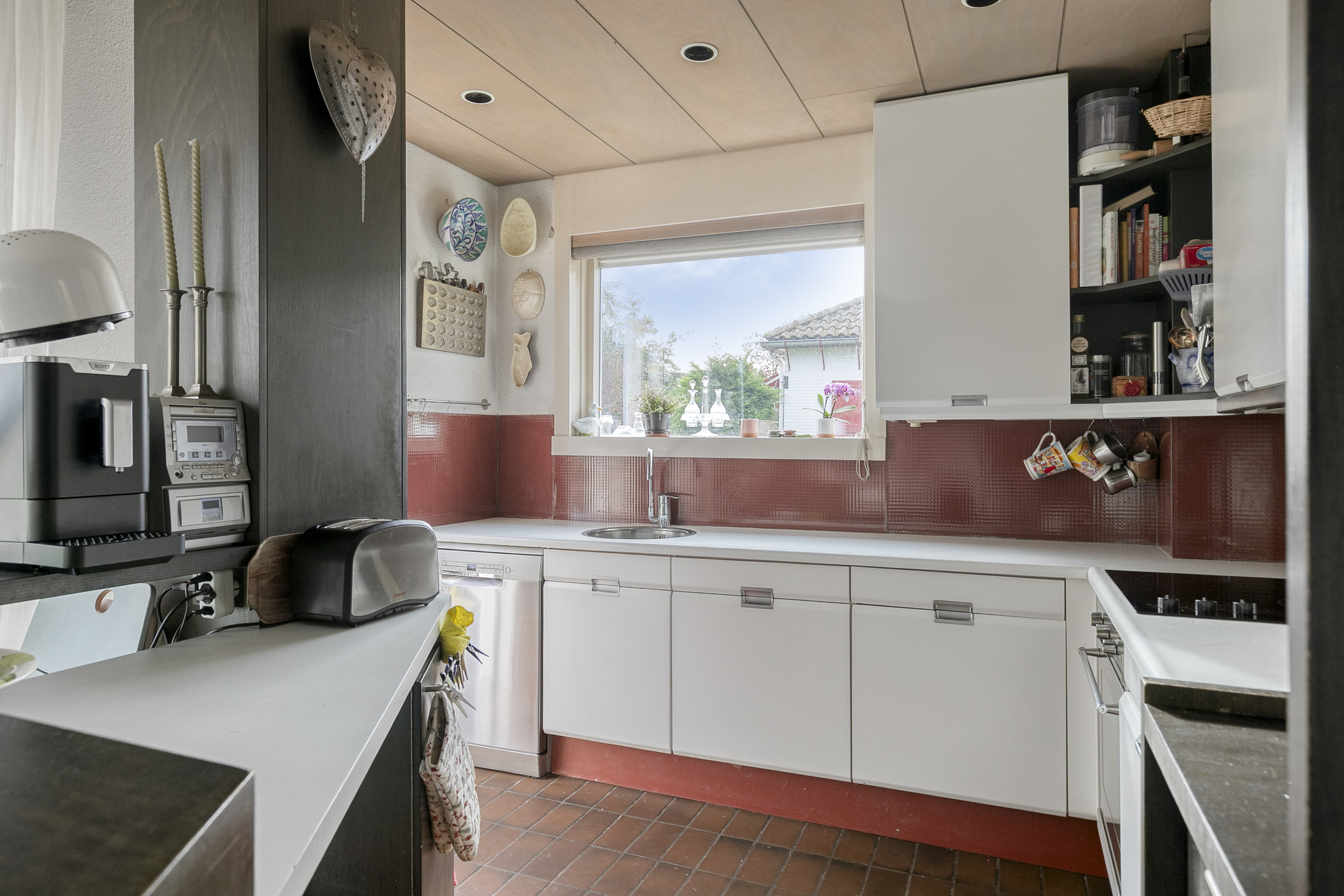 At the rear you will find the kitchen, equipped with a refrigerator, dishwasher, oven and induction hob. An electric sunshade spans the full width of the property.