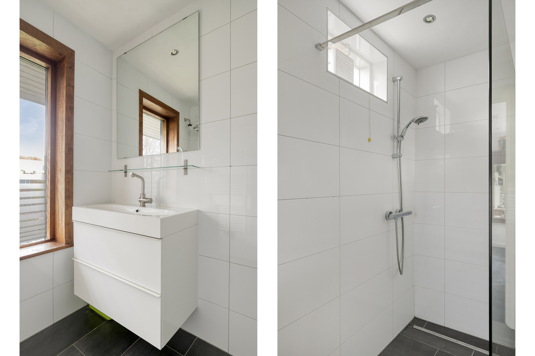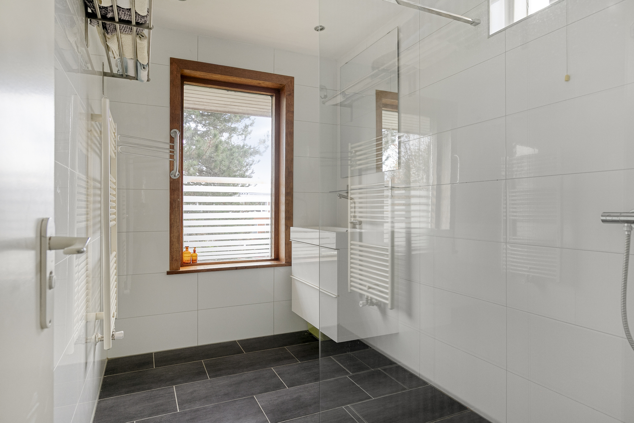 The neat bathroom is equipped with a shower, washbasin and towel radiator.