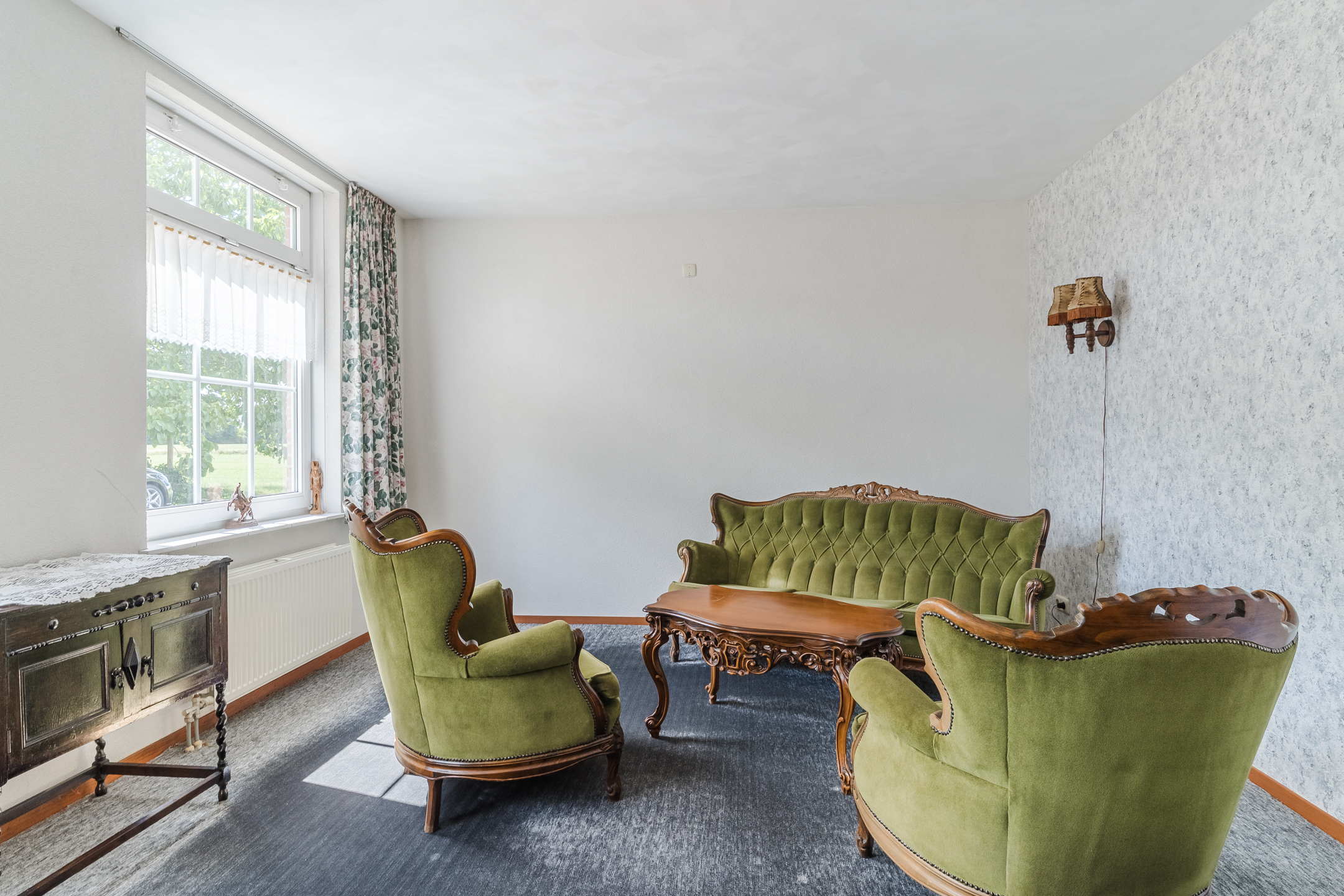 Approx. 46 m², with tiled flooring and underfloor heating, granol walls, plastered ceiling with recessed lighting, closed wood-burning fireplace, sliding doors to the front garden, and ensuite doors to the kitchen.