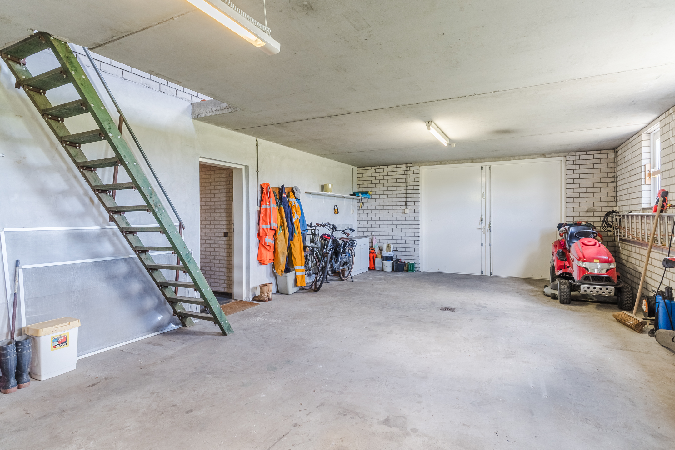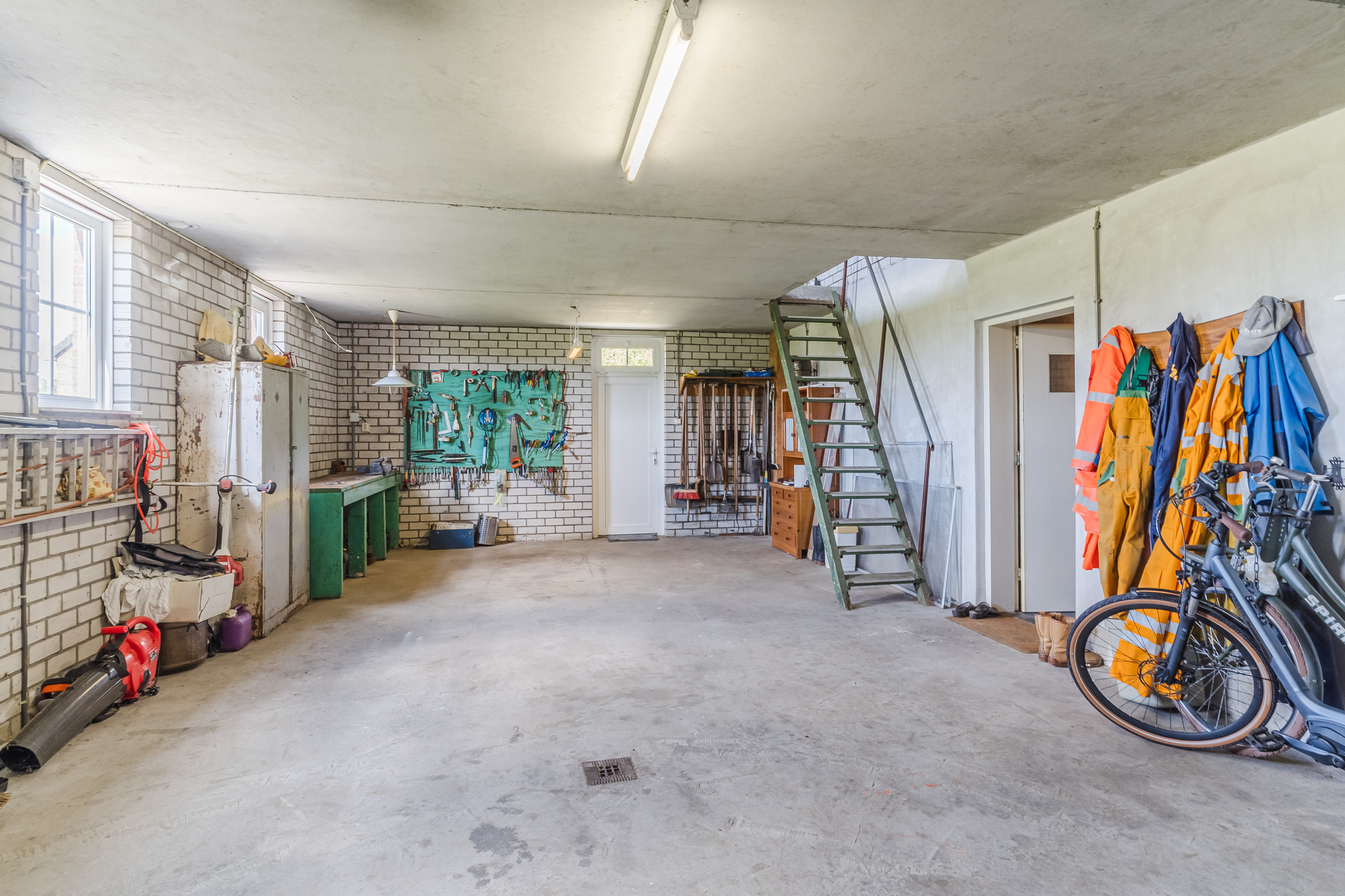 Approx. 50 m², concrete floor, brick walls, manual garage door, garden door, and washbasin.