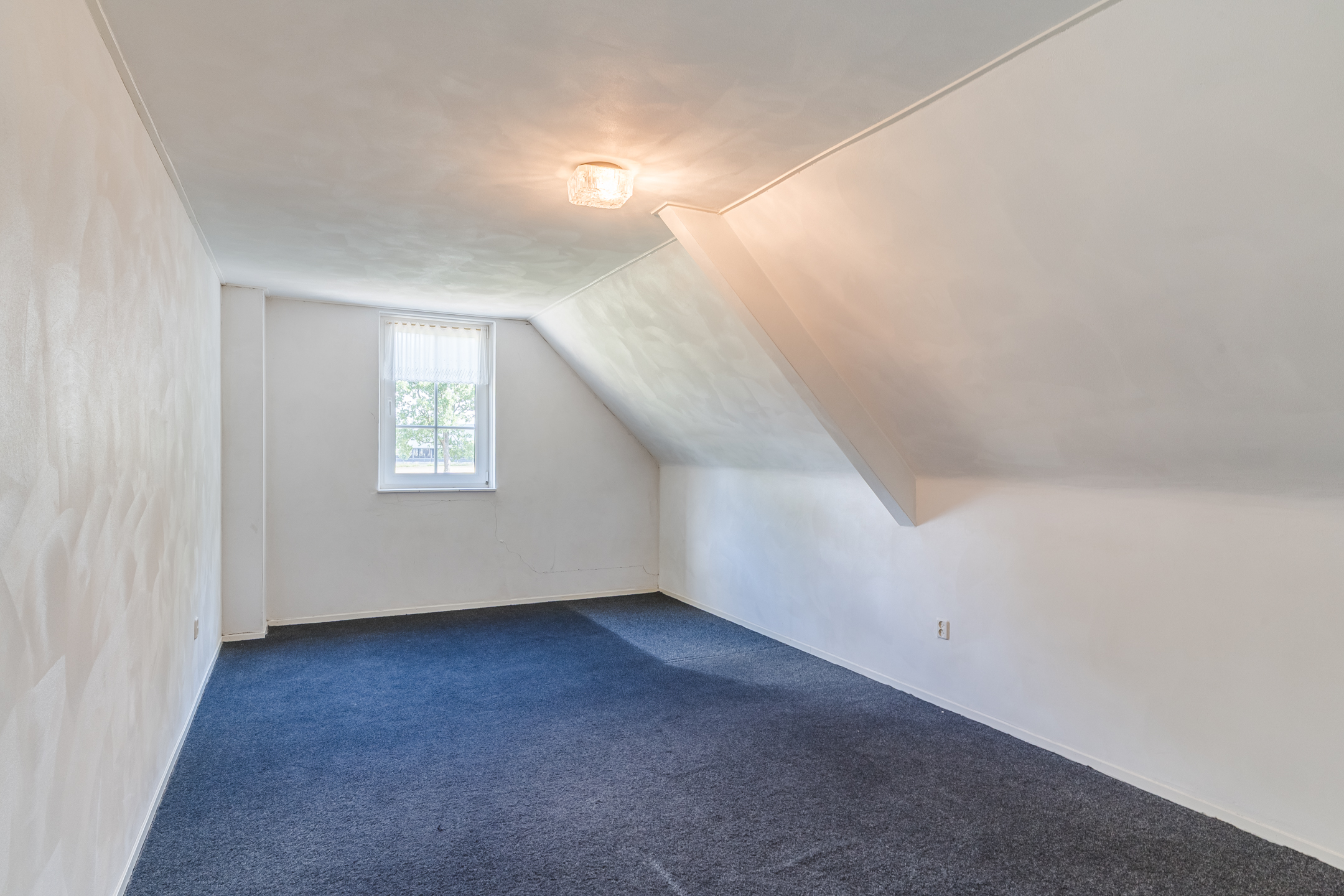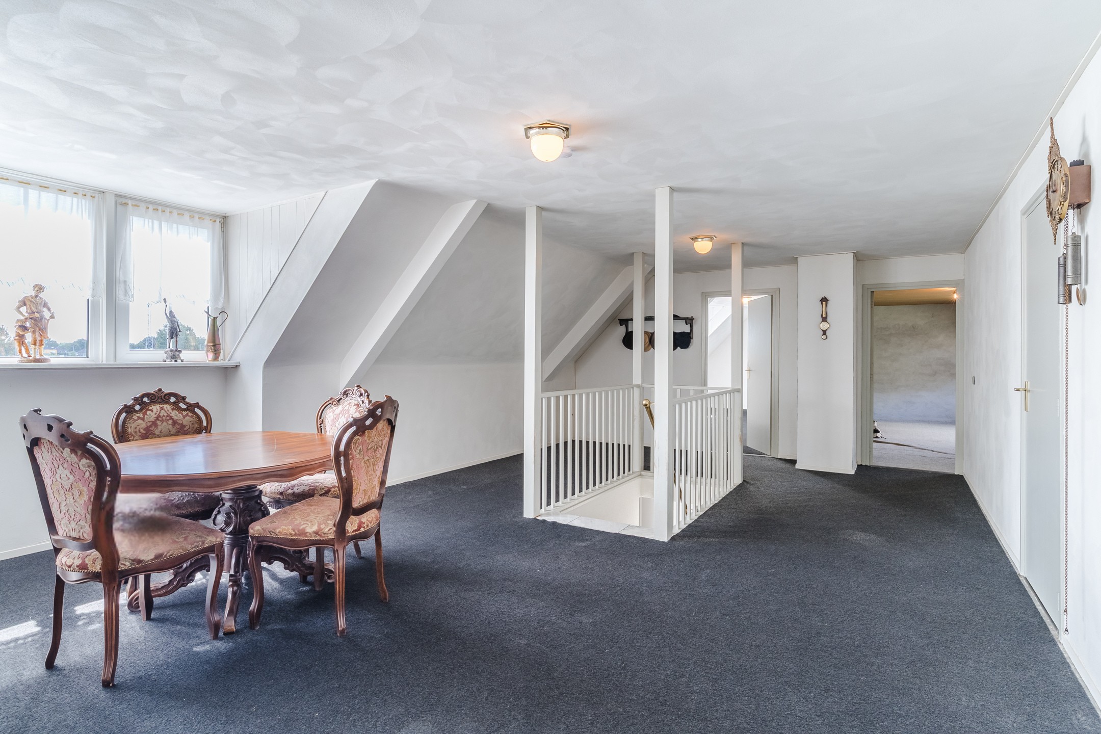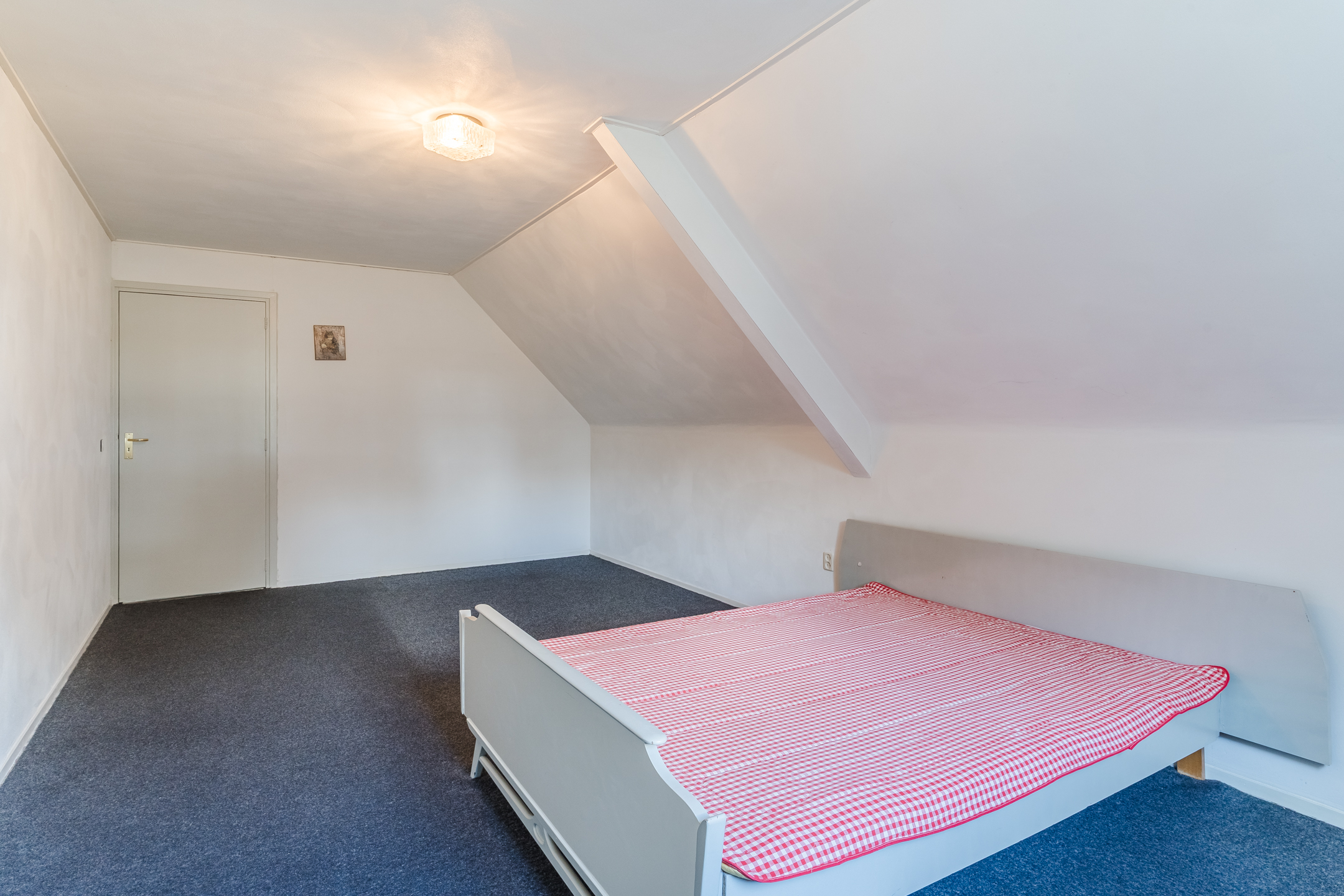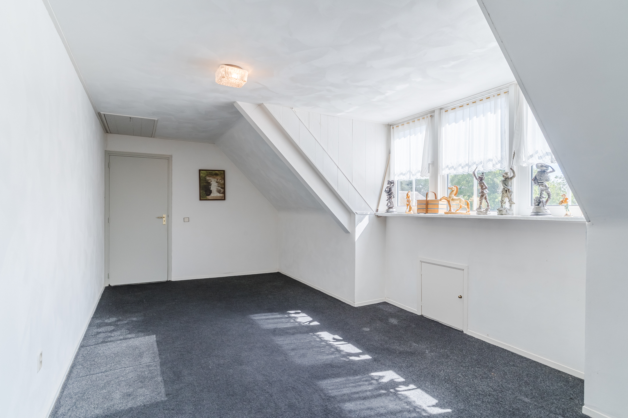 Approx. 34.5 m², carpet flooring, plastered walls and ceiling, with dormer window. Access to 3 bedrooms, storage room and unfinished bathroom.
