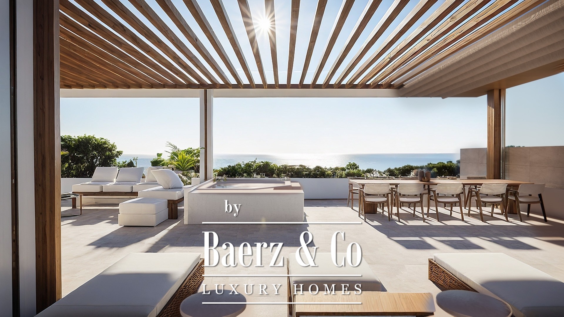 Each level is crafted for flow and discretion. The basement features a garage for up to four cars, a full bathroom with sauna, and a versatile room suited for cinema or sport. The ground floor’s double-height living area opens seamlessly onto a sunlit garden and swimming pool, with an open kitchen and two guest suites extending directly to the outdoors. Upstairs, two further double bedrooms and a dedicated fitness room complement the 34 m² master suite, which enjoys open views across the treetops. At the apex, a panoramic attic terrace with sea views and a rooftop pool-jacuzzi invites relaxation or private gatherings.