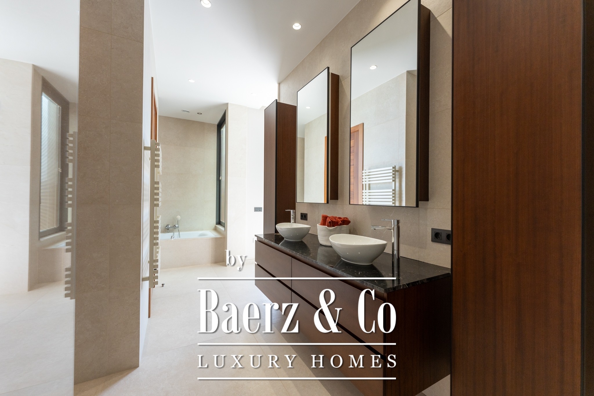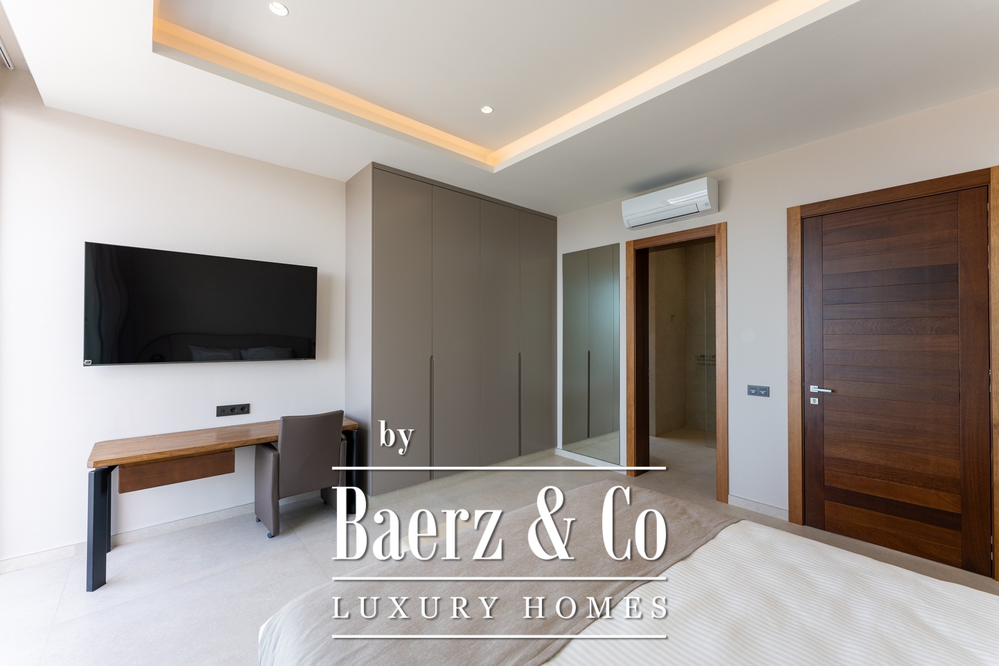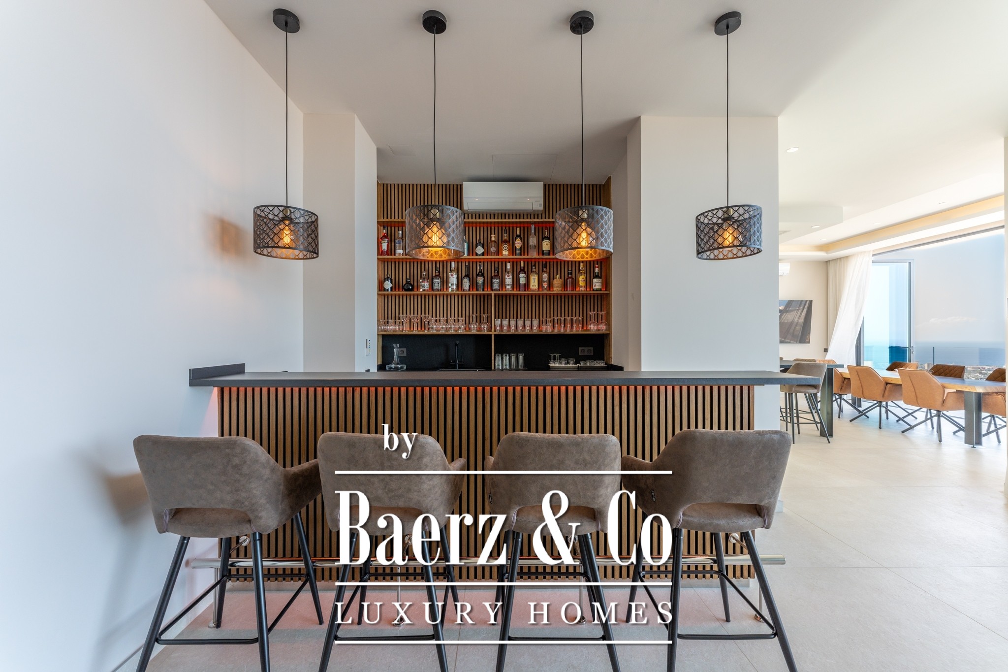 Inside, the living spaces are distinguished by calm spatial rhythms and high standards of craftsmanship. The ground floor integrates a bedroom, a convivial living area with a designer kitchen and bar, and seamless access to terraces tailored for effortless outdoor living. All four en-suite bedrooms are generously proportioned. Six bathrooms provide a refined touch, while a separate guest apartment complete with kitchen extends hospitality.