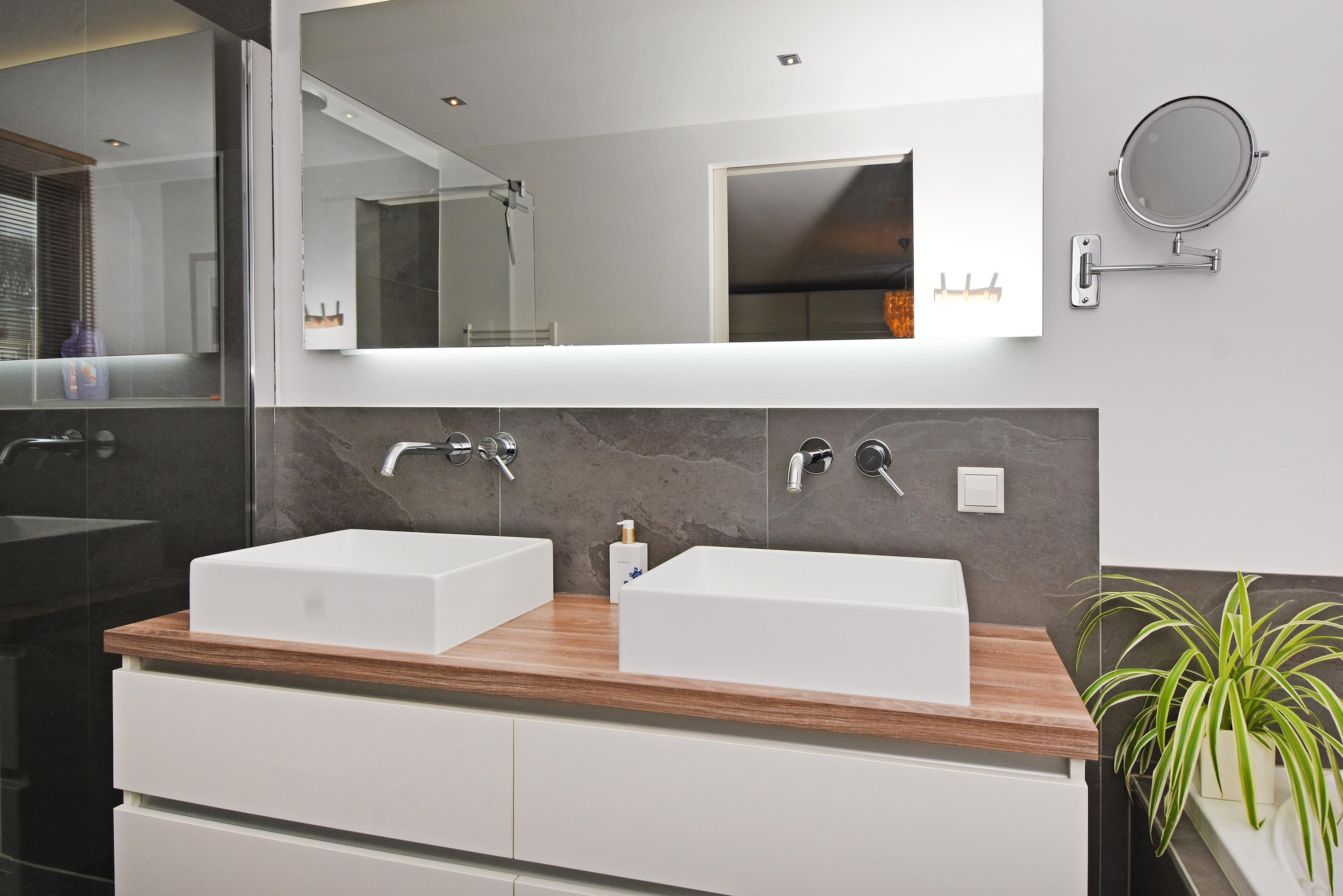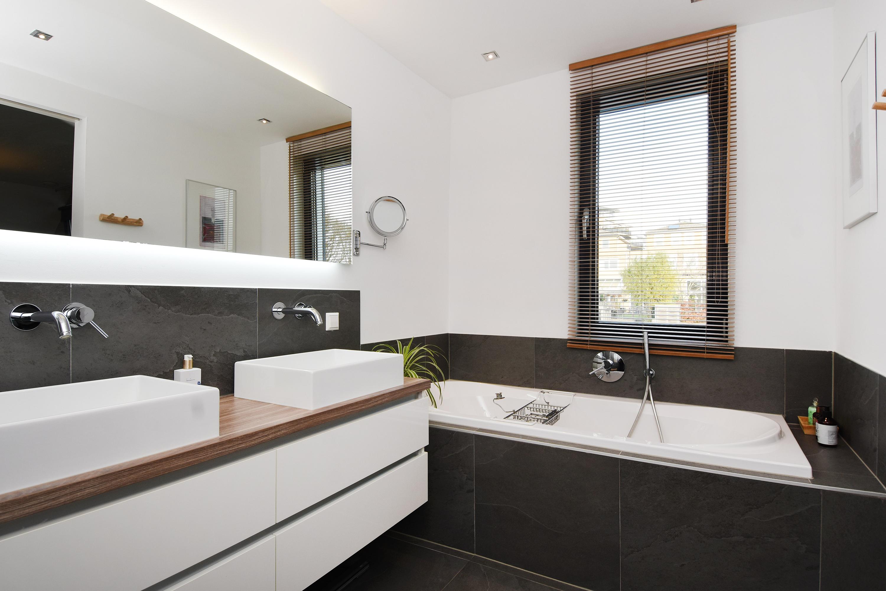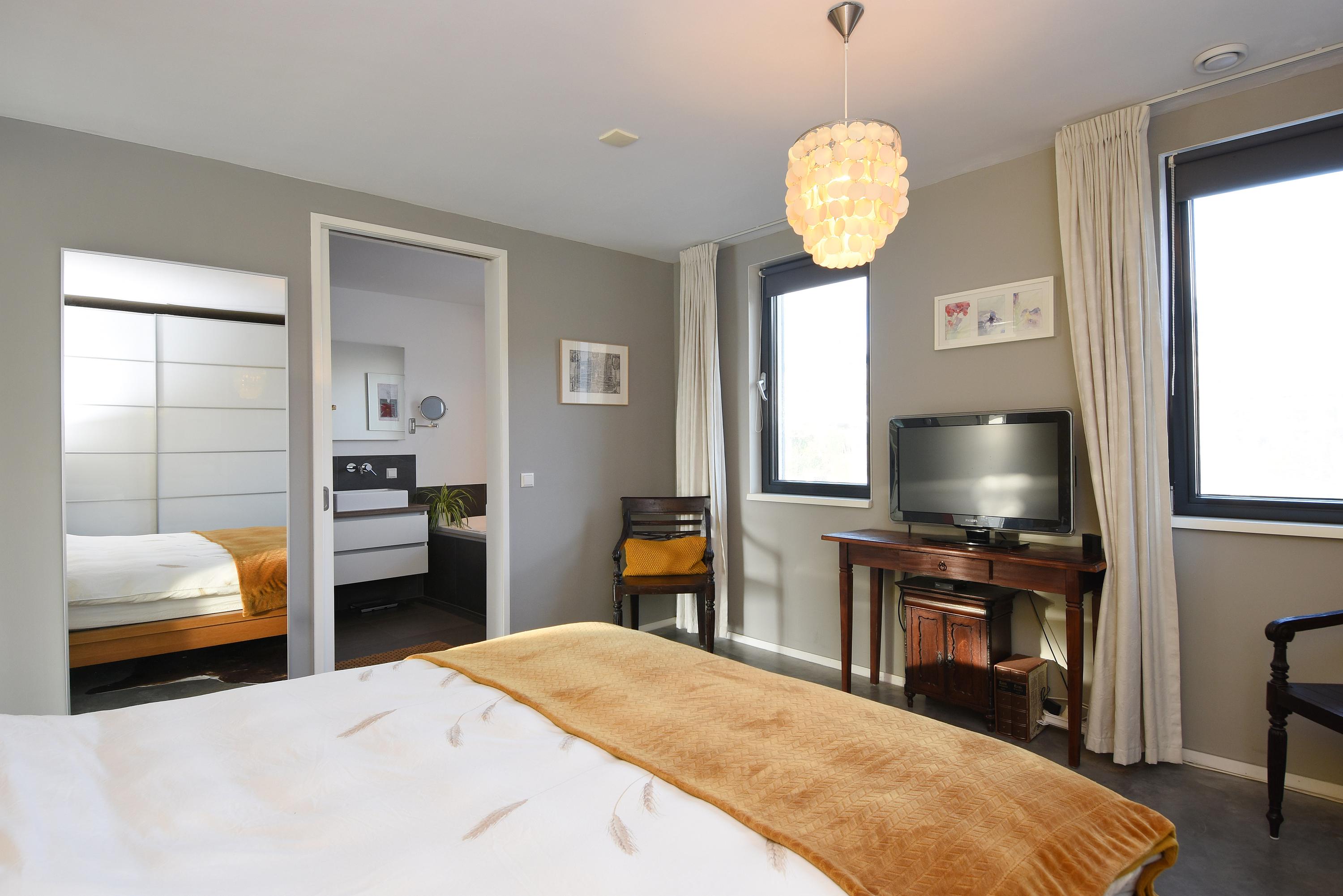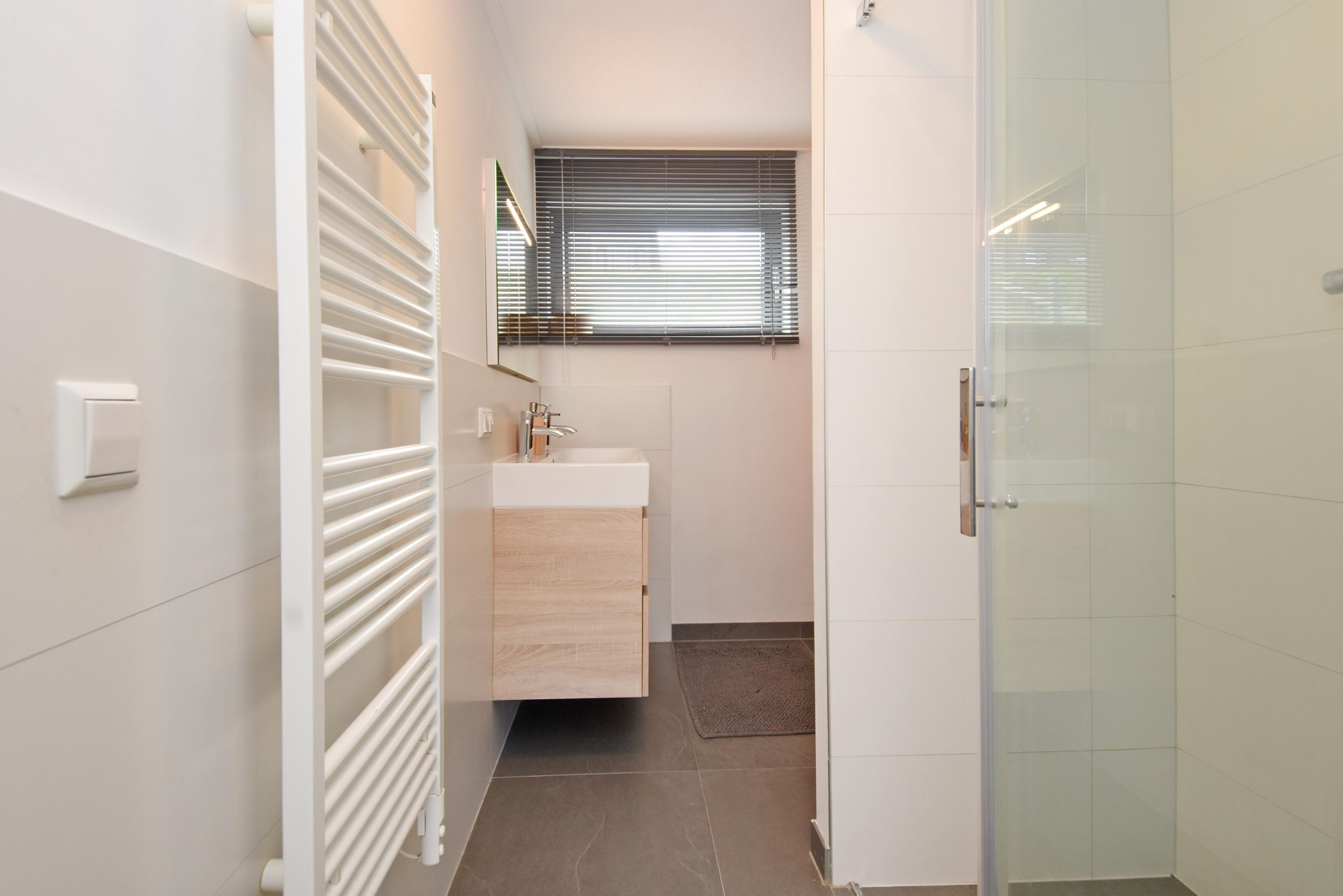 The hallway provides access to a utility room with space for a washing machine, dryer, freezer, etc., and to a luxurious toilet (wall-mounted) with washbasin. From here you also enter the master bedroom with an ensuite bathroom featuring a beautiful walk-in shower, bathtub and double washbasin with cabinet.