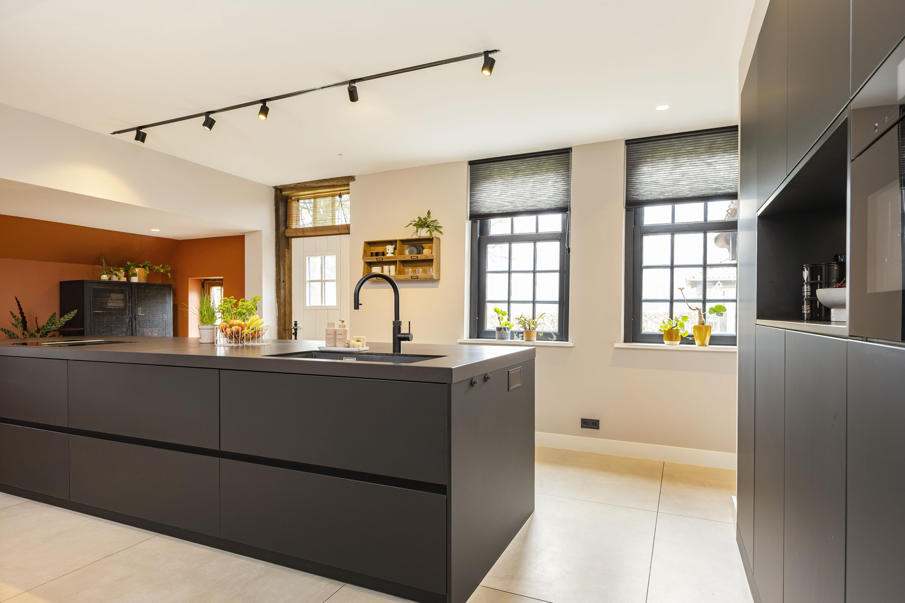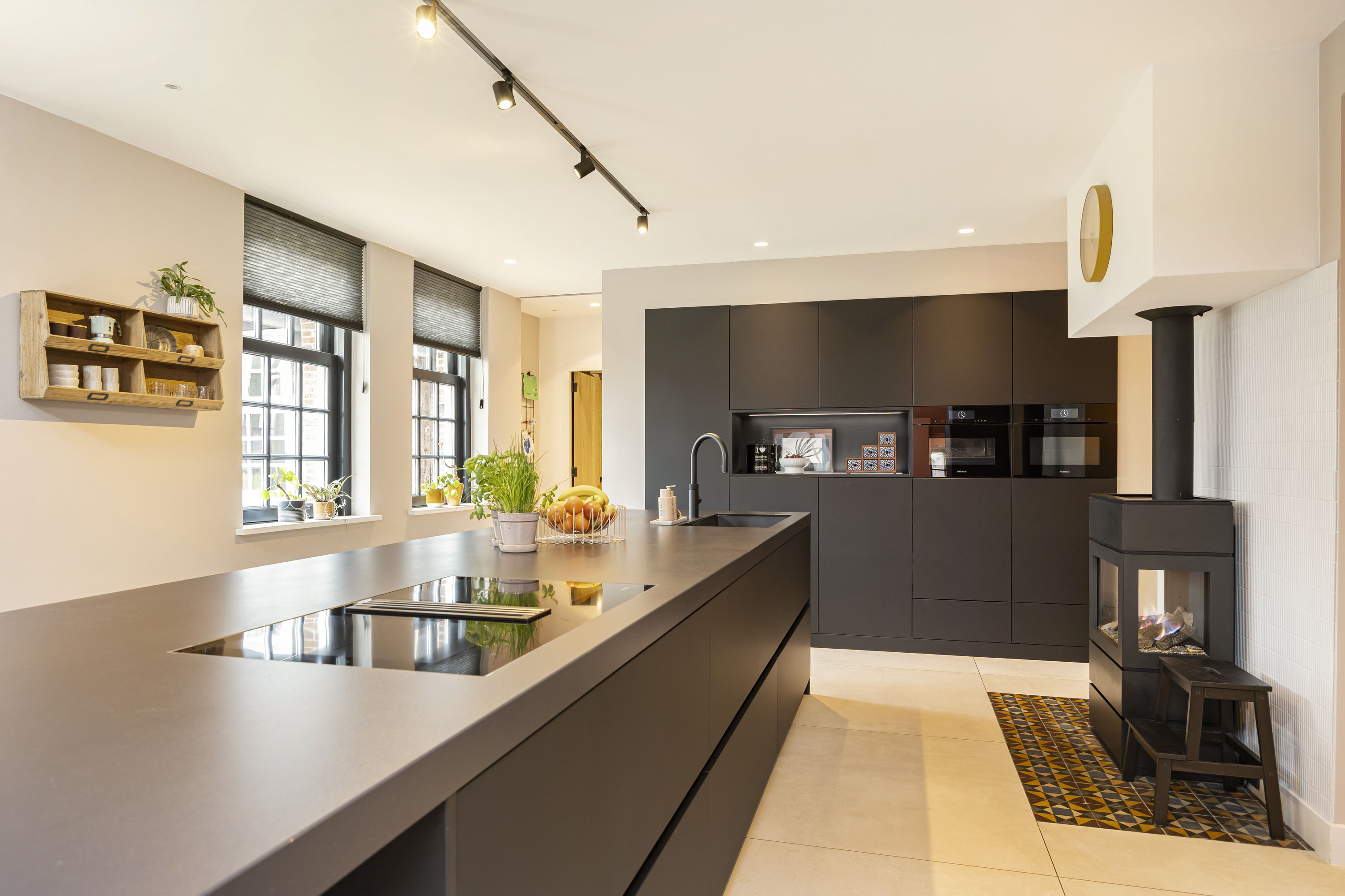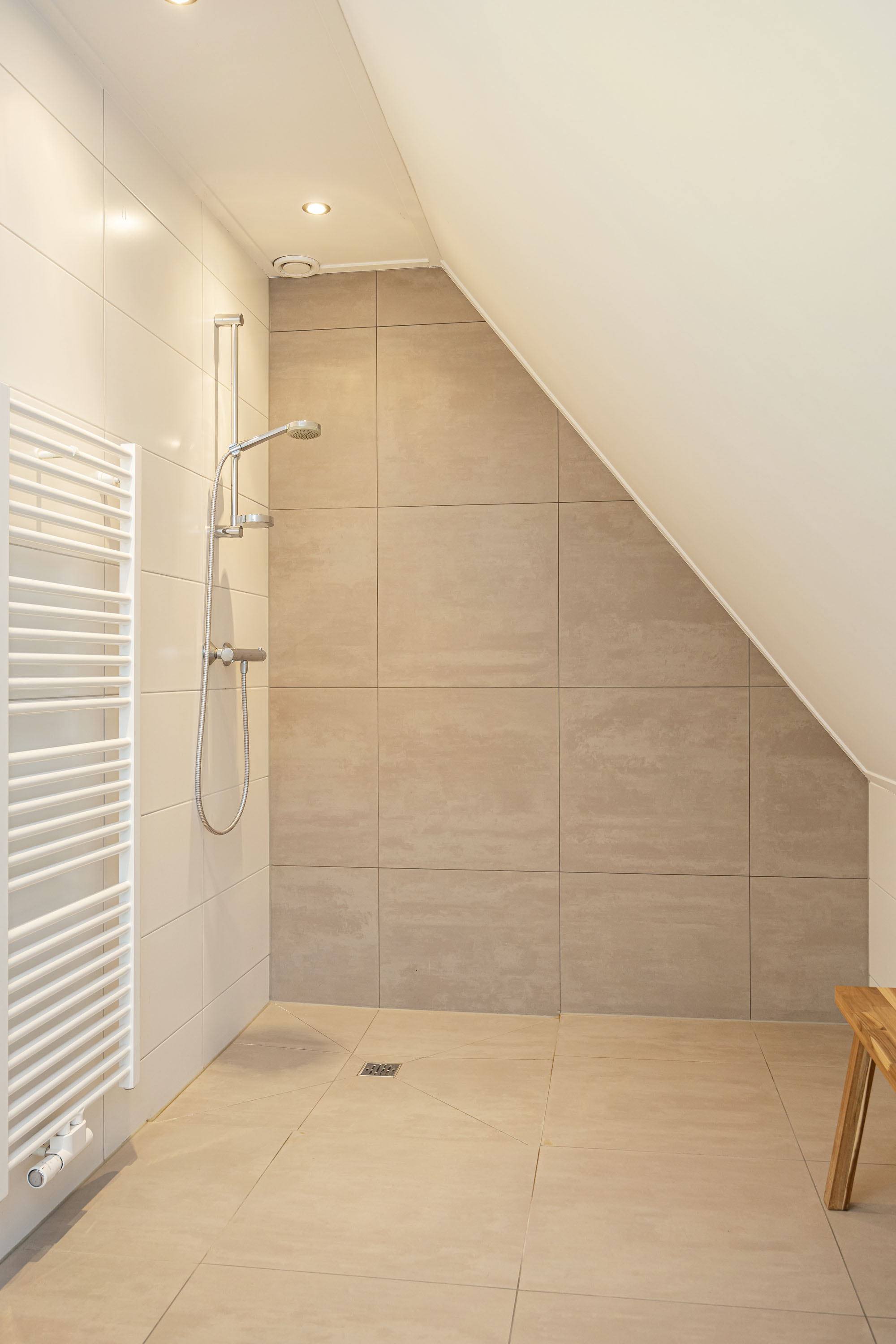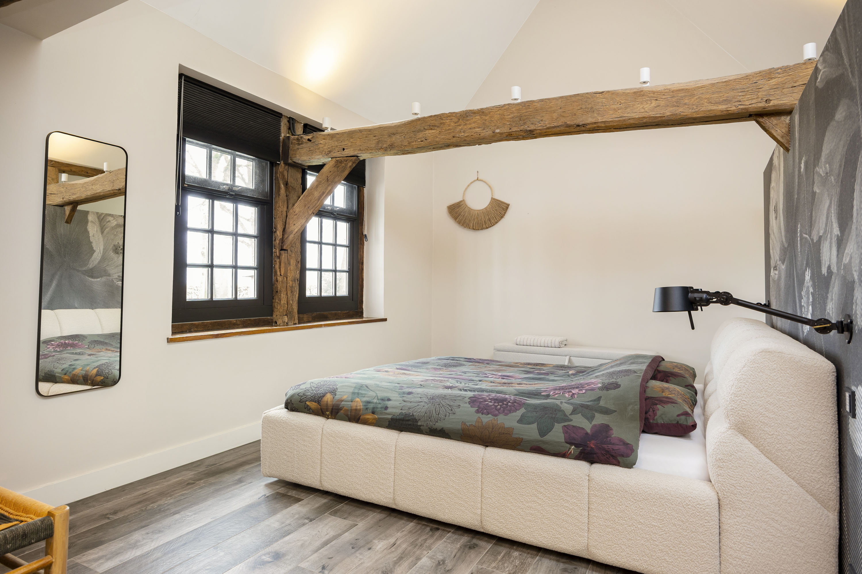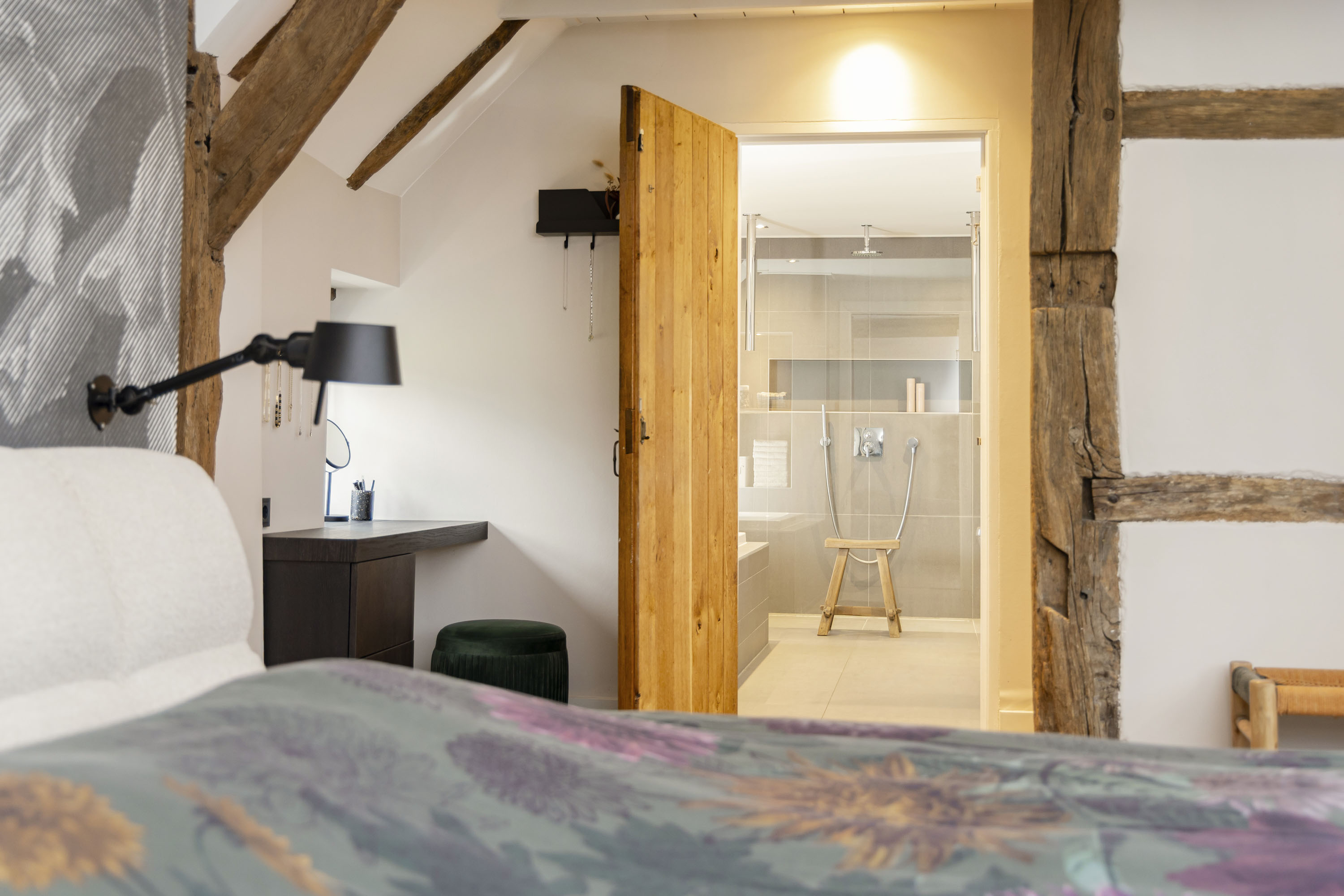 The ground floor includes a spacious modern kitchen, a living room divided into a dining and sitting area by a gas fireplace, a children’s play corner, a fitness room, a utility room, several storage rooms and—last but not least—a beautiful bedroom with a luxurious ensuite bathroom. At the front of the farmhouse, you will find the traditional “onderschoer”, a small covered and intimate terrace.
