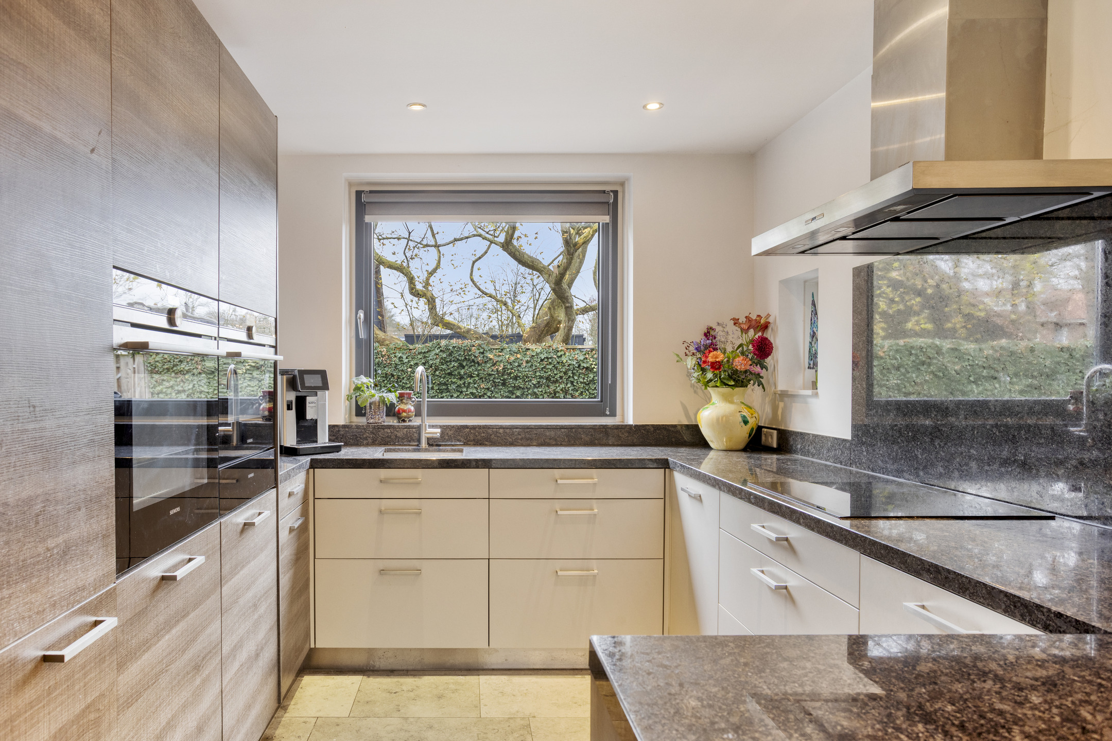 Via de hal kom je in de eetkamer, een lichte en uitnodigende ruimte dankzij de grote schuifpui. De eetkamer is voorzien van een houtkachel. Hier bevindt zich ook de trapopgang naar de eerste verdieping. Vanuit de eetkamer loop je door naar de woonkamer en de keuken. De woonkamer is ook voorzien van een sfeervolle houtkachel. De dichte keuken heeft een speels effect dank zij de bar aan het keukenblad. De keuken is uitgerust met diverse inbouwapparatuur, waaronder een 4-pits inductiekookplaat met afzuigkap, oven, koelkast, vaatwasser, stoomoven, warmhoudlade en een keukenboiler.