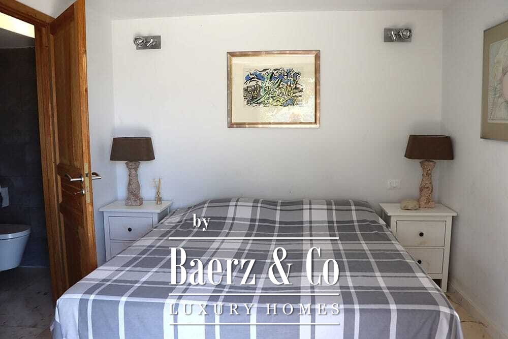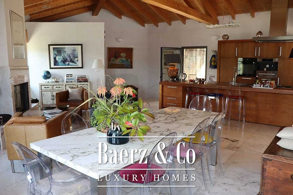 Within its two floors, the villa offers four bedrooms and four bathrooms. Three ground floor bedrooms, each with French doors, open to a lower terrace and mountain vistas. The master suite features a large bath, separate shower, twin marble basins, and designer fittings, defining a sense of sanctuary. The studio bedroom, with private entrance, enhances flexibility for guests or work. Upstairs, a beamed living room with fireplace adjoins a walnut and stainless steel kitchen equipped with premium Miele appliances. High glass doors lead to a lounge with a second fireplace and access to terraces finished with granite tables and Philippe Starck chairs.