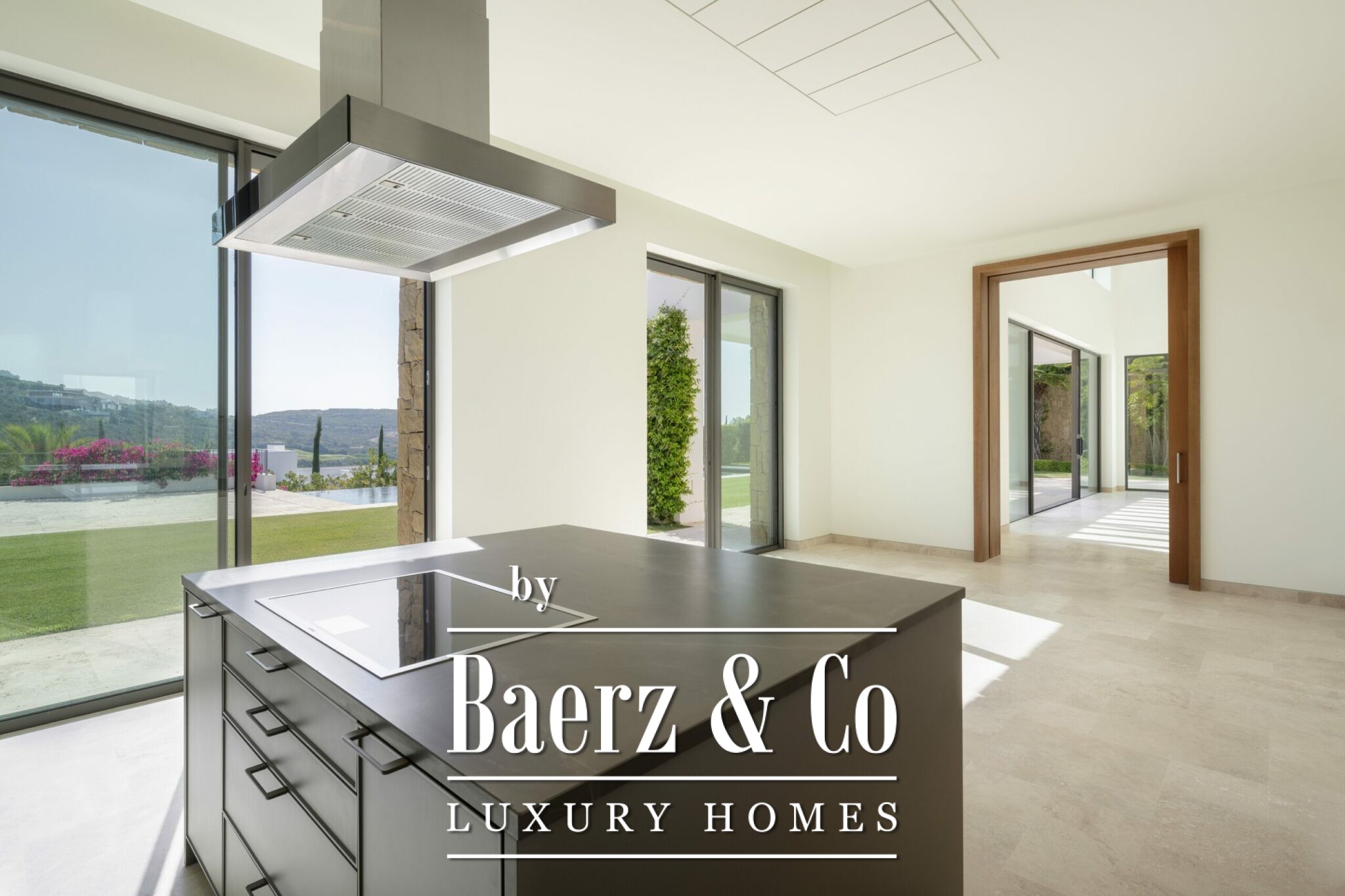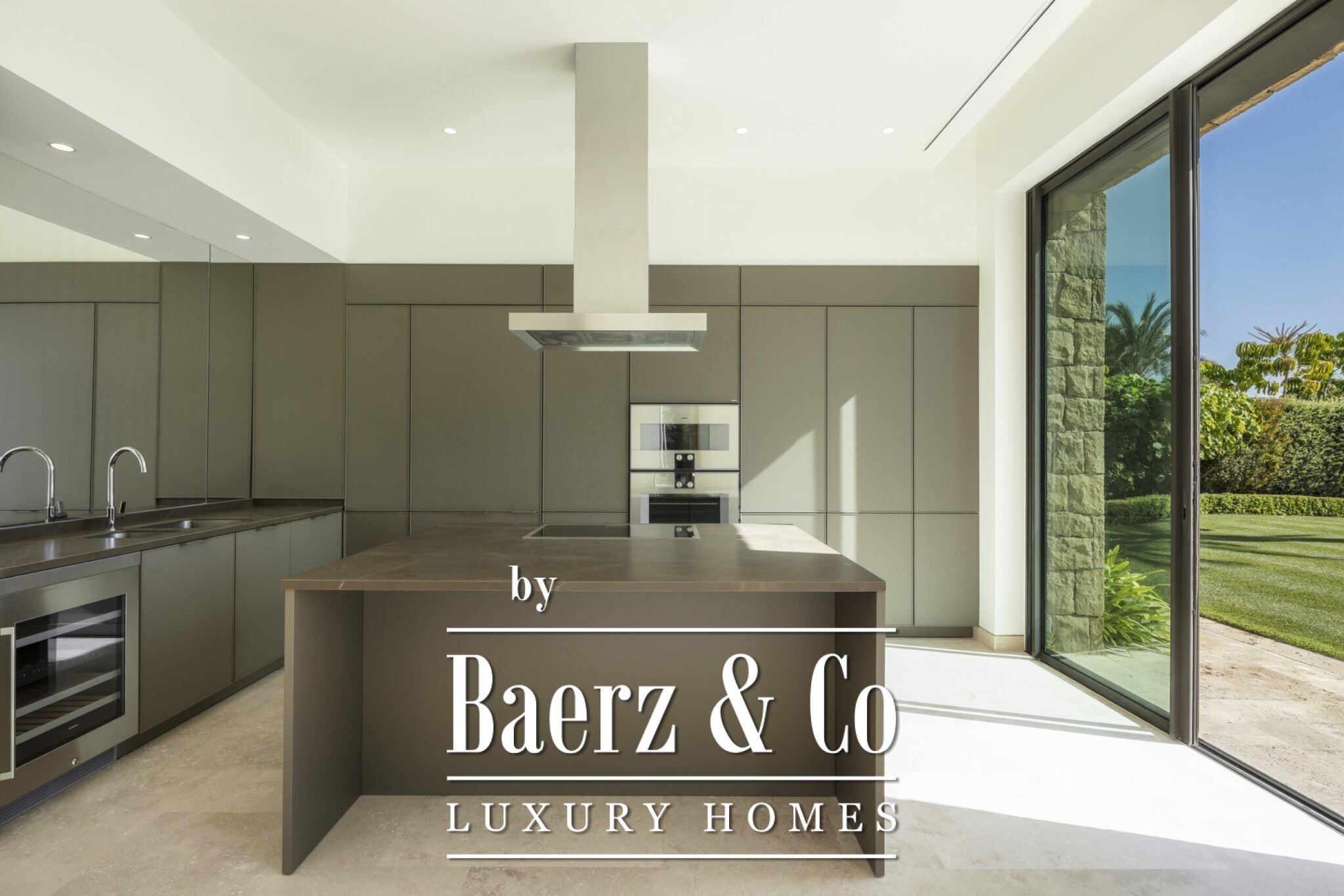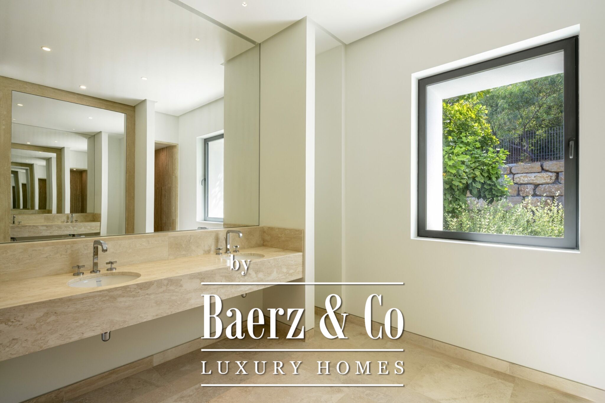 Inside, 655 m² of living space unfolds over two levels. The ground floor blends living, dining, and kitchen zones under soaring ceilings and natural light. State-of-the-art Gaggenau appliances complement the modern kitchen. Two ground-level bedrooms connect directly to the gardens, ideal for guests or family seeking ease of access and privacy. Upstairs, each bedroom features its own private bathroom, connected by a walkway overlooking the main living space, lending an airy, open rhythm to the home.