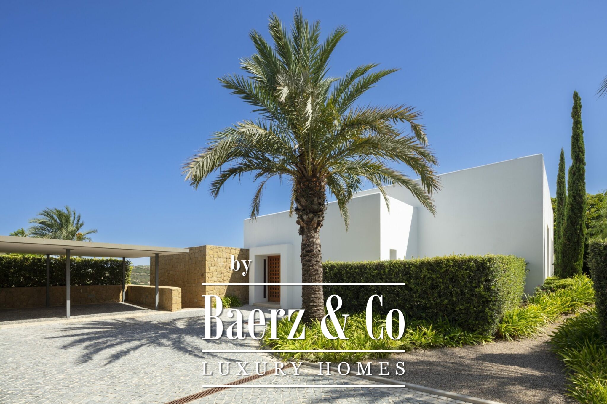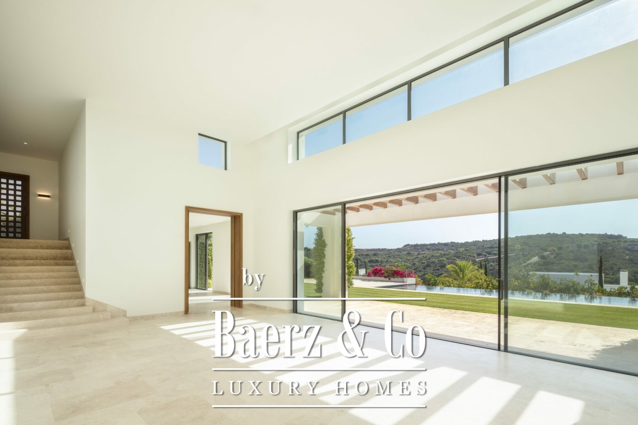 Villa Estepona with Golf and Mountain Views invites quiet grandeur within the heart of a celebrated golf resort. This five-bedroom villa occupies a 1,690 m² plot, its white Ibizan façade softened by Mediterranean stones. A landscape of manicured gardens with palms and vivid floral shrubs sets a gracious tone.