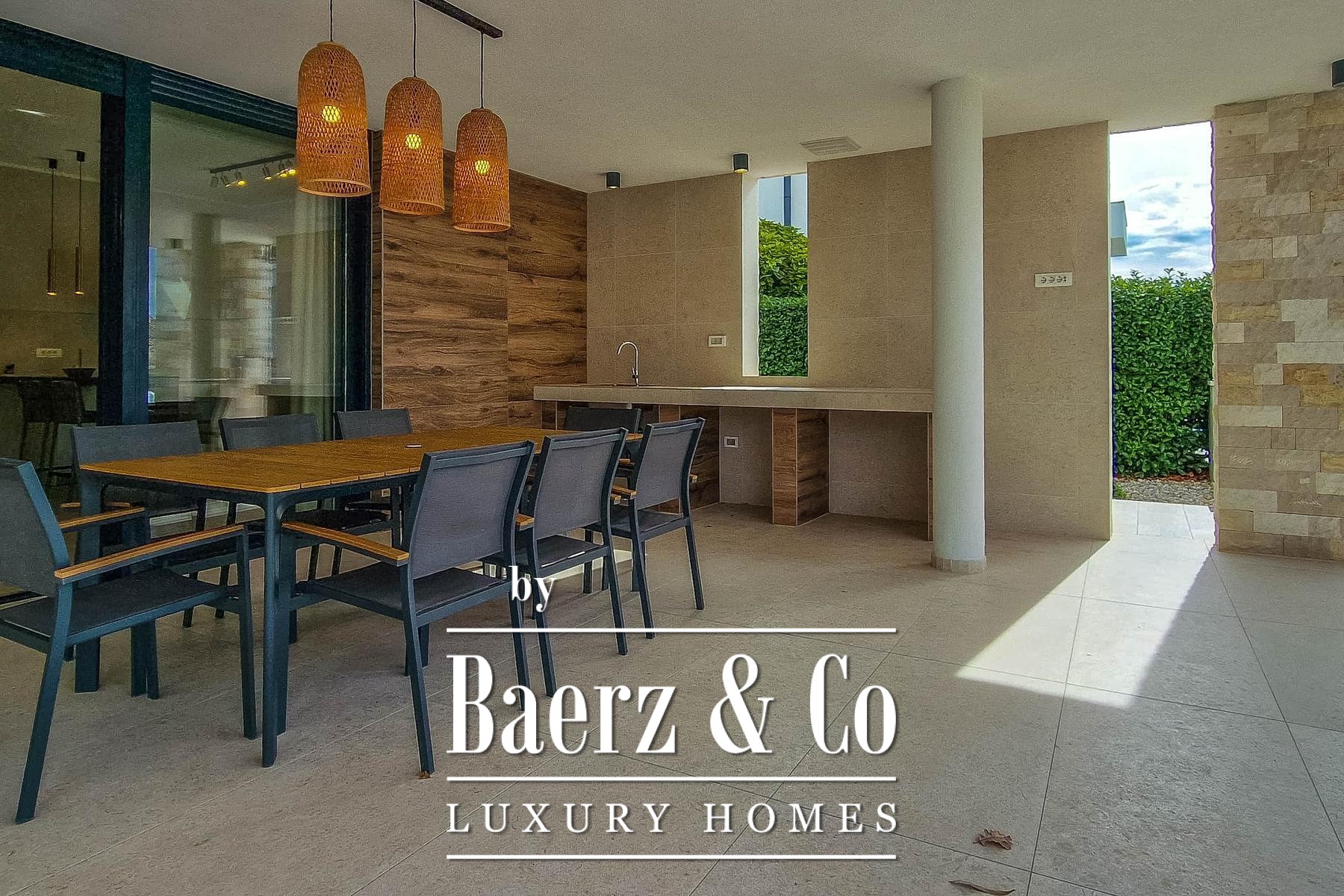 The property’s living area extends across 341 m², organized for both connection and retreat. The ground floor unfolds in an open-plan rhythm, encompassing a kitchen, dining area, and living room that flows elegantly onto a covered terrace. Floor-to-ceiling glass connects indoor and outdoor spaces, leading to a 42 m² swimming pool and sunbathing area, while a summer kitchen enhances the terrace’s convivial spirit. A bedroom with en suite and a technical room provide flexibility and ease.