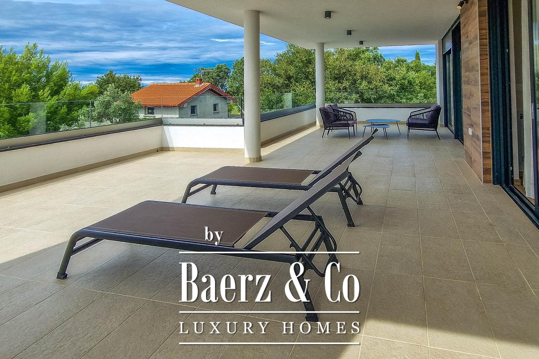 Ascending to the first floor, three further bedrooms each feature private bathrooms and open onto a spacious terrace with panoramic vistas to the sea and Brijuni Islands. The villa is delivered fully furnished with quality materials and appliances, poised for immediate occupation. Offering the rare proximity of the Adriatic and thoughtful spatial planning, this luxury villa for sale in Fažana reflects the understated pleasures of Istrian living.