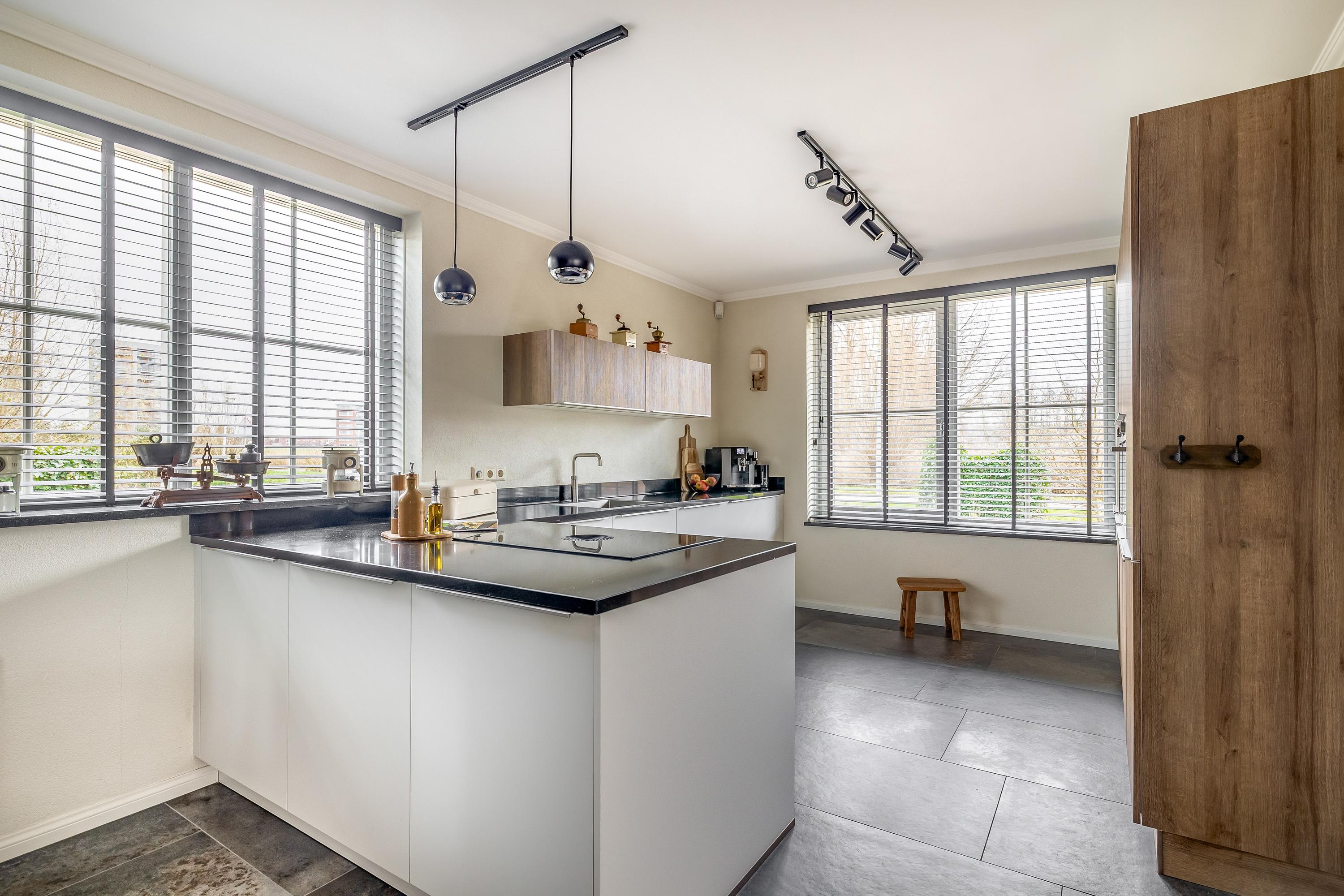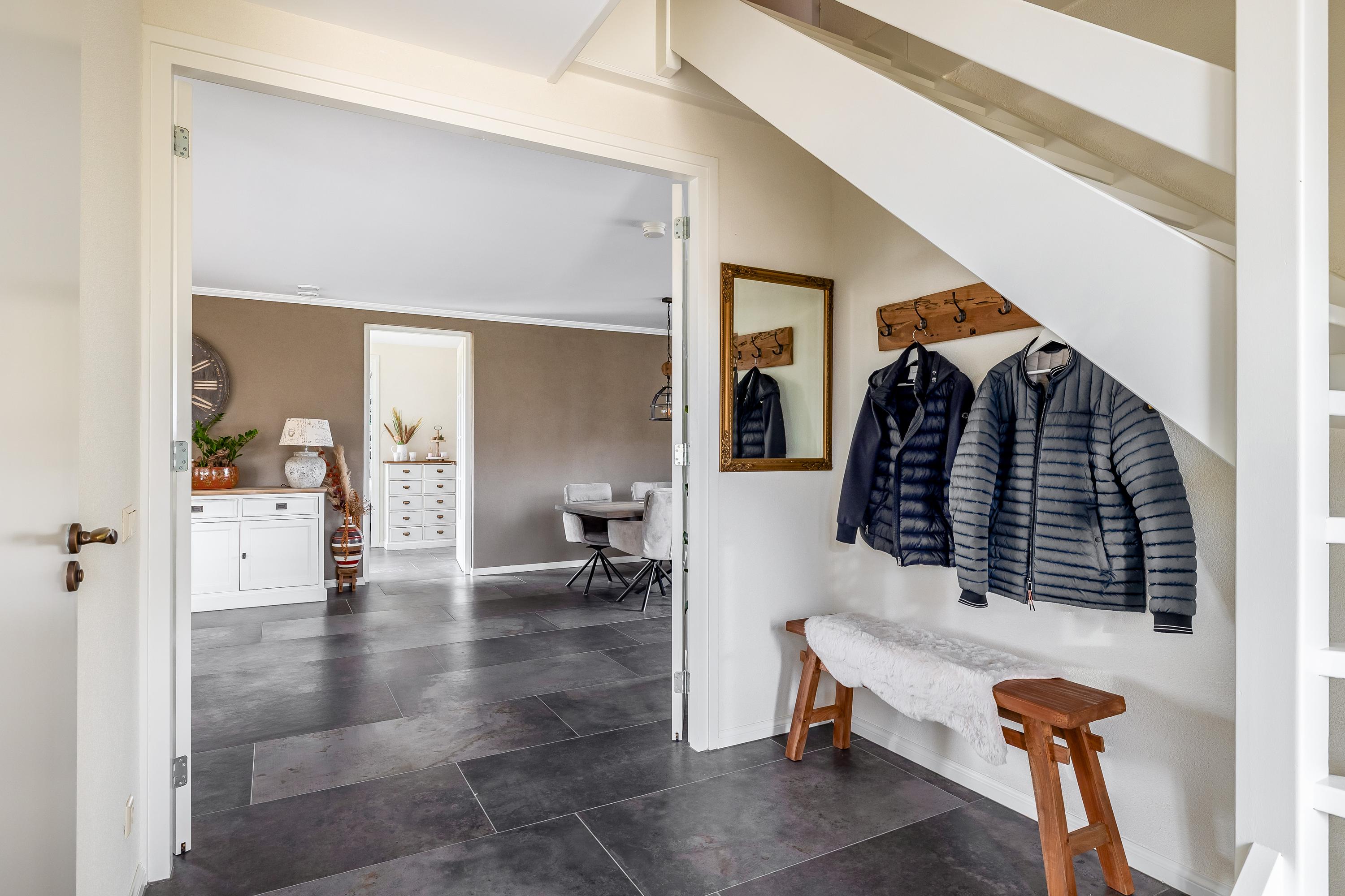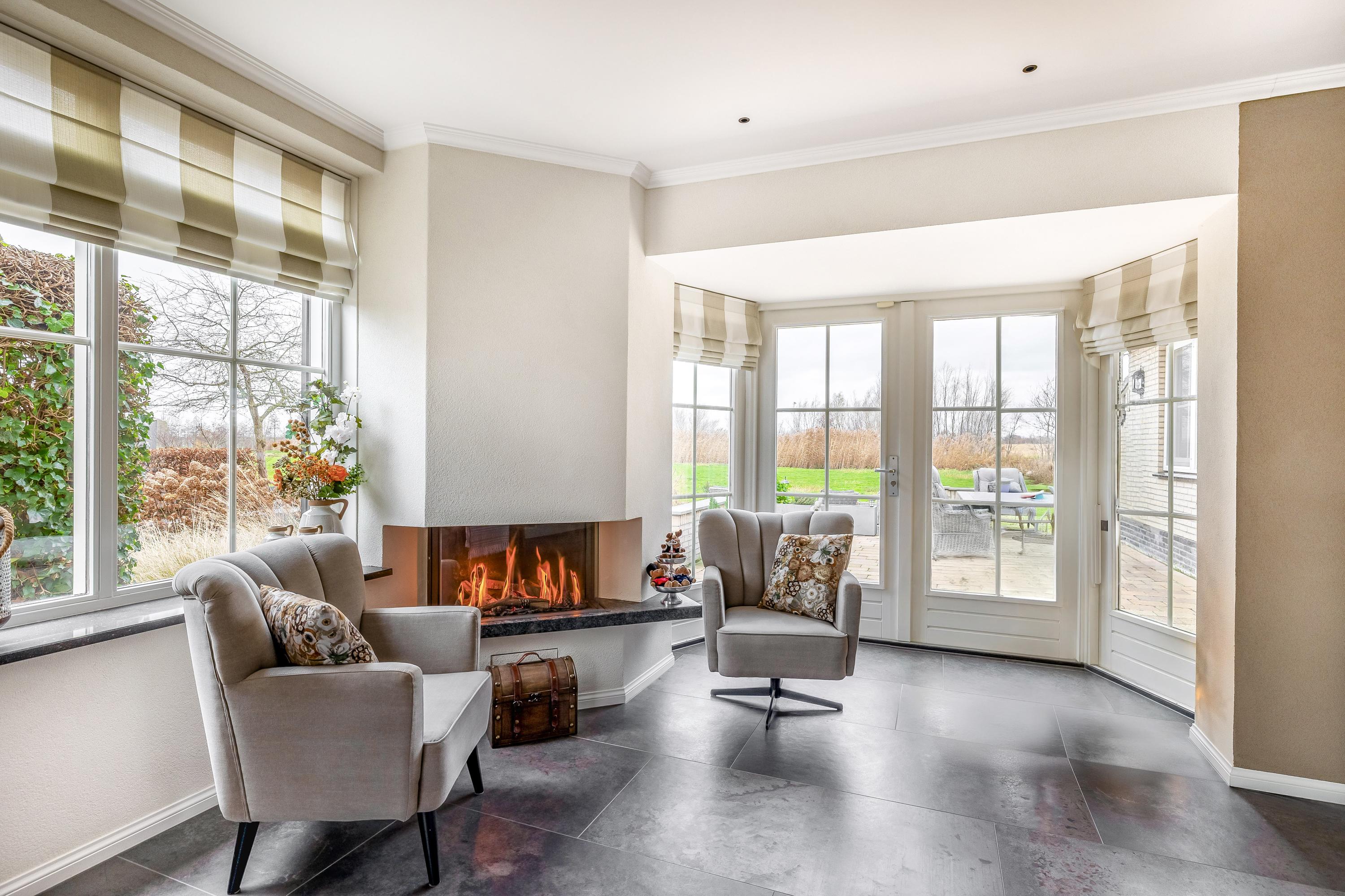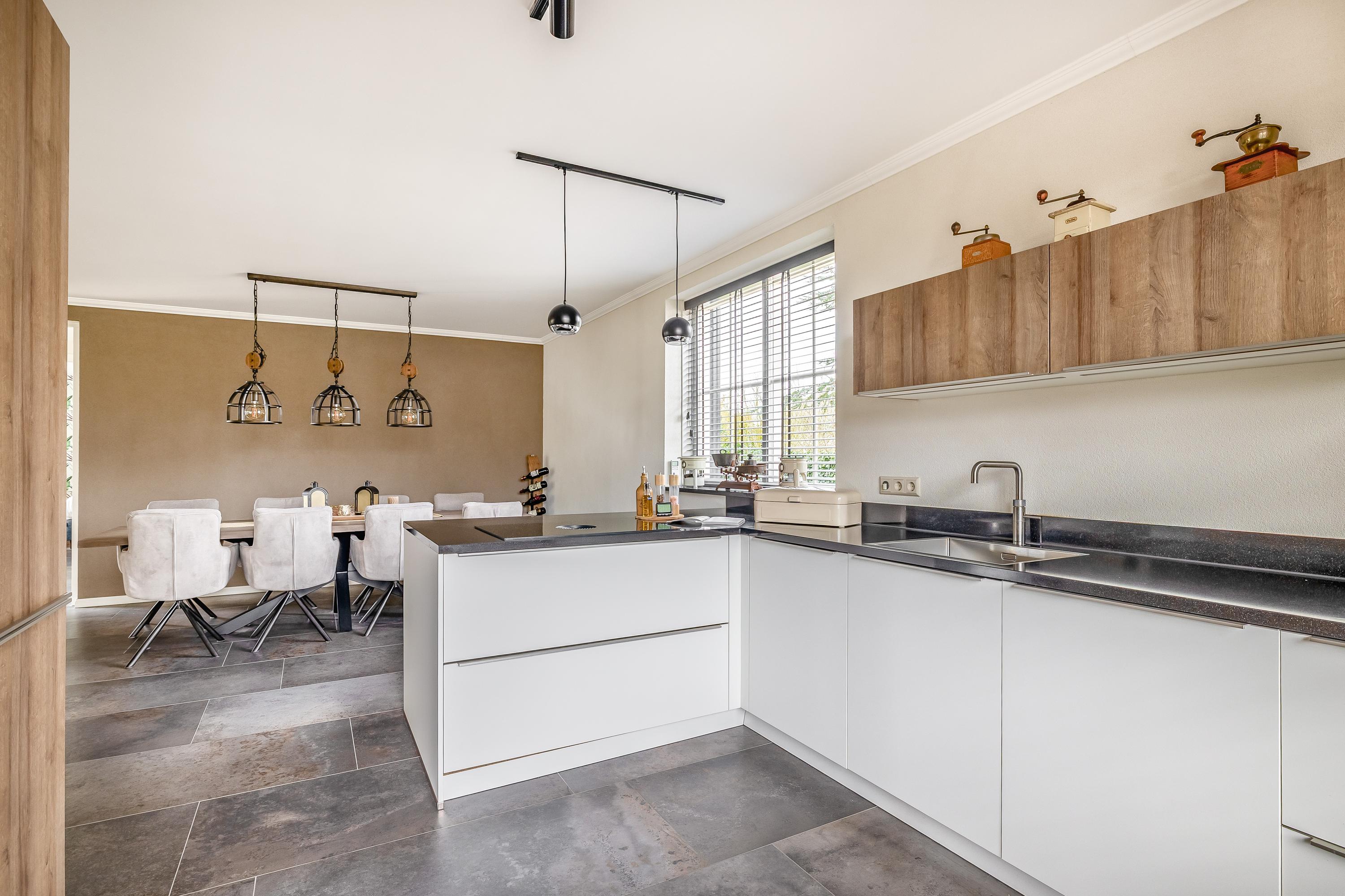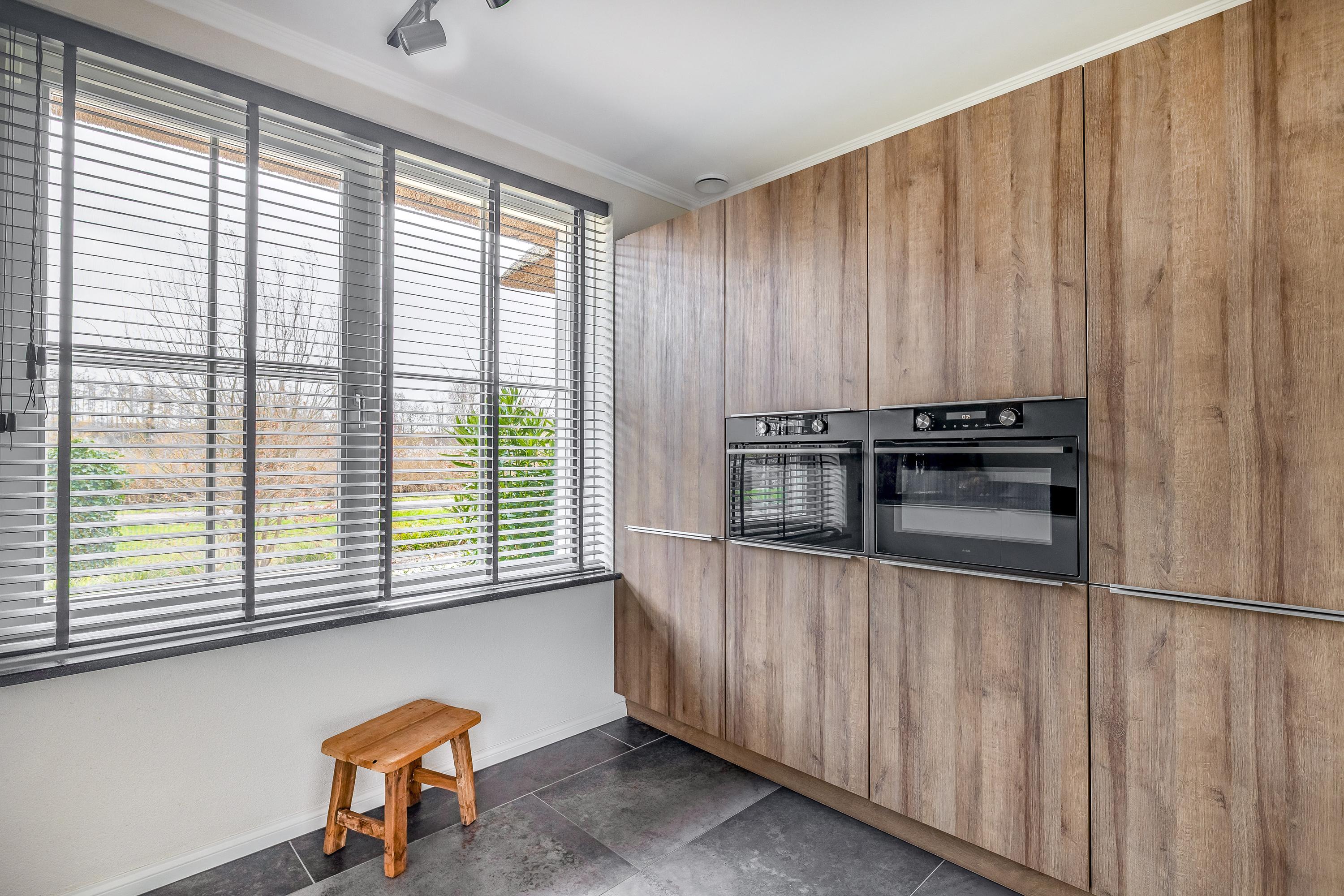 Through the stylish entrance you enter a spacious hallway with a renovated floating toilet and washbasin. Double doors lead to the very generous living area, which was completely renovated in 2022. The living space consists of a luxury open-plan kitchen, dining area and sitting area with bay window and French doors opening onto the terrace. The modern kitchen is fully equipped: an induction hob with Bora extraction, two identical combination ovens, a large refrigerator and freezer, dishwasher, Quooker and a composite worktop. In the utility room you will find connections for a washing machine and dryer, as well as a door to the outside. Thanks to the large windows and the bay window with French doors, daylight floods in abundantly. The atmospheric gas fireplace and recessed spotlights complete the picture. Also on the ground floor is a spacious bedroom with custom-made wardrobes and a luxury en-suite bathroom (2022) with walk-in shower, floating toilet, washbasin unit and designer radiator. This makes single-level living possible without sacrificing comfort.